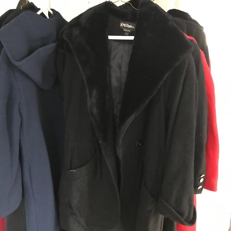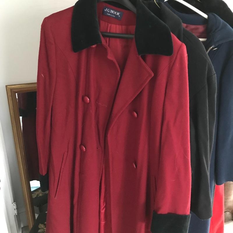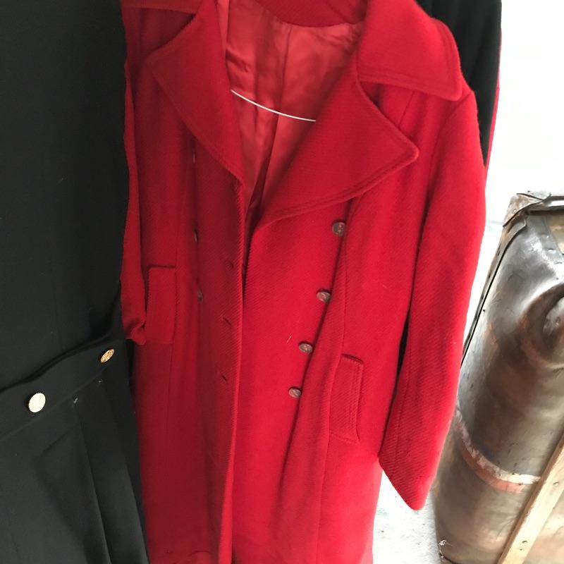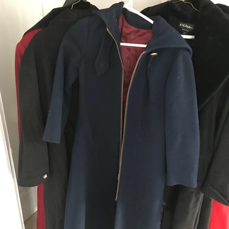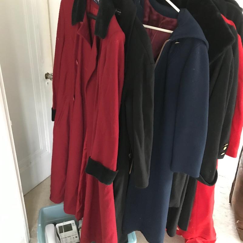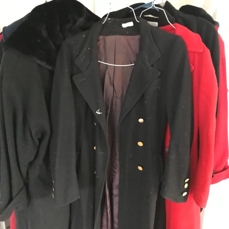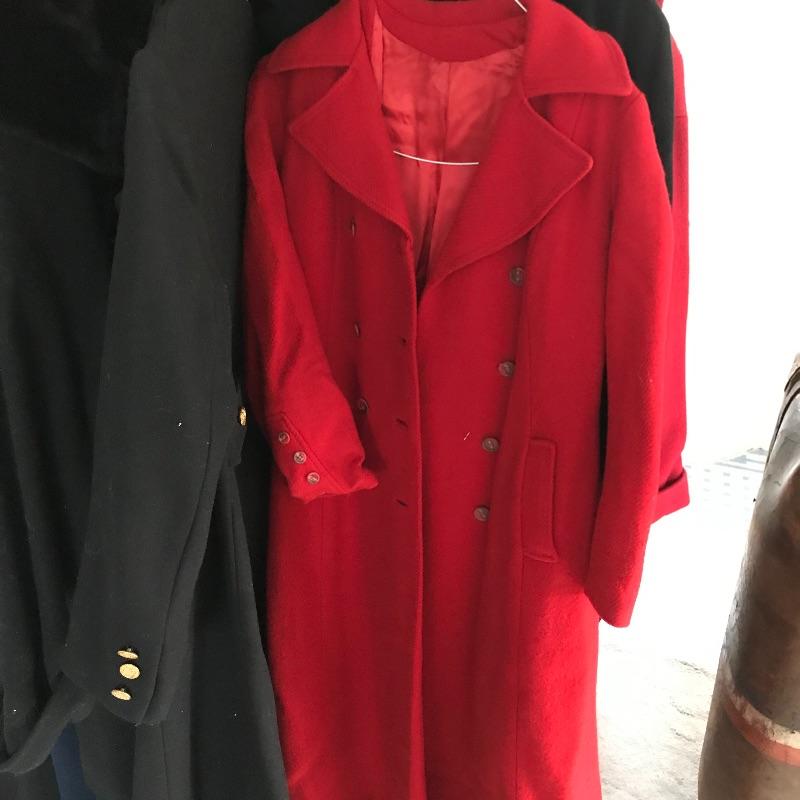 Lot includes nine gorgeous women’s coats, all of which appear to be wool. Most need to be laundered but seem to be in good shape with no visible moth holes or stains. Bright red coat needs to be hemmed at the bottom. Sizes range, but all seem to be medium to large. These jackets or heavy and well made. Local pickup only.