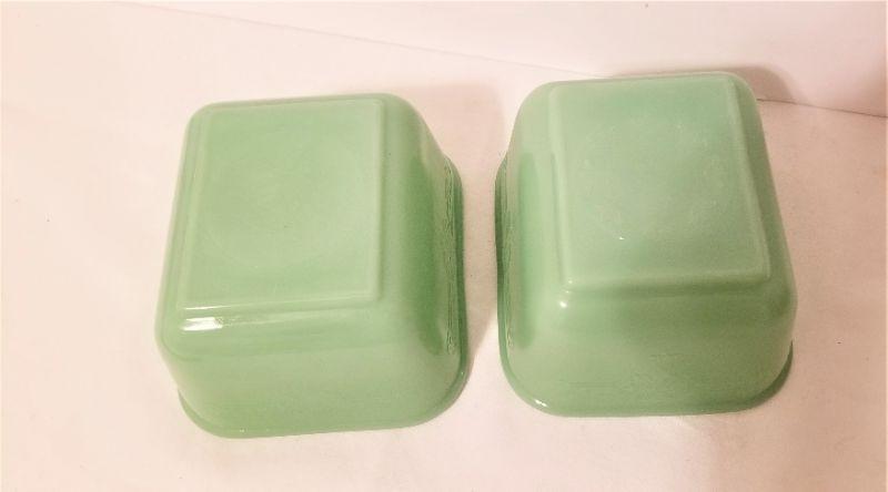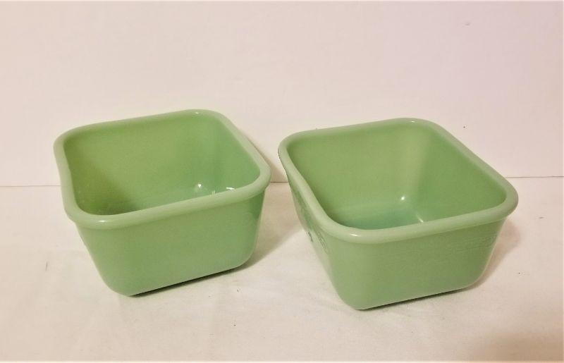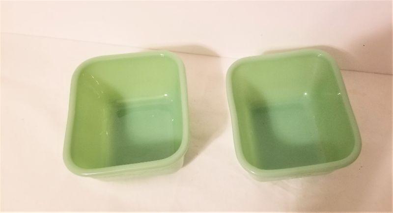 Two vintage Jadite refrigerator dishes - no lids. Good condition. Each measures about 5" x 4.5"