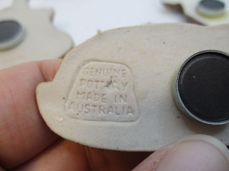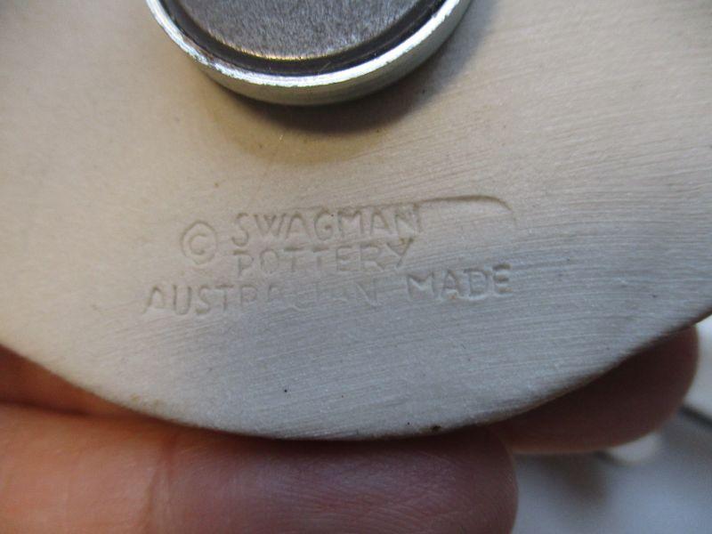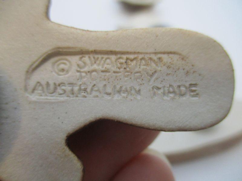 The circular one is plastic, the others are all made from clay (pottery). Two are marked "Swagman Pottery". In excellent condition.