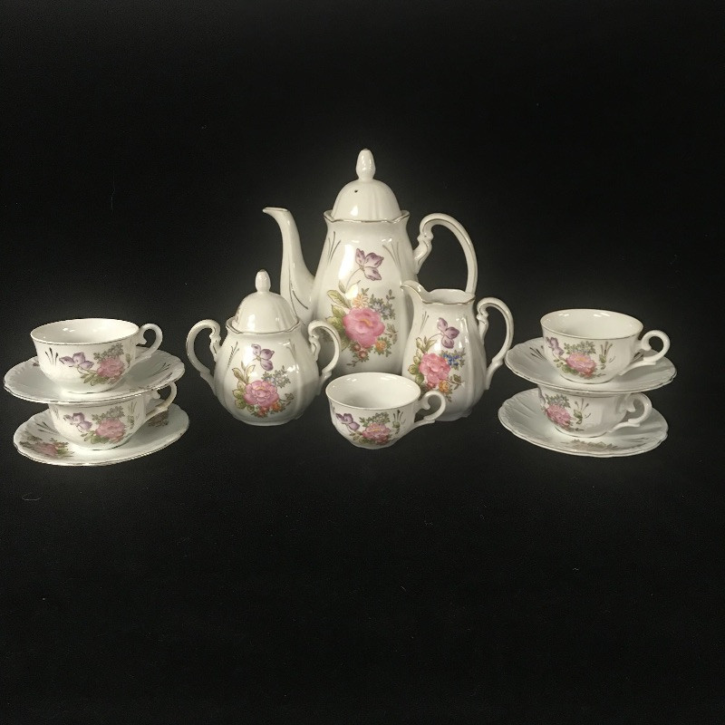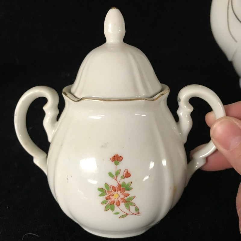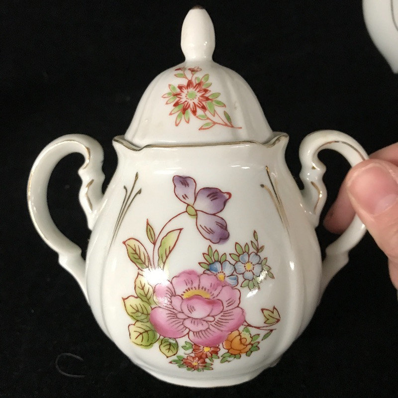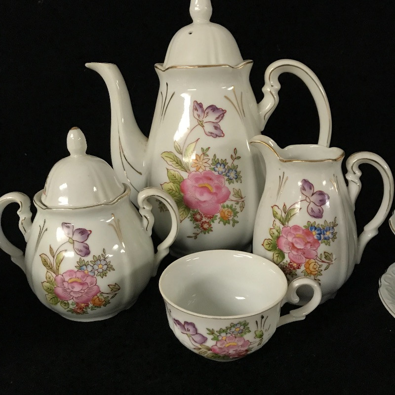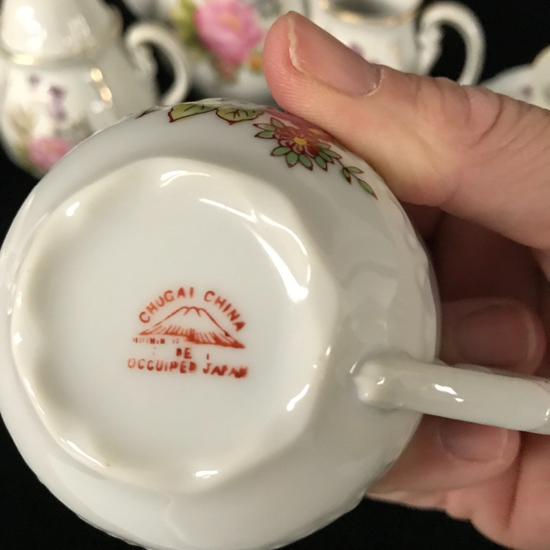Chugai China from occupied Japan consists of Tea Pot, creamer, sugar and four cups and saucers. One extra cup or one saucer missing. Gold edging is worn but no chips. Tea pot measures 8.5” tall. Shipping available.