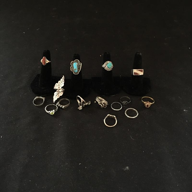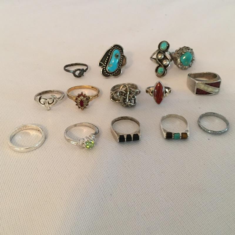 This beautiful collection has thirteen rings that include three turquoise-like, one dark amber colored stone marked sterling 14gf, a band marked sterling and a assortment of plain and rings with various stones. You will have a ring for every finger with a few extras.