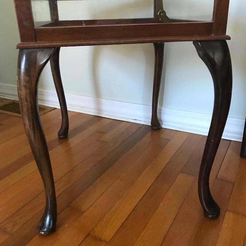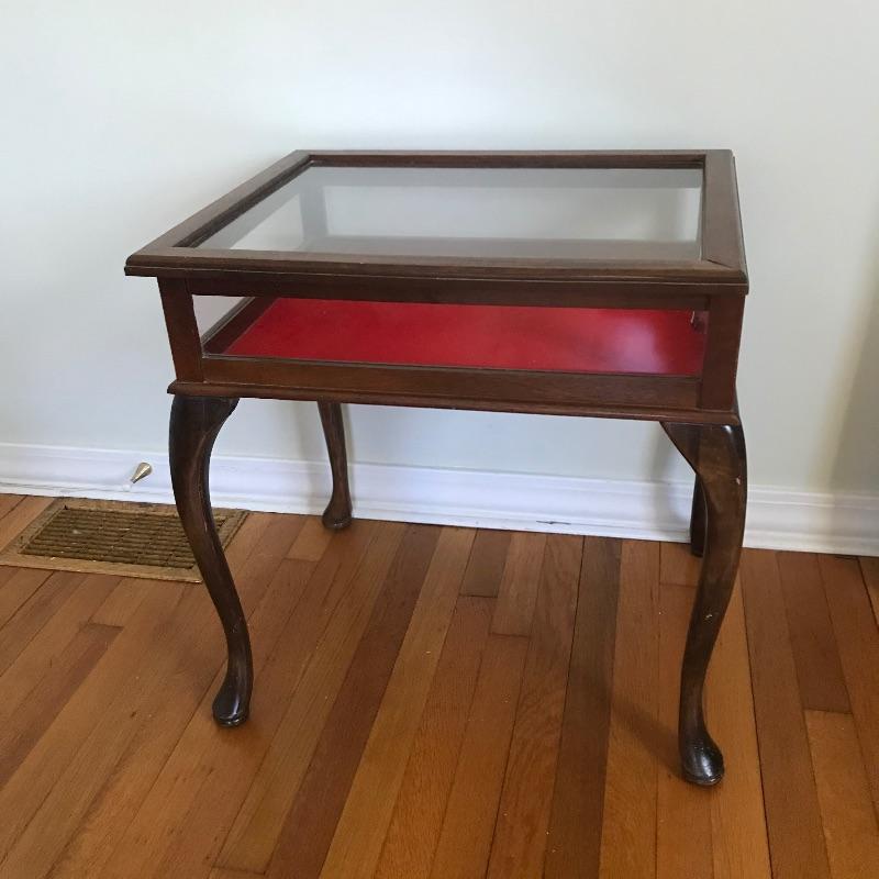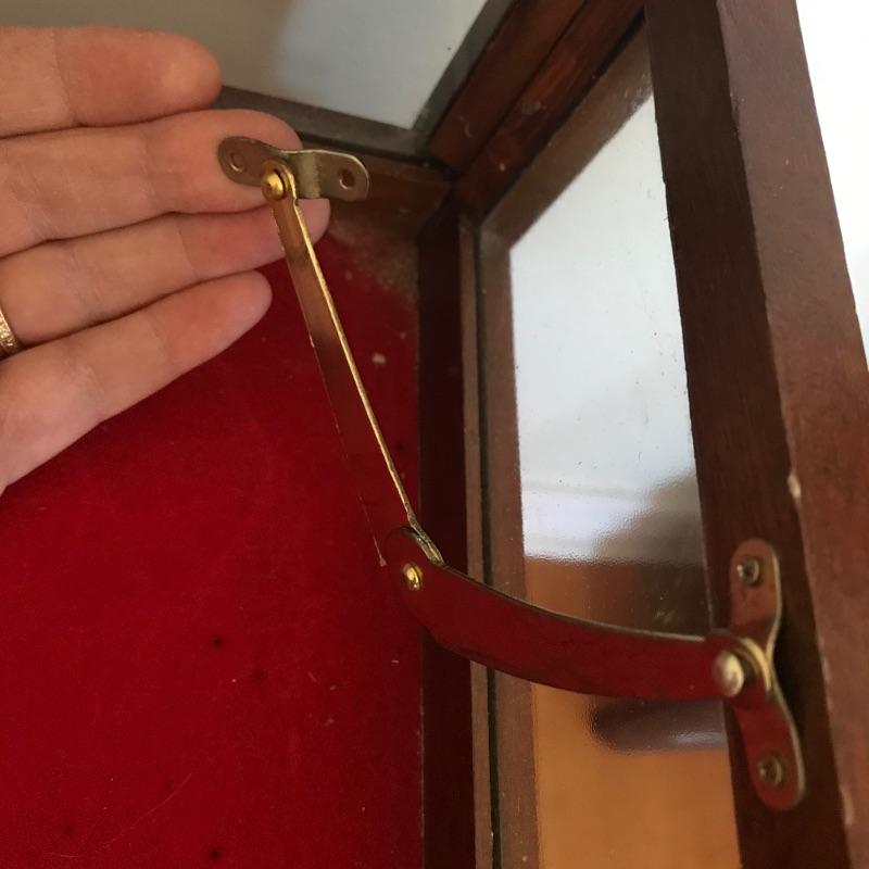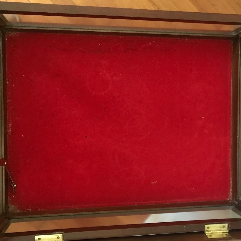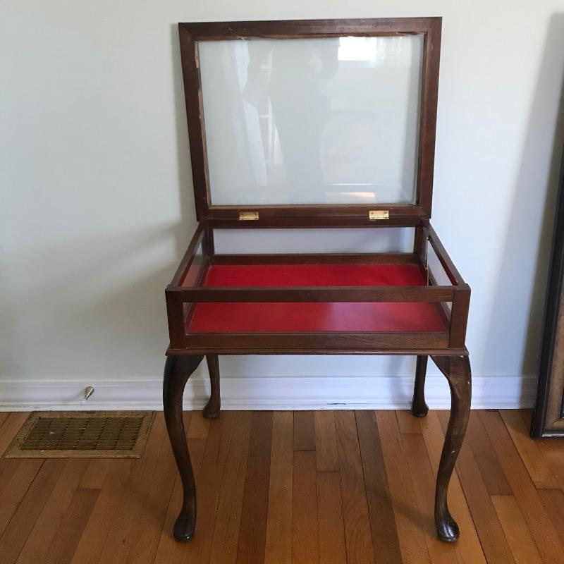 Attractive red felt lined vintage wooden display case. Piece has some work needed, but is a real find! The rear legs are both a little wobbly, just need some minor stabilization. The wooden lining the glass top has chipped away in some spots, but glass appears to be securely in place. The hinge operating the opening and closing has come loose on one side and either needs to be re-attached or replaced. Glass and wood are in over nice condition, piece measures approximately 23.5” x 18.5” x 24”. See photos. No shipping.