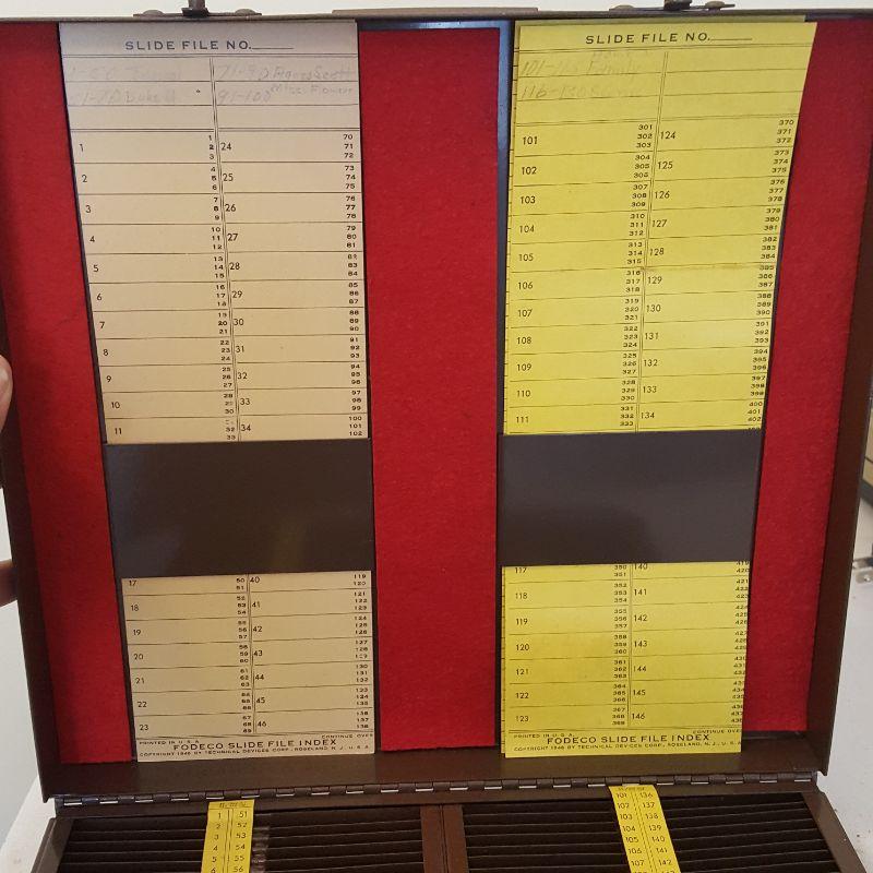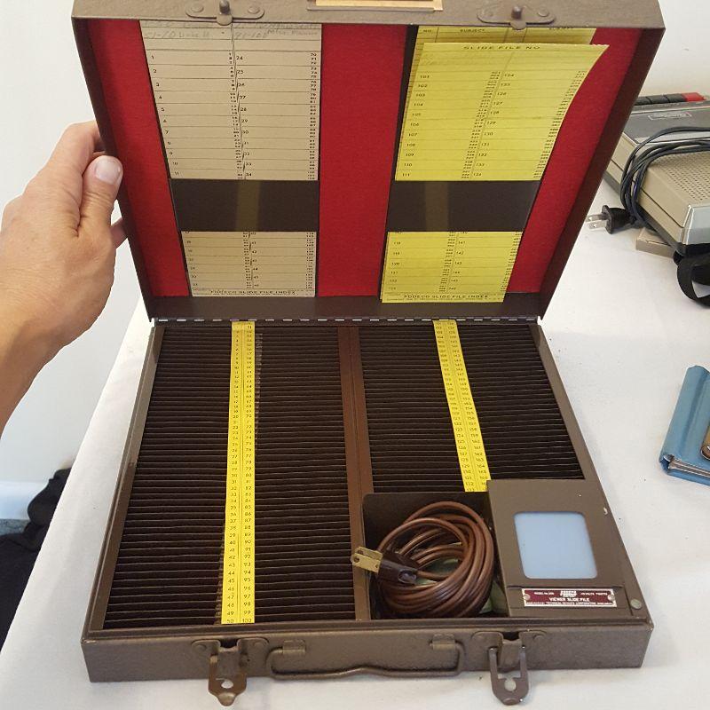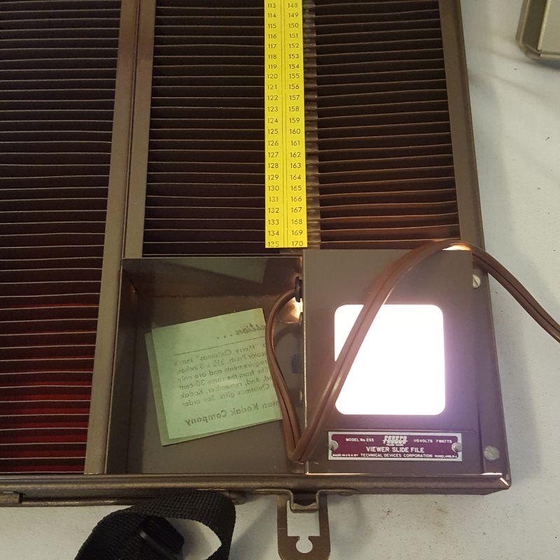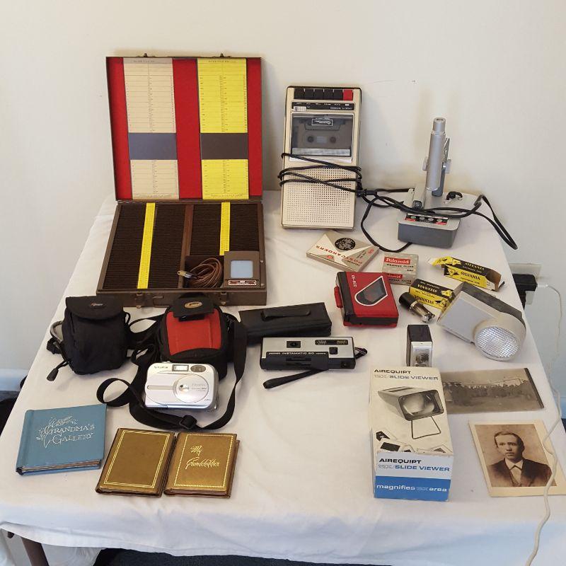 That's a lot of vintage media! Starting with a GSS microscope that turns on when plugged in! Here is a Fodeco slide file index box (11x10.5 in) that holds 170 slides and has a built in viewer that works!. There is an Airequipt 12X slide view in the box, it works great. Also find 3 small photo albums (largest is 4x4”) There is some discoloration on the paper and tears in plastic film, but still in working condition. Next is two antique photos, one of Reverend Walter E Arnold and the other appears to be of a crowd at an event. There is an empty camera case from Lowepro that would fit a 5x3 in. camera. The bag appears to be in great condition. Get your cassette tapes out, because it works! Next we have a Fujifilm FinePix digital camera 2650 with a LowePro camera case. It comes with an extra 16mb picture card. Camera has not been tested. Next is a Nisisin flash for cameras. Details on the back see pictures. Batteries go in on the top. This has not been tested for functionality. Head down memory lane with this Kodak picket instamatic 60 camera with a velvet lined case. A portable cassette tape player is just what you need.! 3 electronic tubes have not been tested.no shipping.