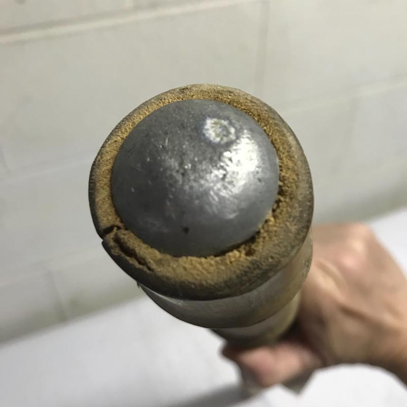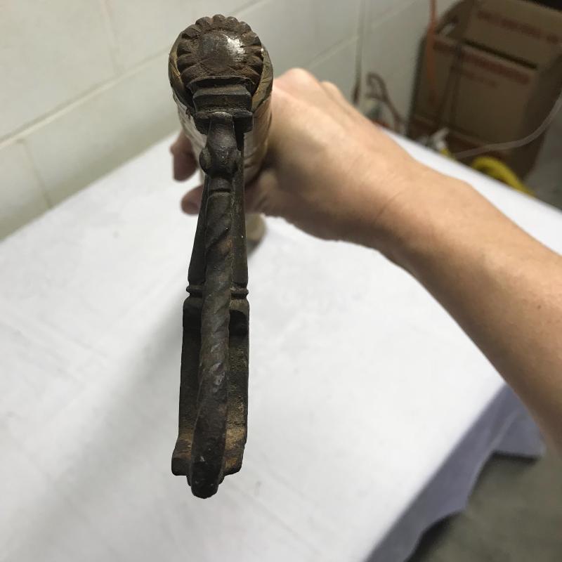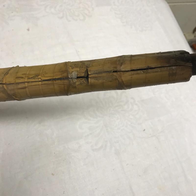 Bamboo walking cane with metal tip and hand forged handle of iron and steel point shaft that goes into bamboo. All kinds of ideas as to what it was used for but no markings or indicators. Some splits in the bamboo and a very snug fit pulling the handle out but a solid pieces that is 32.5” Long. Lot is available for shipping or local pick up in Asheville, NC.