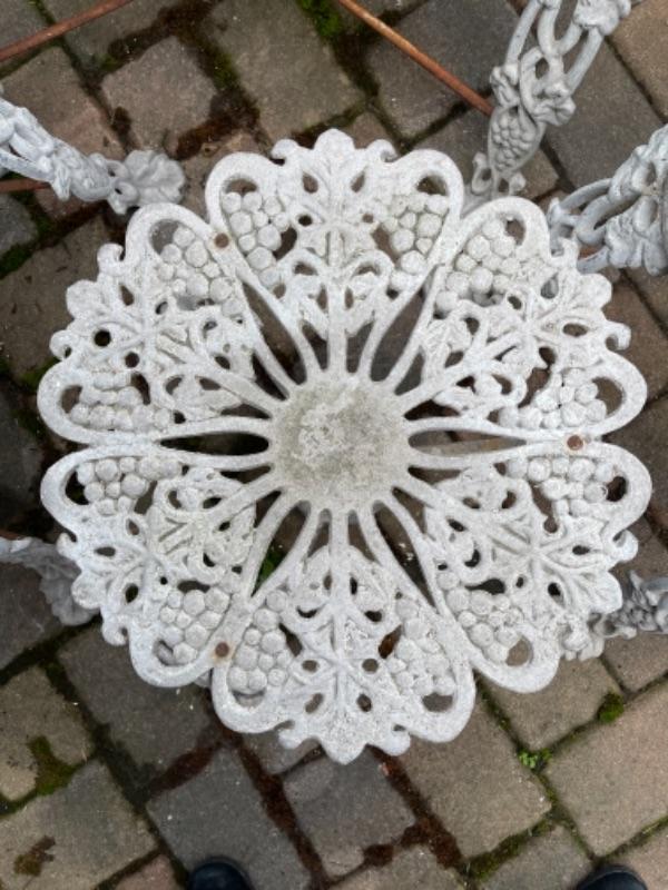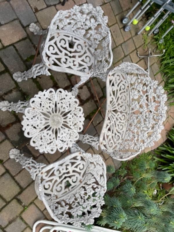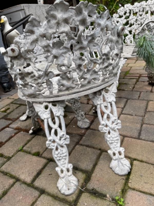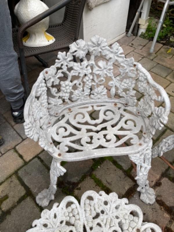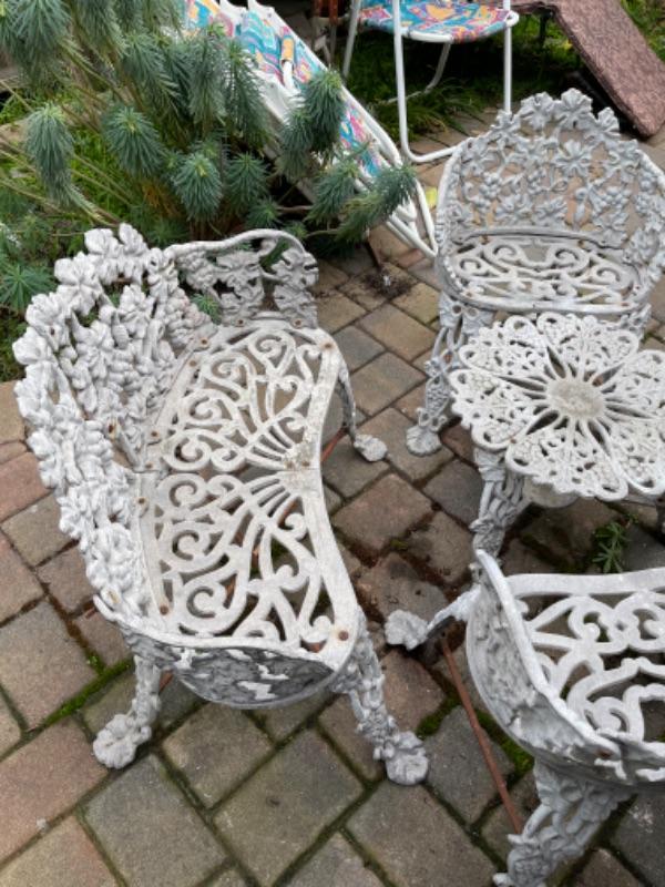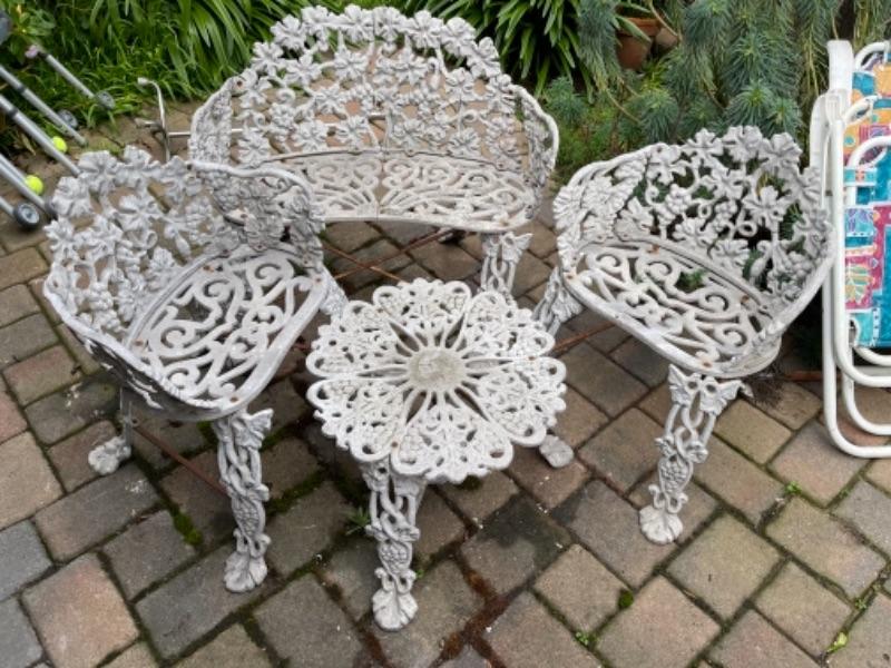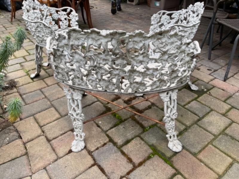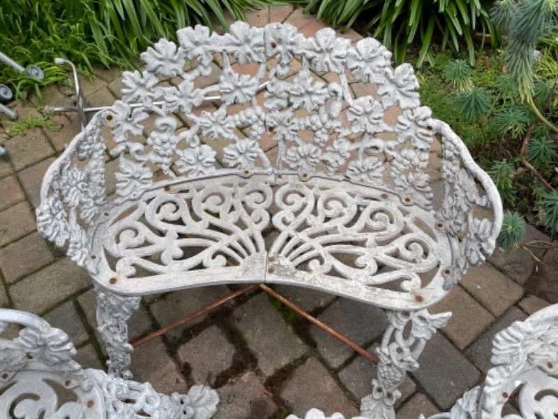 Lot 159. White wrought iron settee with table and two chairs--$125