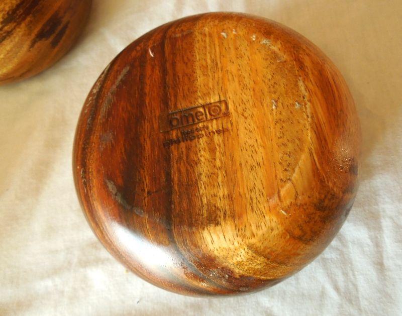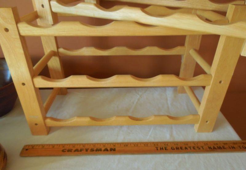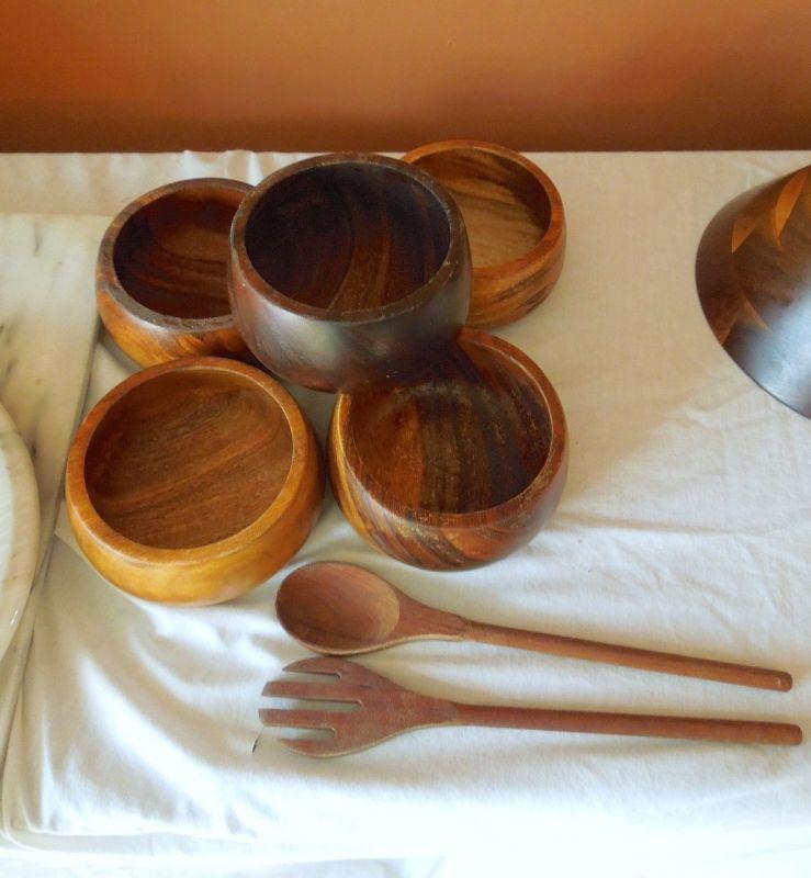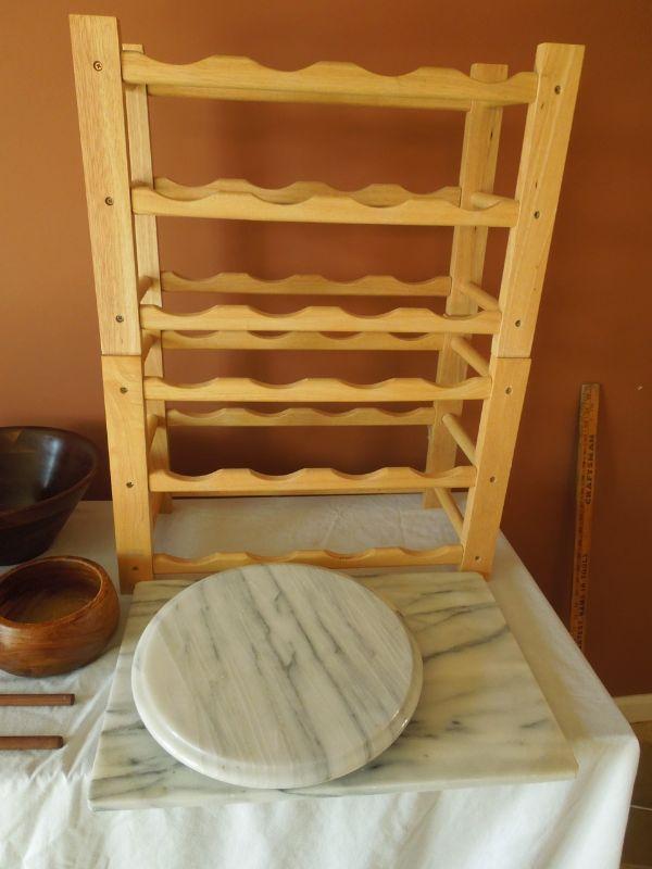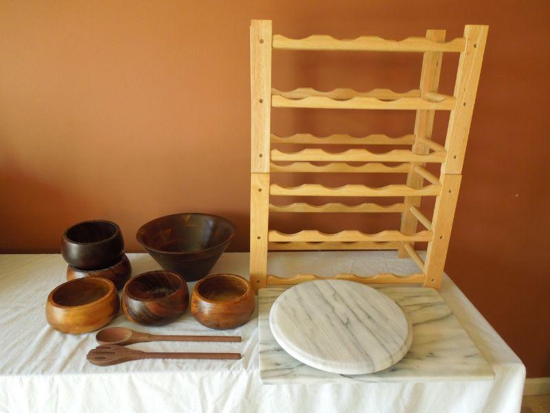 Two pine stacking three tier 12 bottle wine racks; five wooden monkey pod salad bowls; a turned solid wood salad serving bowl; wooden serving spoons; a marble lazy susan and a marble cutting board.