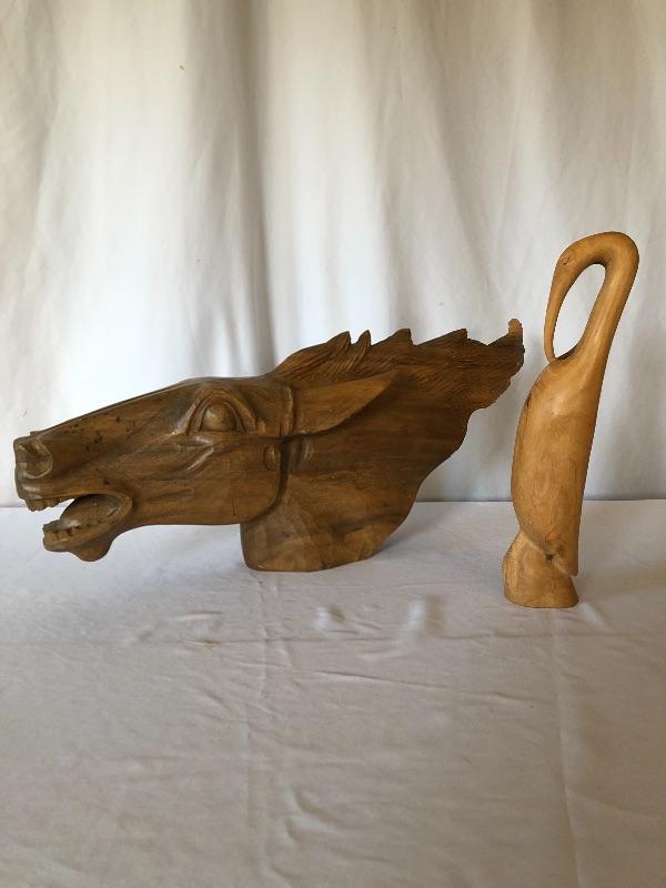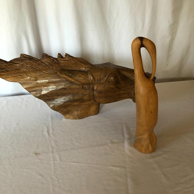 Enjoy these outdoor animals with these solid wooden statues of a Herron and horse. Both are wood and the horse measures 24” long. Local pick up only.