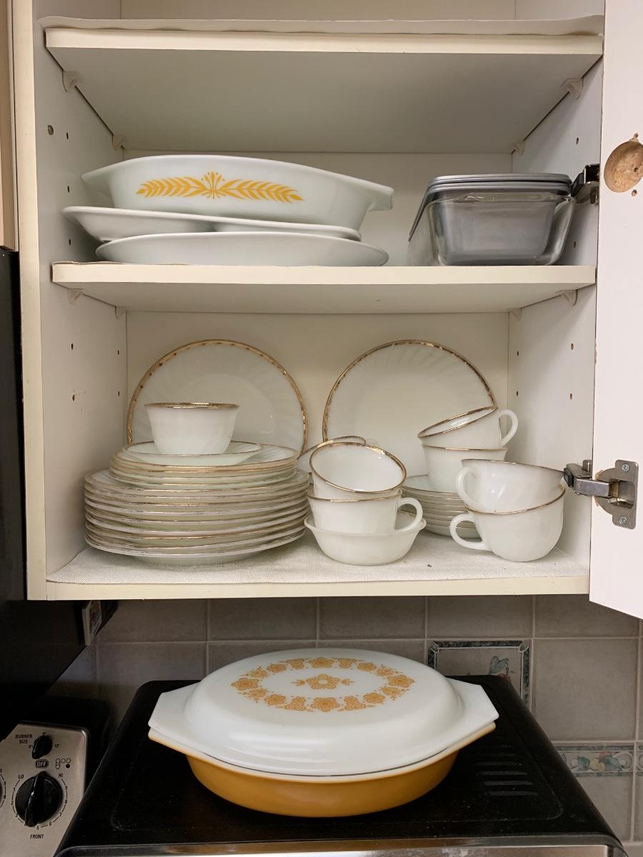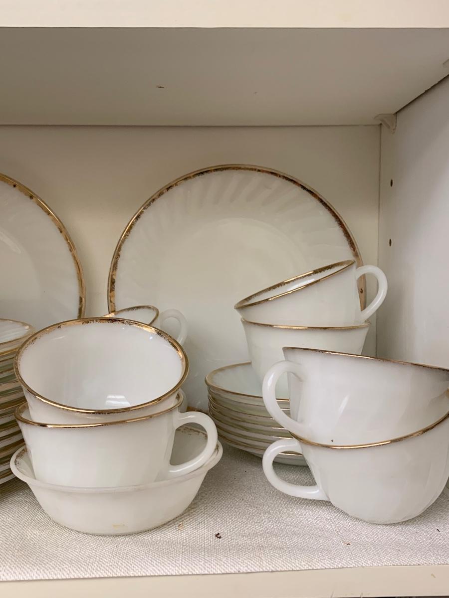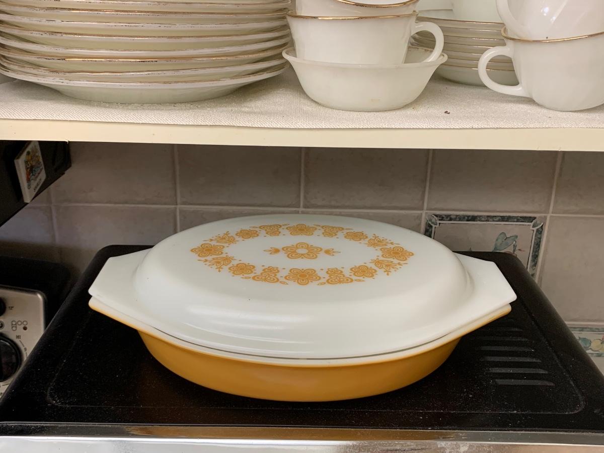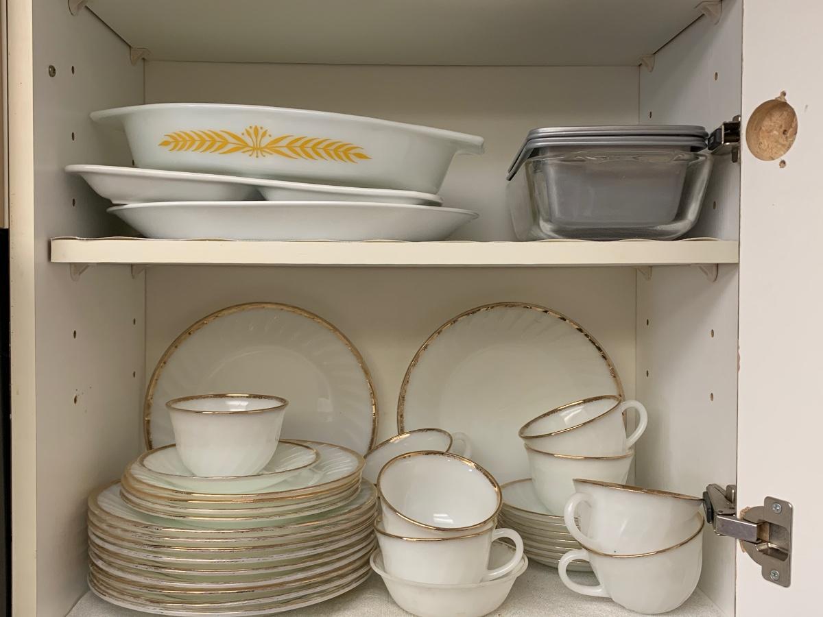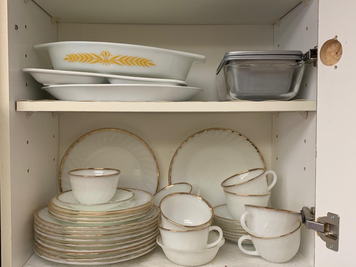 Lot 159R: Vintage Pyrex, Milk Glass Swirl White Gold Rim & More