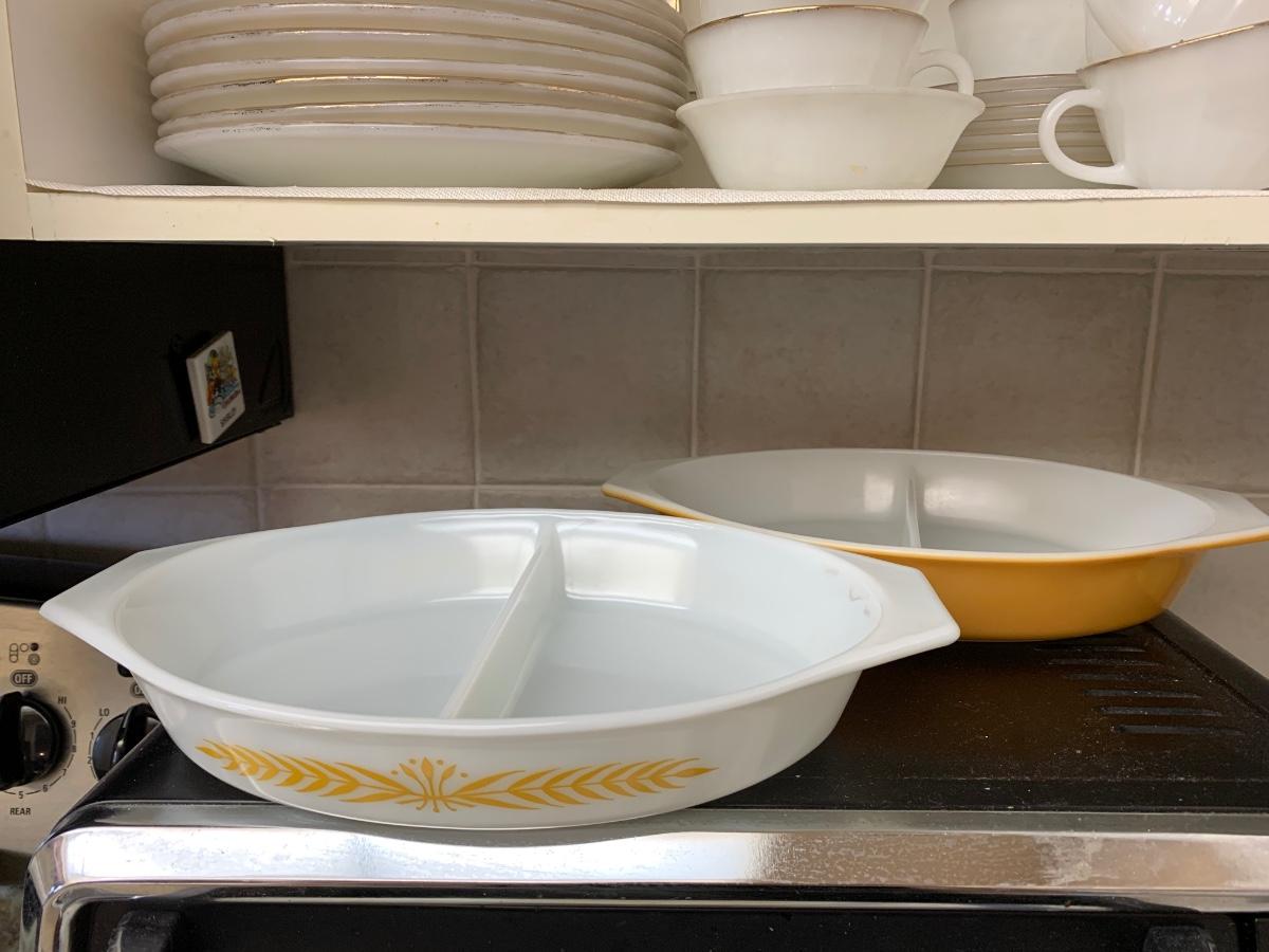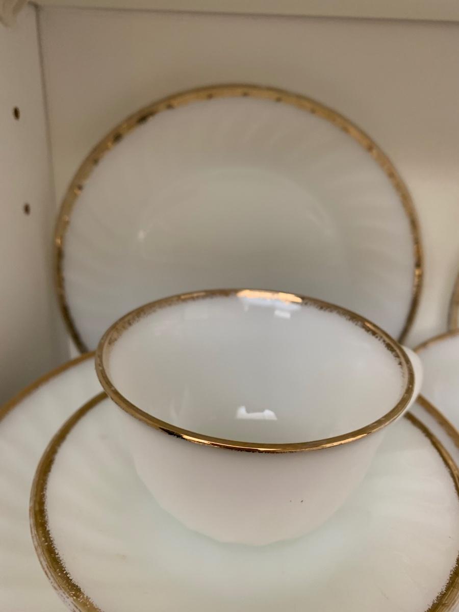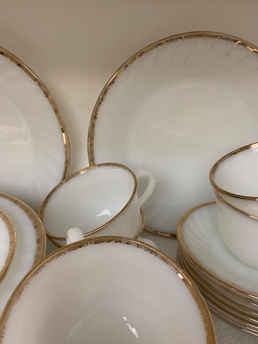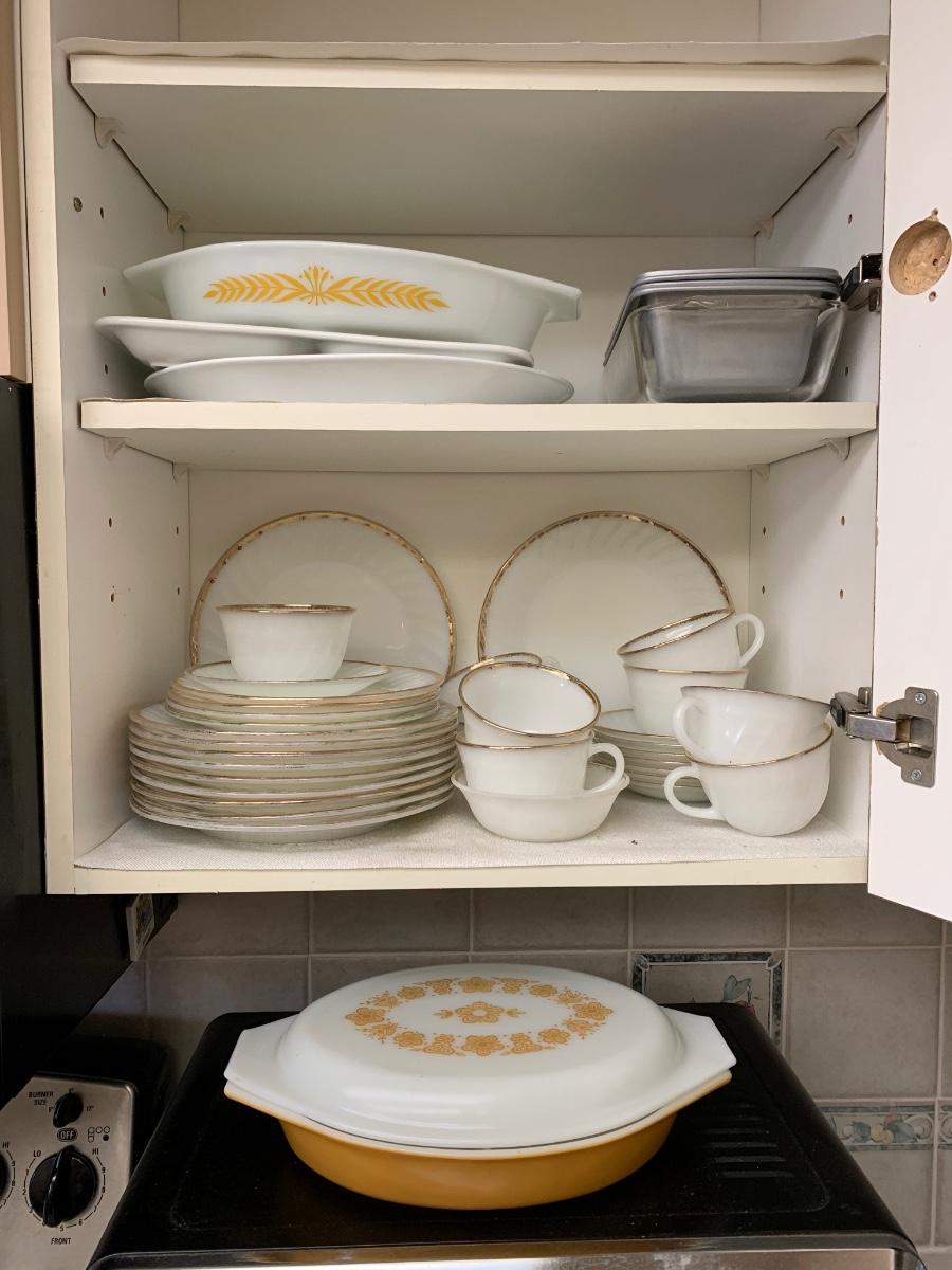 Lot 159R: Vintage Pyrex, Milk Glass Swirl White Gold Rim & More