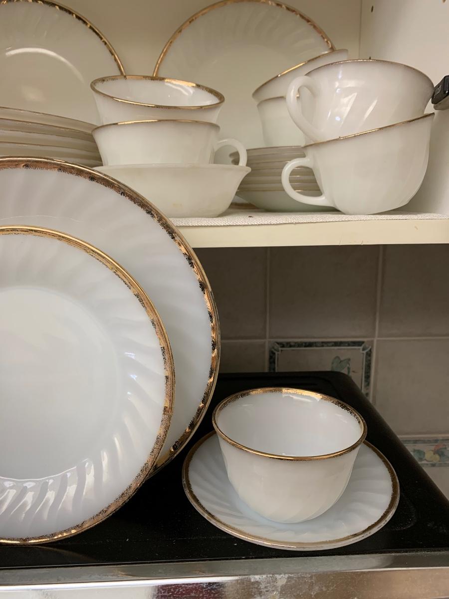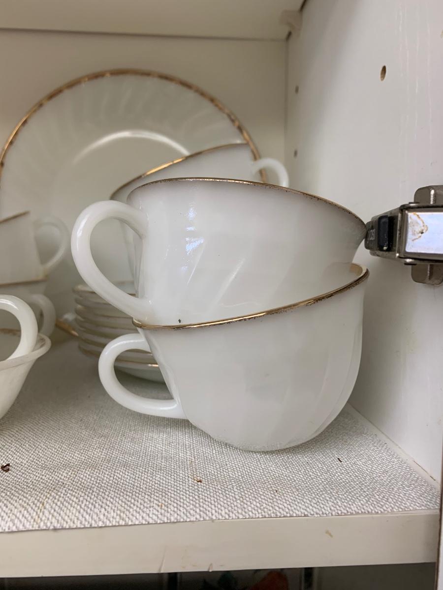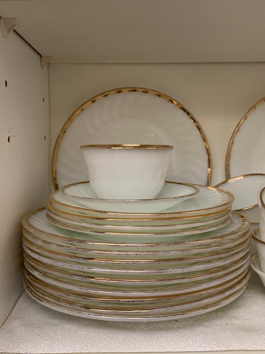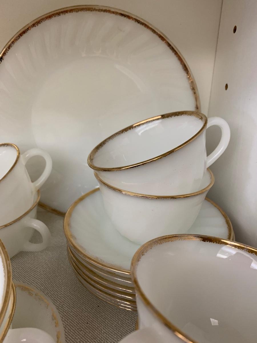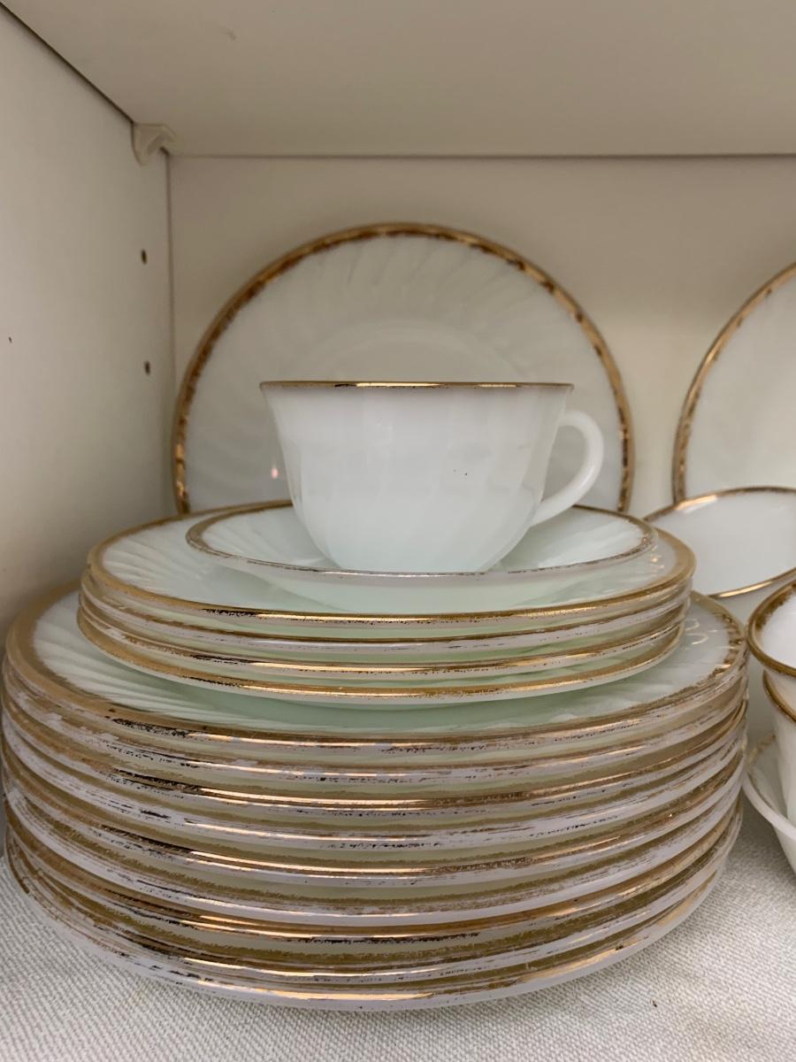 Lot 159R: Vintage Pyrex, Milk Glass Swirl White Gold Rim & More