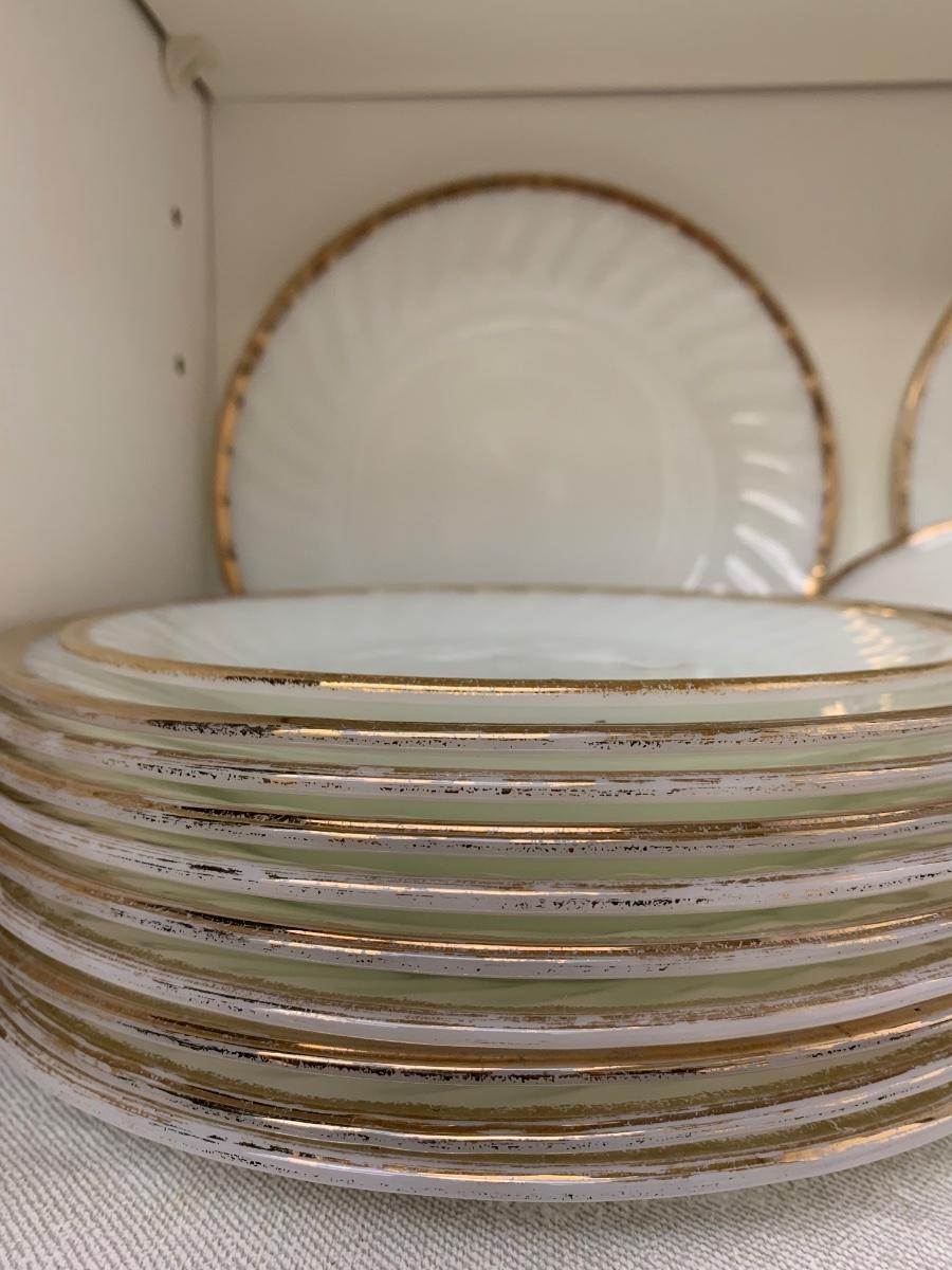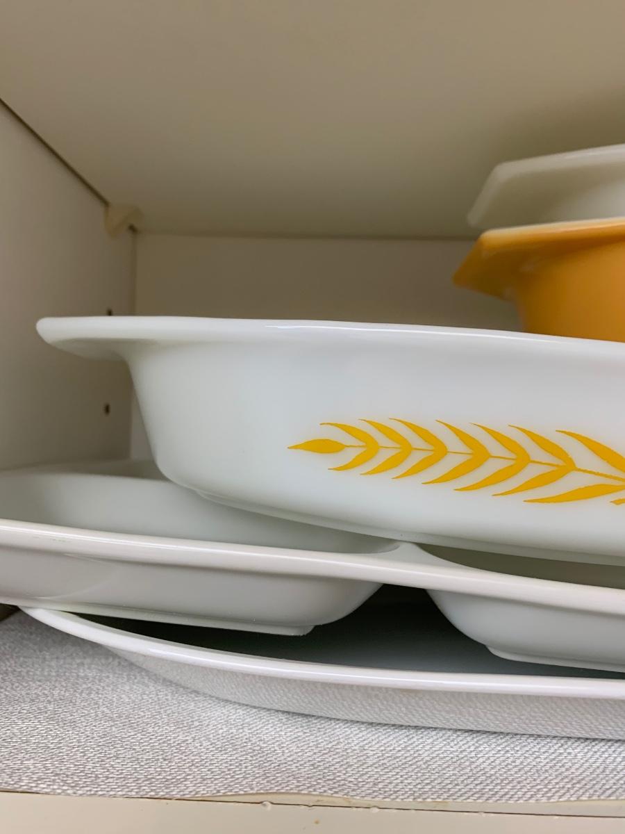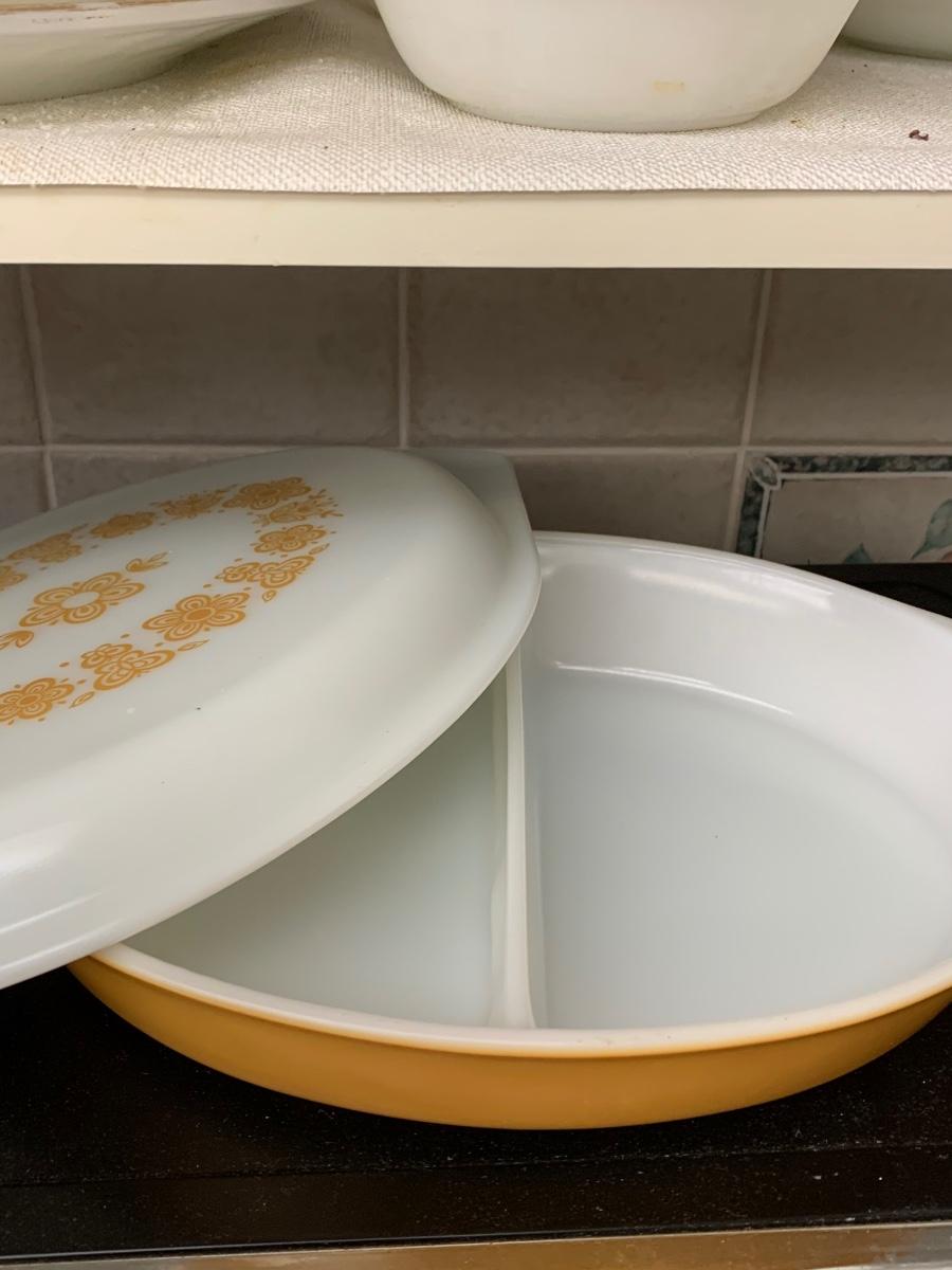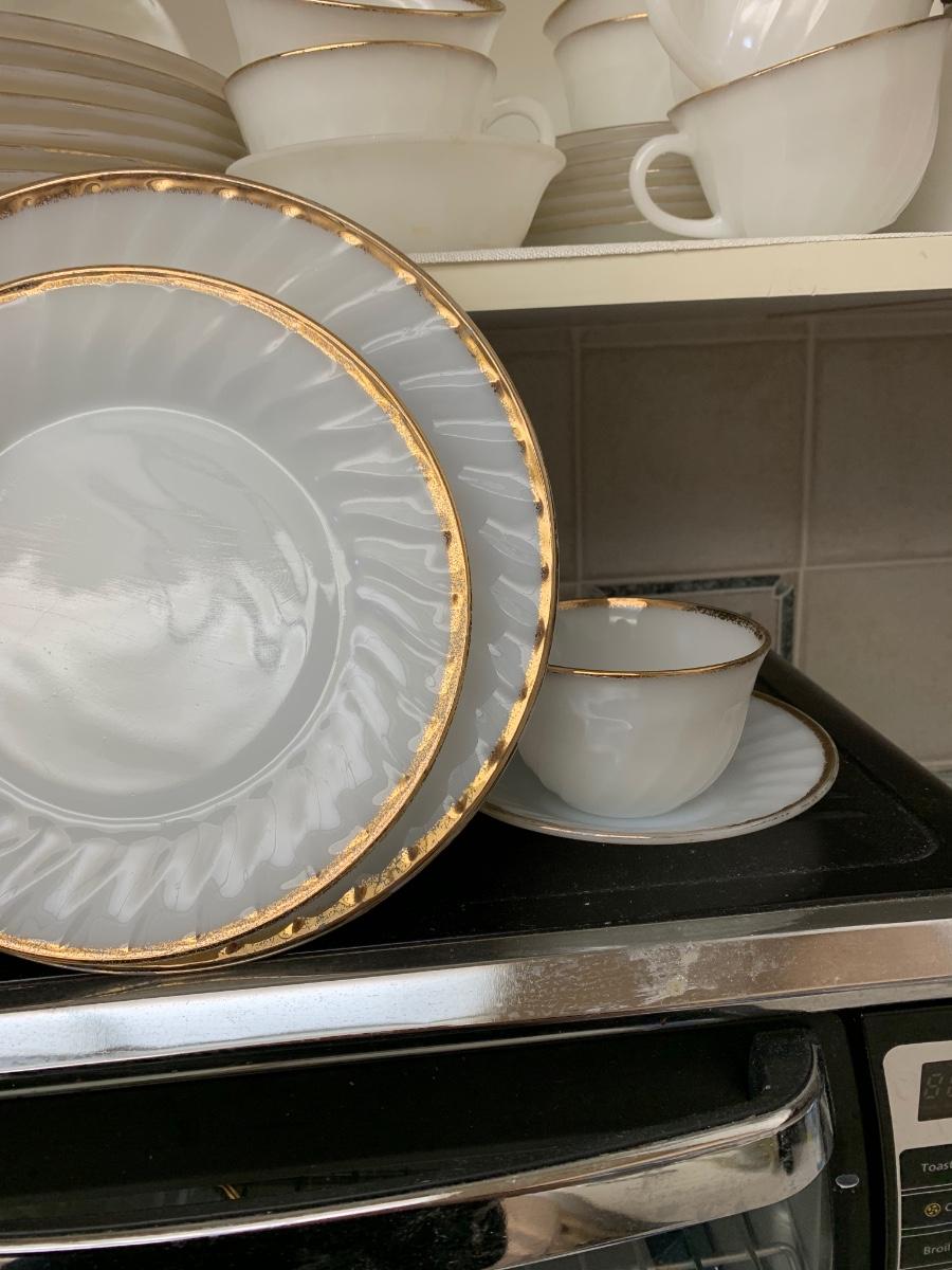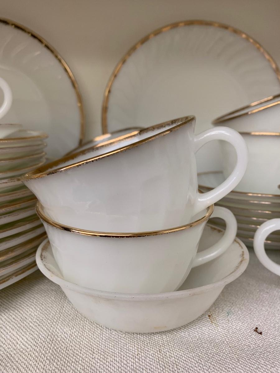 Lot 159R: Vintage Pyrex, Milk Glass Swirl White Gold Rim & More