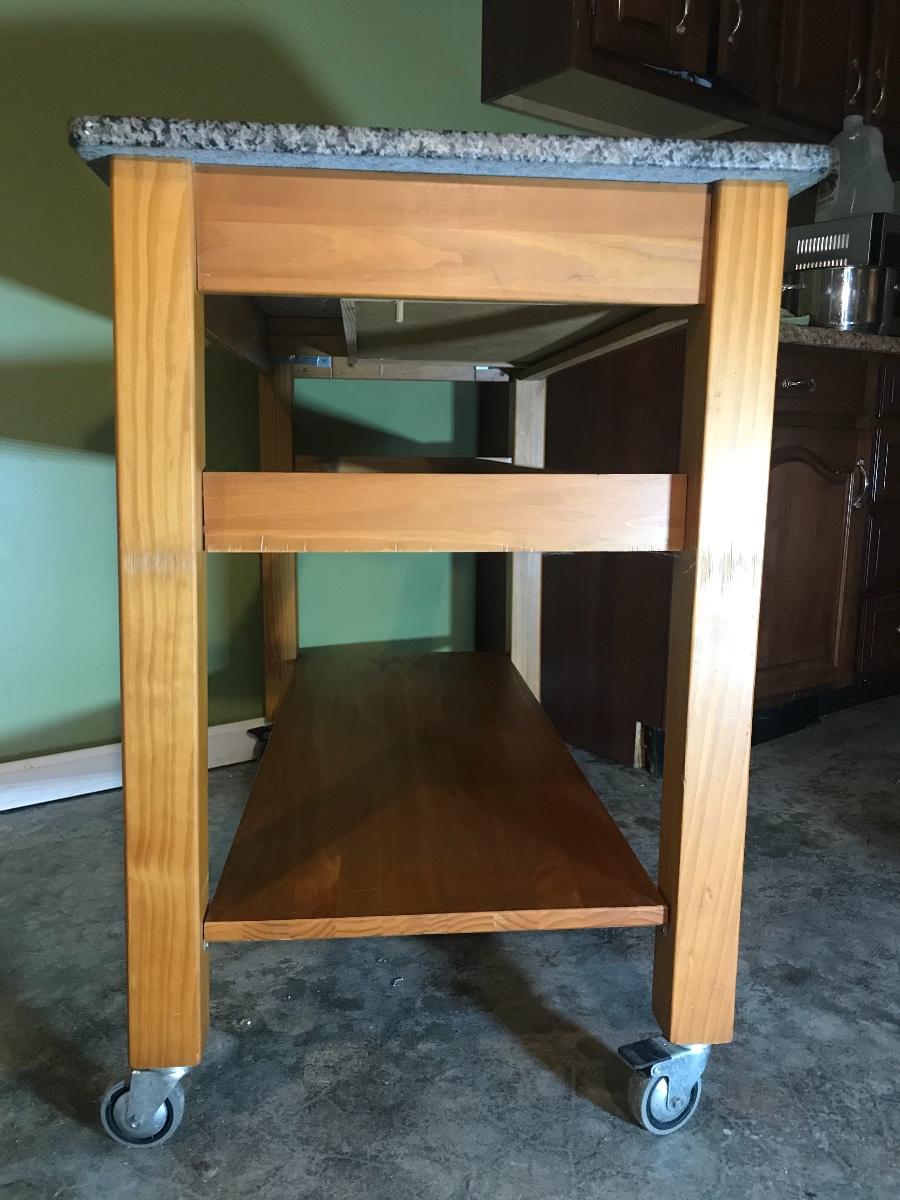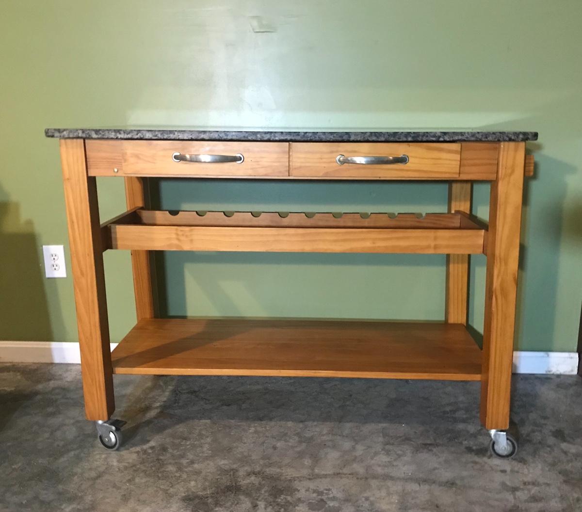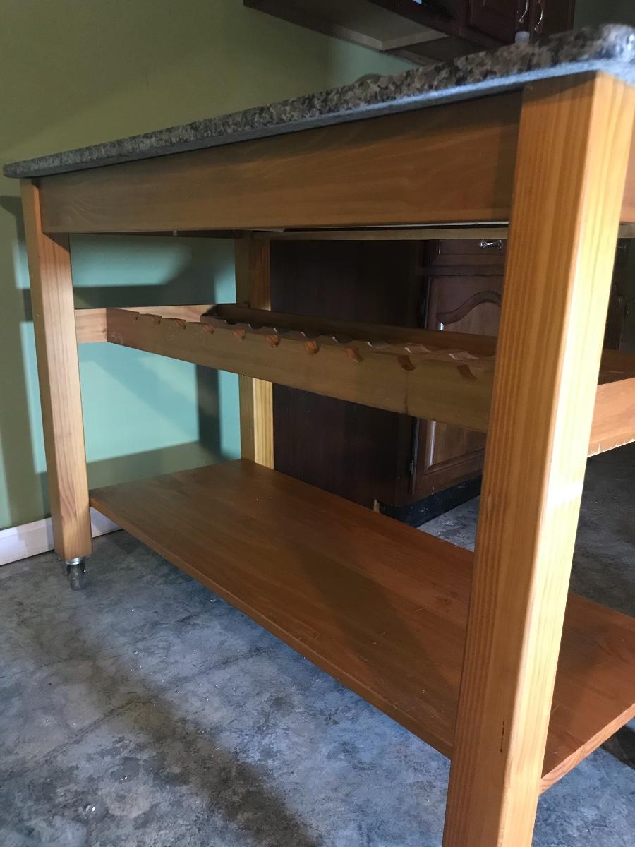 Wooden island with granite top. Wine rack, shelf and a drawer makes this very functional. Wheels make it movable, but they do have locks.. 47x24x36 tall. Located in basement. Please see all pictures for content of the lot, condition of the lot, and measurements if taken. Pictures are the best representation of the items listed and items are untested unless indicated in description. Thank you for looking and have fun bidding!