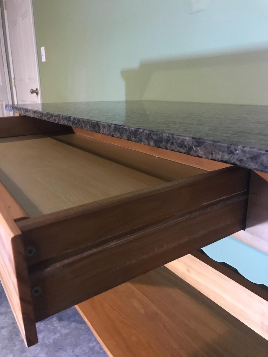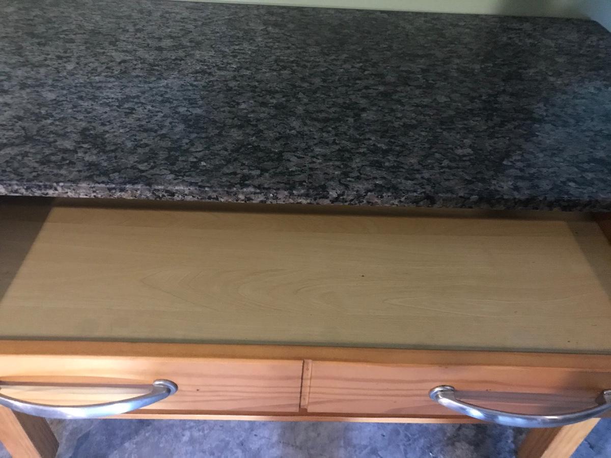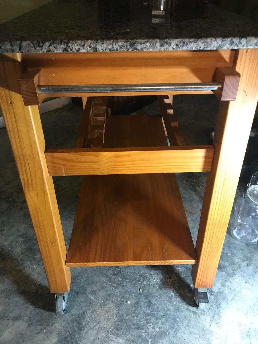Wooden island with granite top. Wine rack, shelf and a drawer makes this very functional. Wheels make it movable, but they do have locks.. 47x24x36 tall. Located in basement. Please see all pictures for content of the lot, condition of the lot, and measurements if taken. Pictures are the best representation of the items listed and items are untested unless indicated in description. Thank you for looking and have fun bidding!