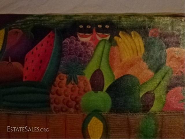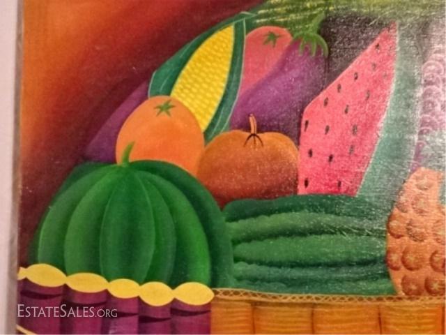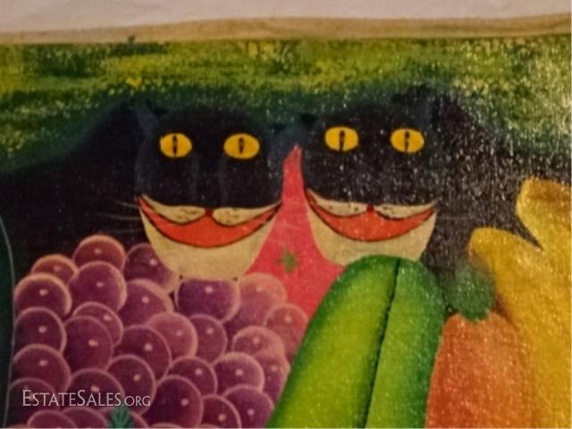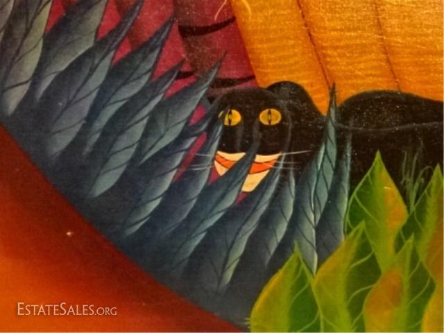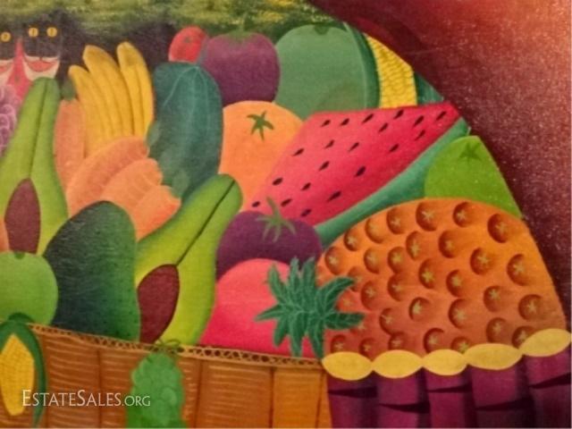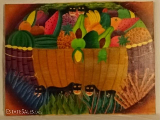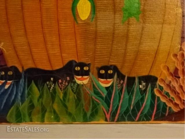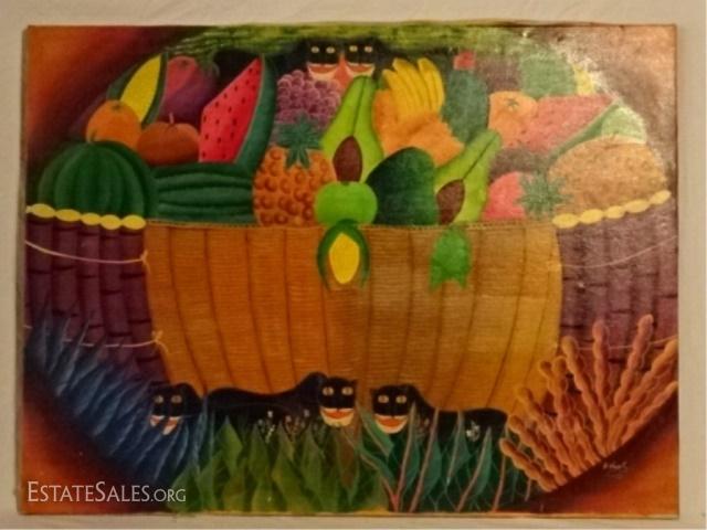 LOT 15C: P. FRANTZ HAITIAN ANIMALIST PAINTING ON CANVAS, DEPICTING PANTHERS AND A LARGE BASKET OF FRUIT, SIGNED P. FRANTZ LOWER RIGHT, UNFRAMED GALLERY WRAPPED, VERY GOOD CONDITION, 40" X 30", SKU39036