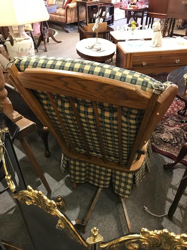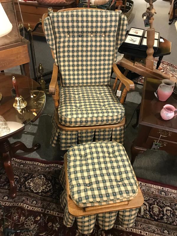 Do you know a new or expectant mother or grandmother? Here's the perfect baby rocker. Solid oak constructed platform rocker with scrolled arms supported by turned spindles and spring seat. Back features open spindle back with wingback styling. Matching solid oak stool also has platform rocking mechanism. Both chair and stool feature removable button tufted cushions and pleated skirting in a woven deep green and cream check with small flowers woven where the green stripes cross. In like new condition. Put your feet up and rock that baby (or yourself) to sleep! Chair 29" x 30" 40" H Stool is 18" x 18" x 15" H