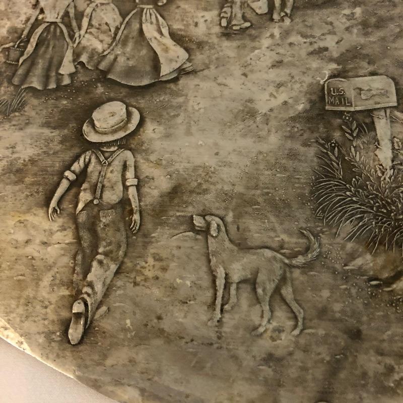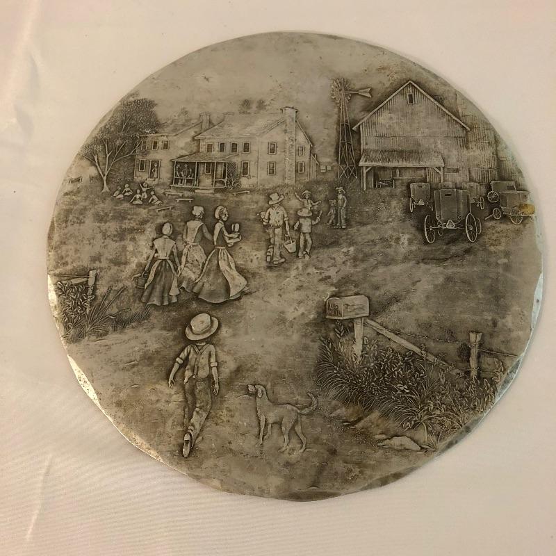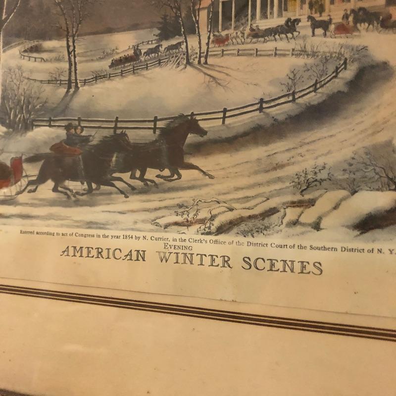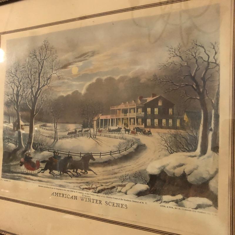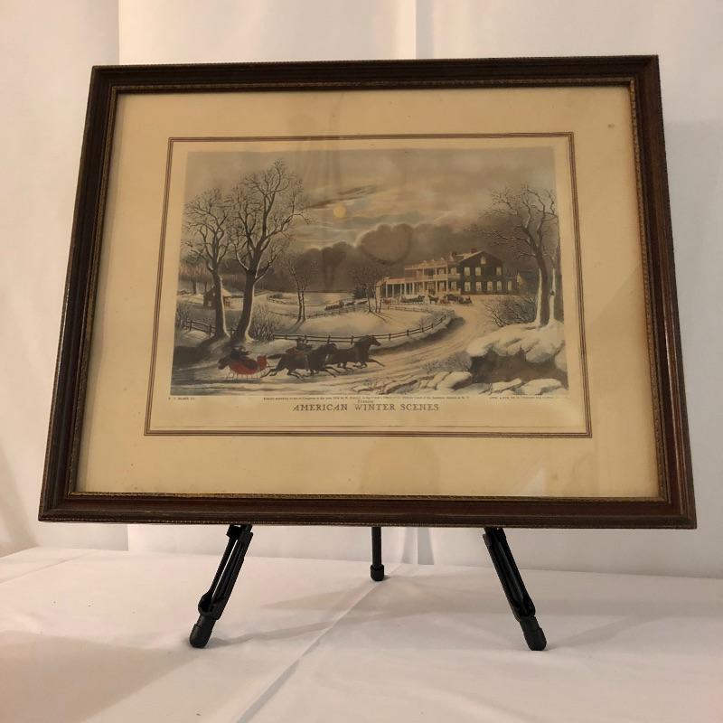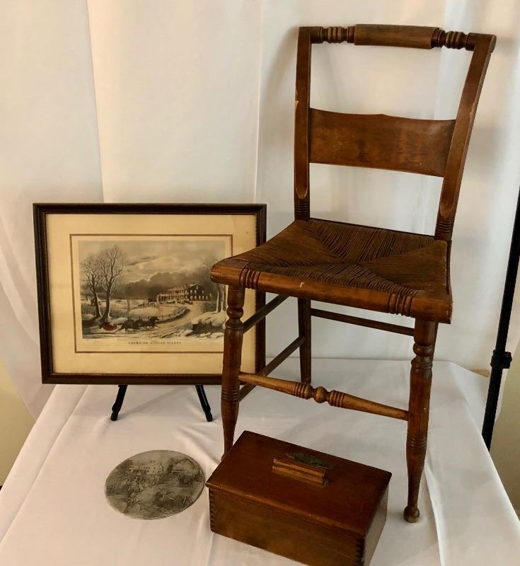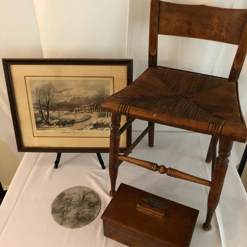 Some special vintage, possibly antique finds in this great lot that includes a Hitchcock style chair with a rush seat that is in amazing condition for its age; it has some minor marks and scuffs, but they truly just add to its historical rustic charm. It measures 14” deep x 17.5” wide x 36” tall with a seat height of 18”. The special small box has a bald eagle metal emblem on the lid and features dovetailed corners. Next we have a Wendell August hammered aluminum plate with a colonial times scene etched into it. Last but not least we have a F.F Palmer, American Winter Scenes print in a dark wood frame. Print measures 16.5” x 20.5”.