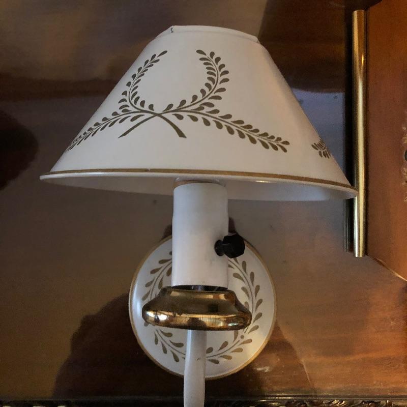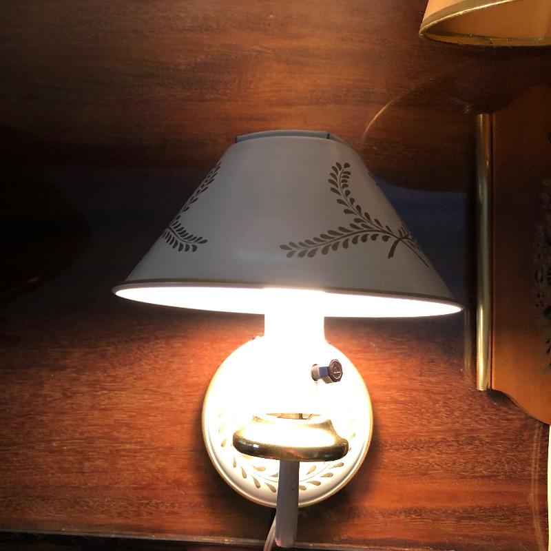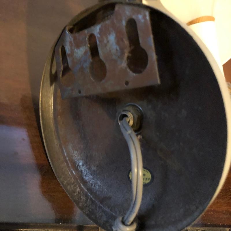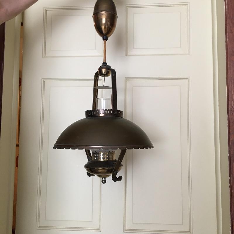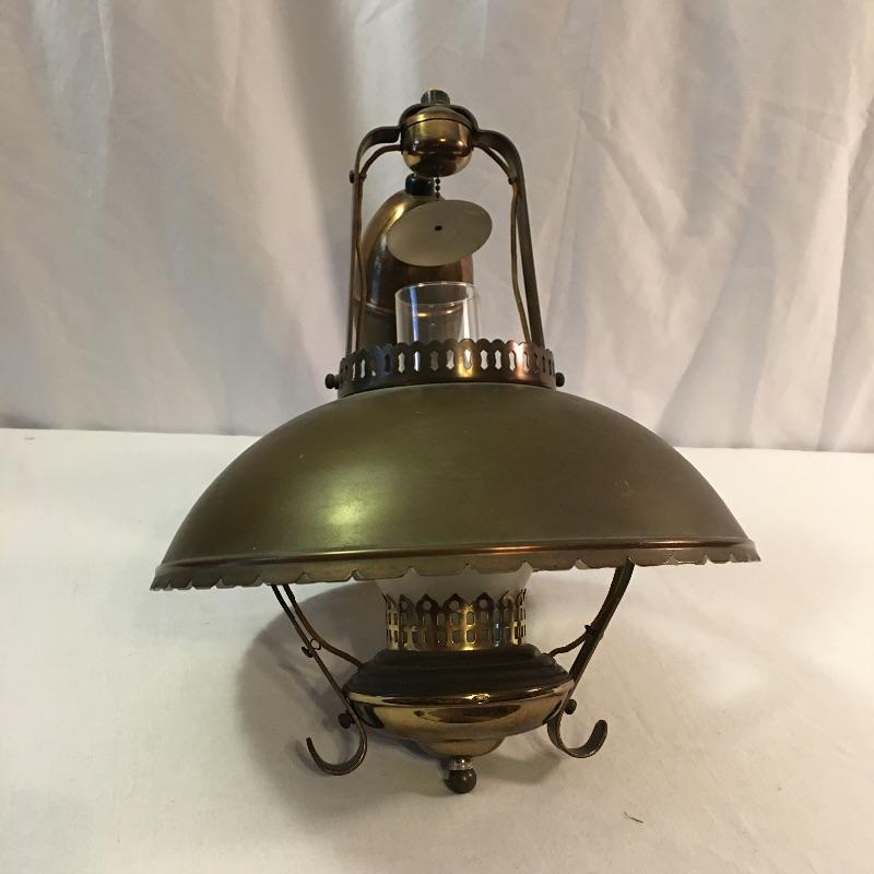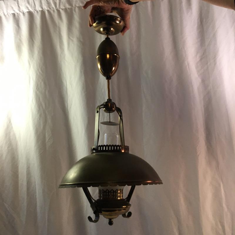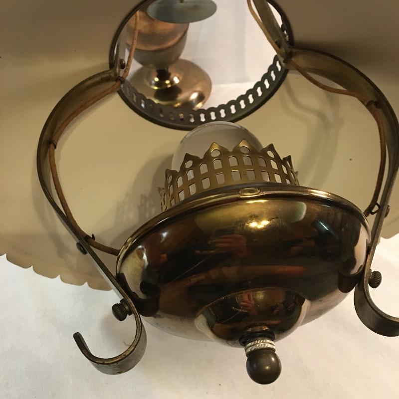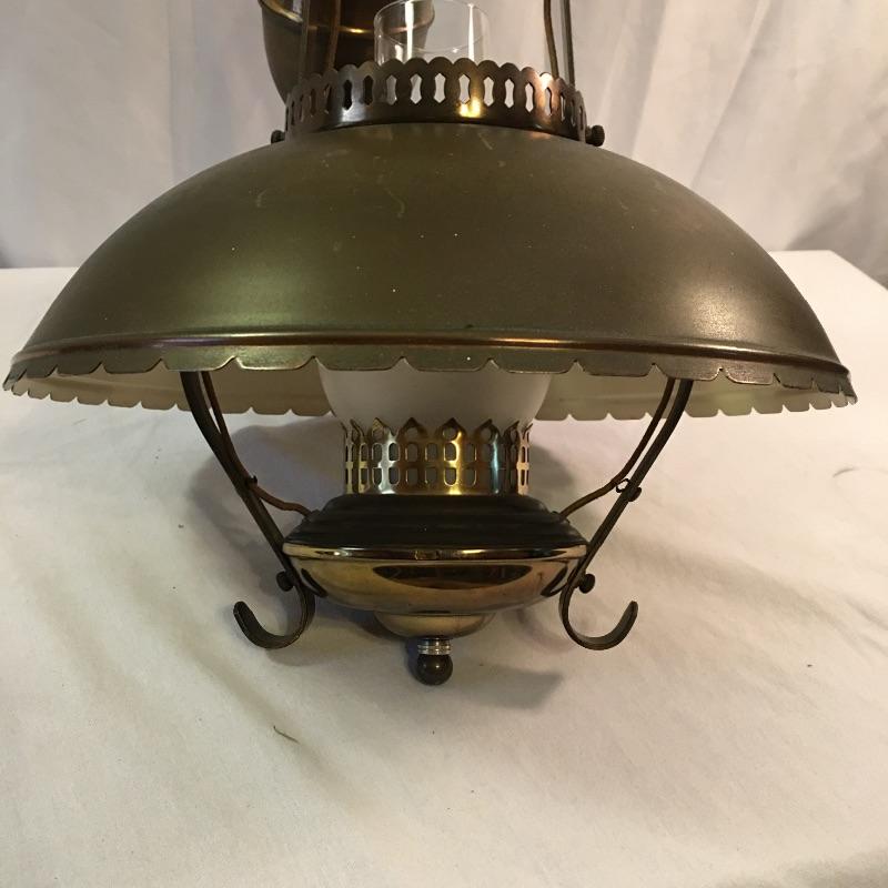 What a treasure from Harmony House Underwriters Laboratories! This antique brass lamp was an oil lamp back in the day, now converted to electric. Old world charm with modern convenience, this lamp will look amazing in any space it is hung. The inside of the shade has been painted an off-white color for maximum reflection. It can be switched off and on via a knob located at the lowest point of the base, which is an added touch made during its conversion. It appears to be all brass with a frosted glass globe. Measures 13” diameter x 27” tall. We have added two vintage wall-mount lights. The smaller white lamp measures 9” tall.