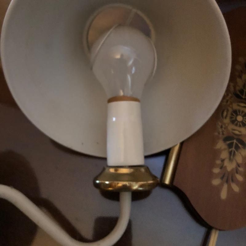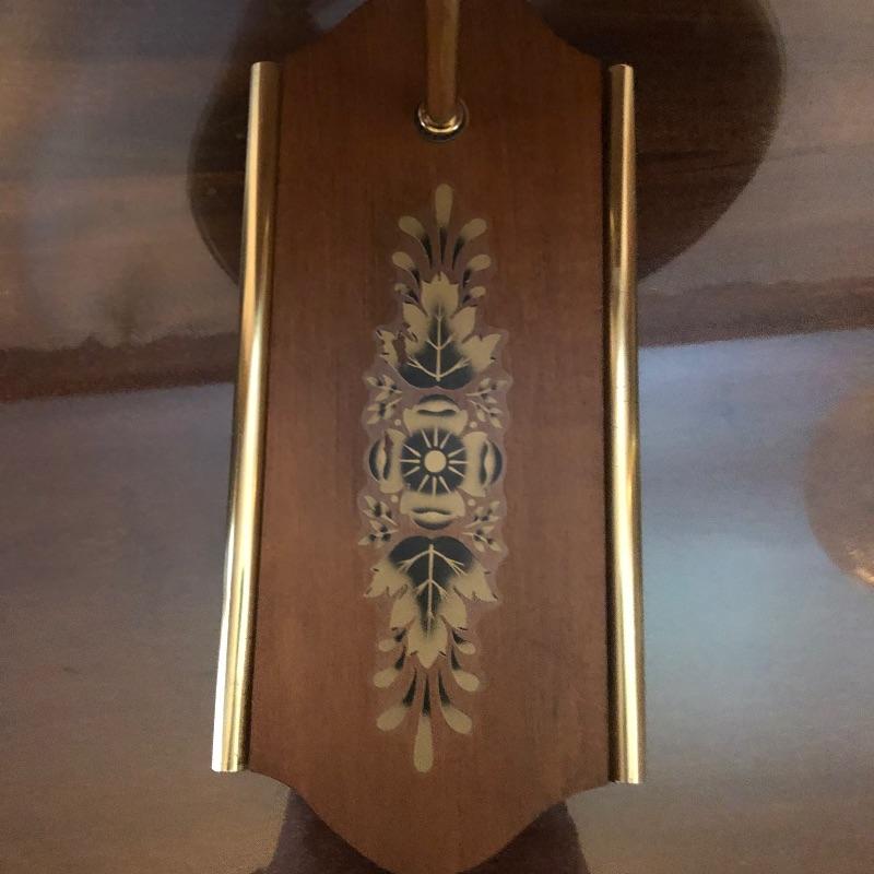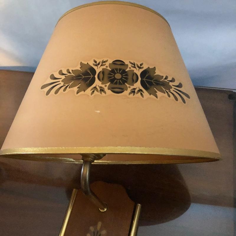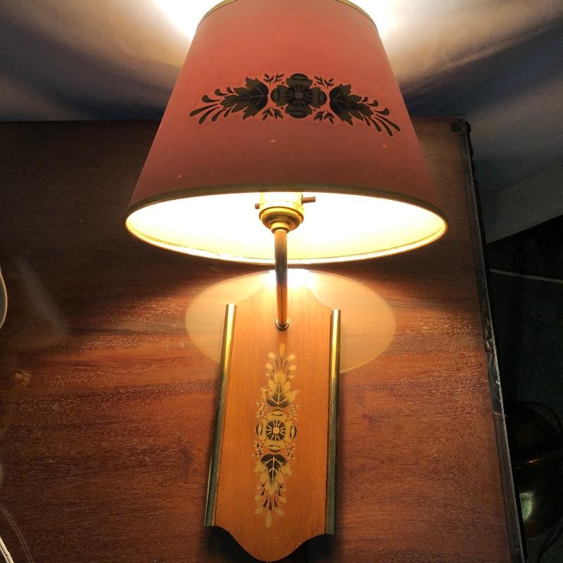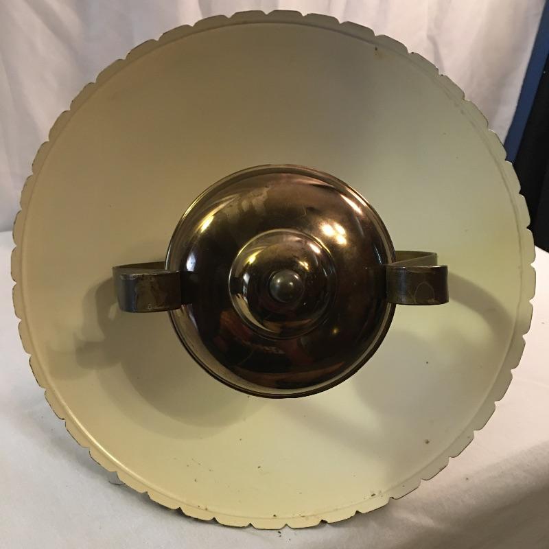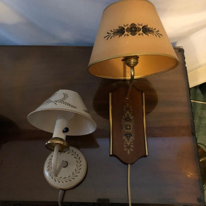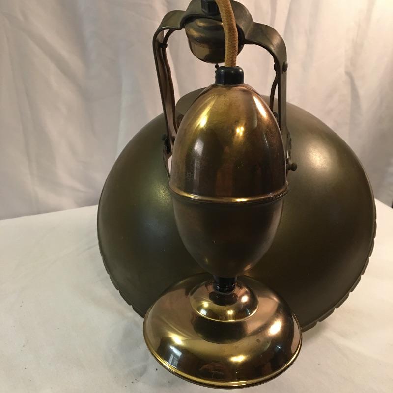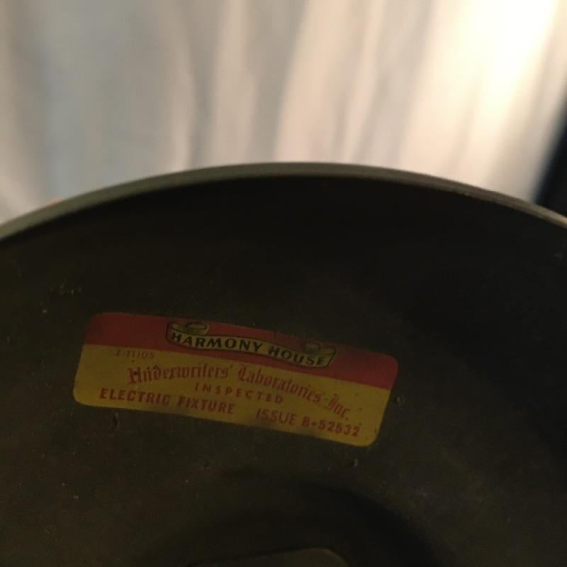 What a treasure from Harmony House Underwriters Laboratories! This antique brass lamp was an oil lamp back in the day, now converted to electric. Old world charm with modern convenience, this lamp will look amazing in any space it is hung. The inside of the shade has been painted an off-white color for maximum reflection. It can be switched off and on via a knob located at the lowest point of the base, which is an added touch made during its conversion. It appears to be all brass with a frosted glass globe. Measures 13” diameter x 27” tall. We have added two vintage wall-mount lights. The smaller white lamp measures 9” tall.