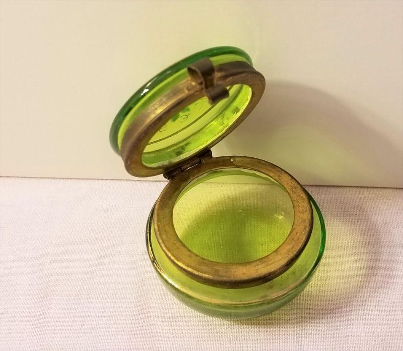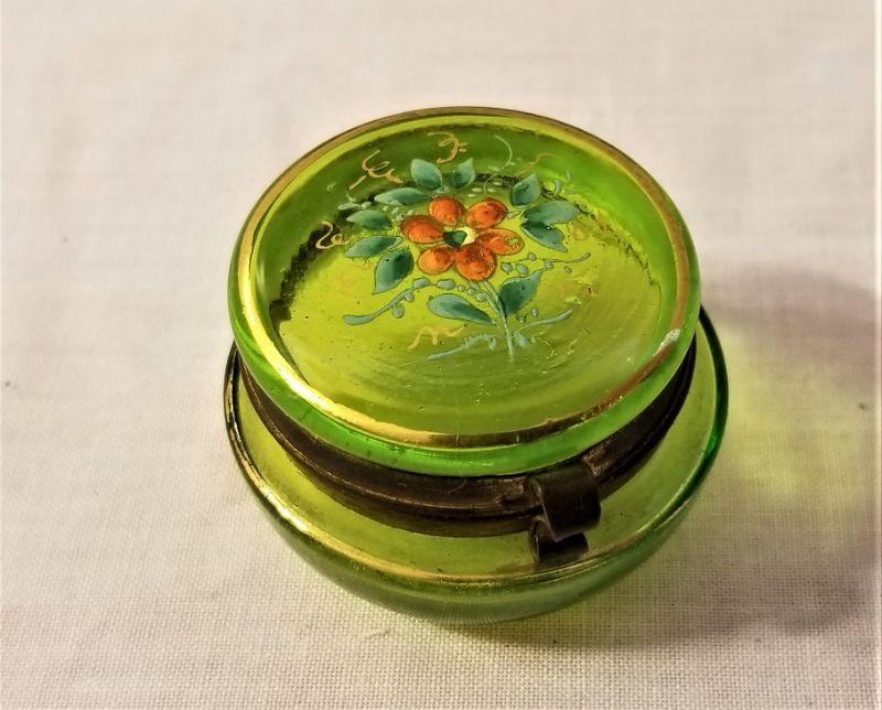 Sweet antique (19th century) round green glass patch box - hinged - with painted enamel floral design. 1.5" tall.