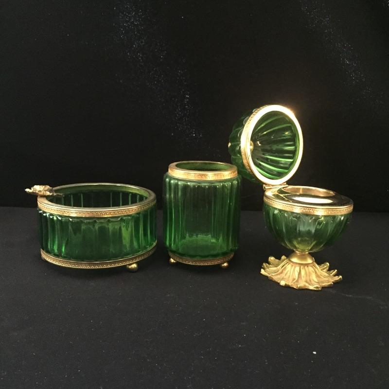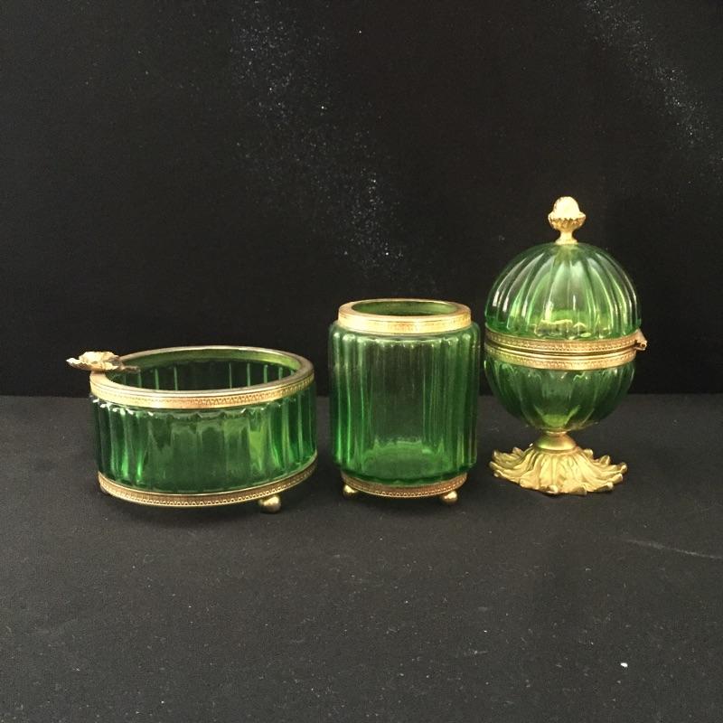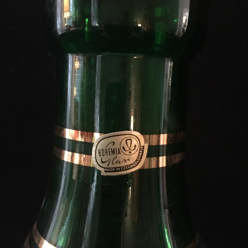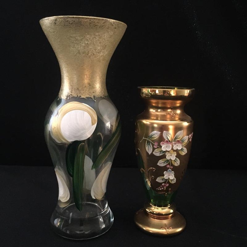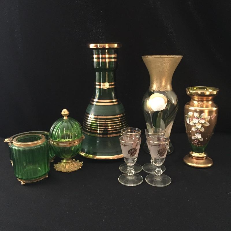 Lovely array of vases, glasses and three matching pieces. Several pieces are a gorgeous green glass with gold details. Others are painted with gold artwork. One is signed by artist.