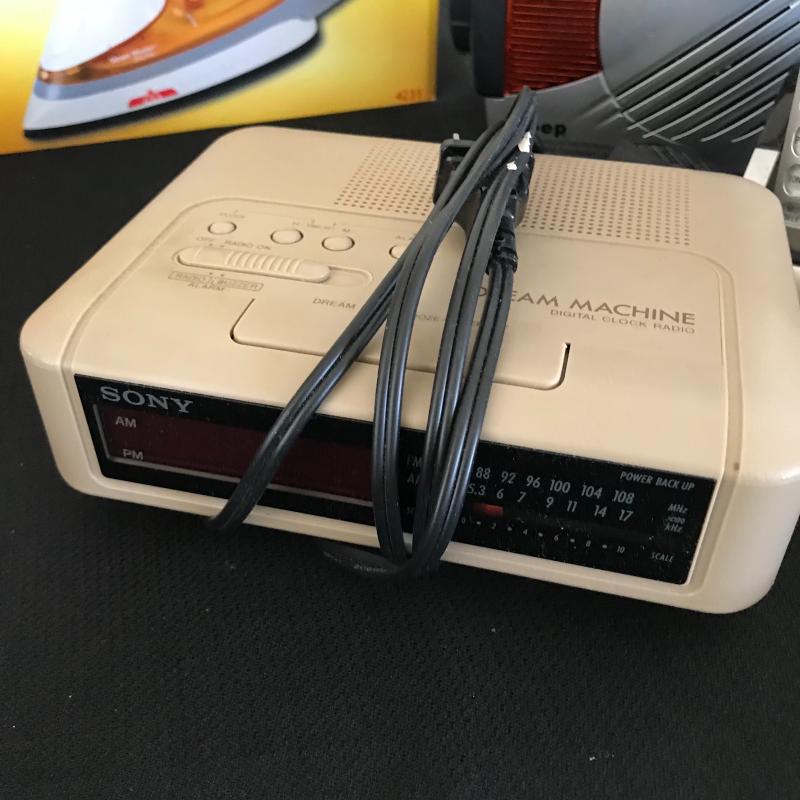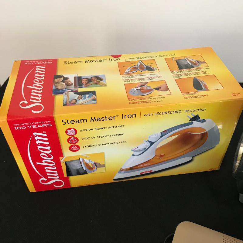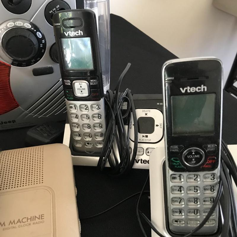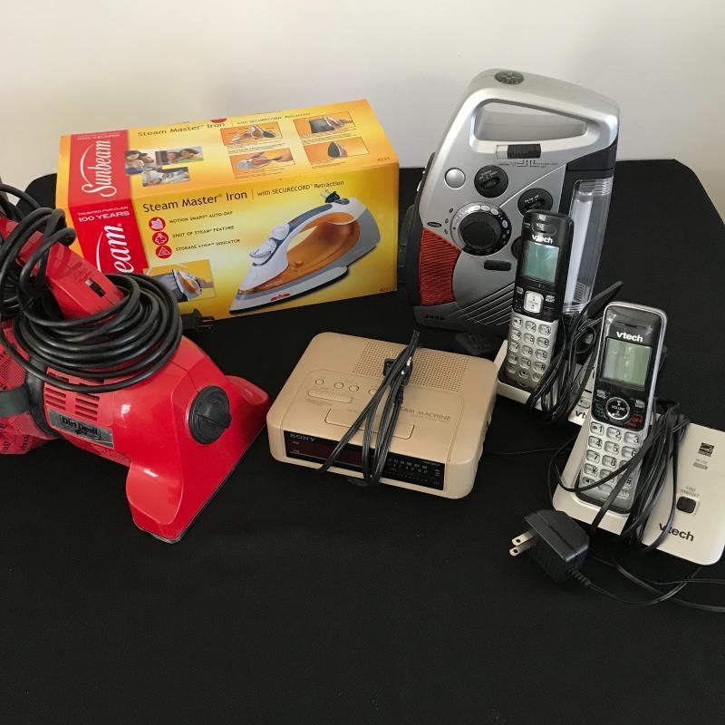 Lot includes new-in-box Sunbeam iron, alarm clock, Dust Buster, set of cordless phones, and Jeep radio/lantern. No shipping available. Local pickup only in Asheville, NC.