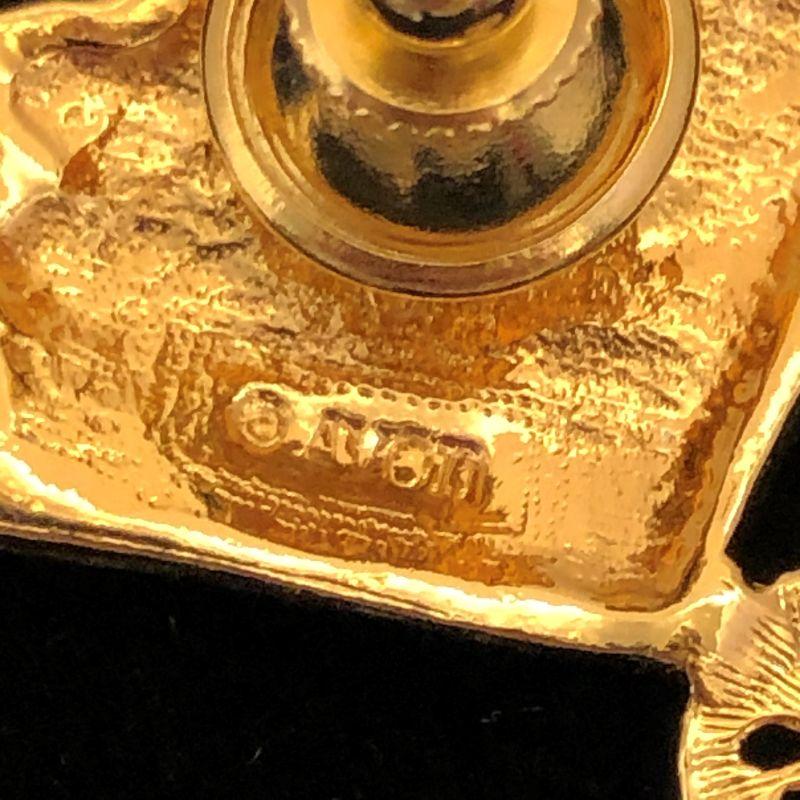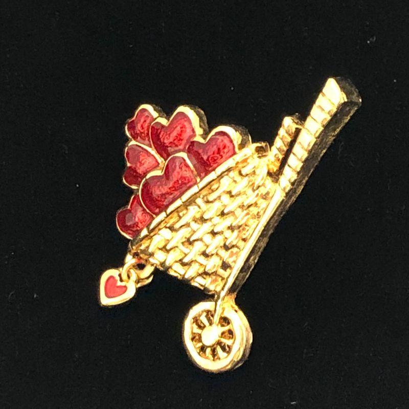 This pin is in excellent condition and marked Avon. It is a gold tone wheelbarrow filled with red hearts and there is a heart dangling from the front.