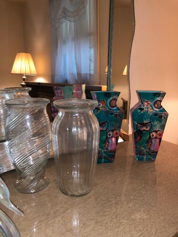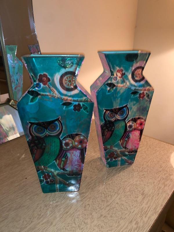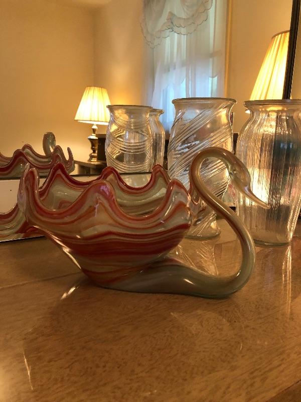 Lot 16 - Bassett Triple Dresser w/Mirror, Large Jewelry Box, Owl Vases, Clear Vases, Glass Swan & Vintage Owl