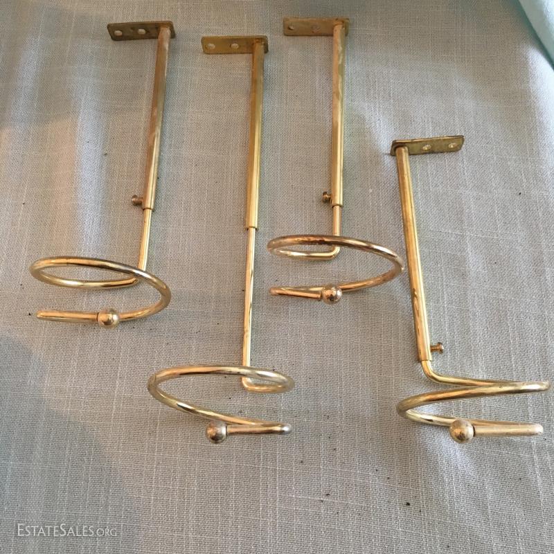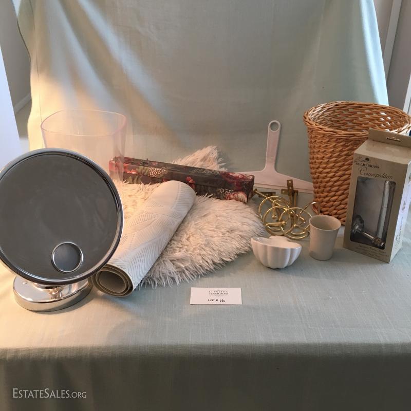 Miscellaneous bathroom items: small rug 36" x 22", plug-in mirror, 2 garbage cans (plastic & woven), rubber shower mat, 2 sheets of scented drawer liners, 4 brass wall brackets (could use for towels or curtain tie backs), brass standard tissue holder, plastic shower squidgy for glass doors, small ceramic cup and shell soap holder.