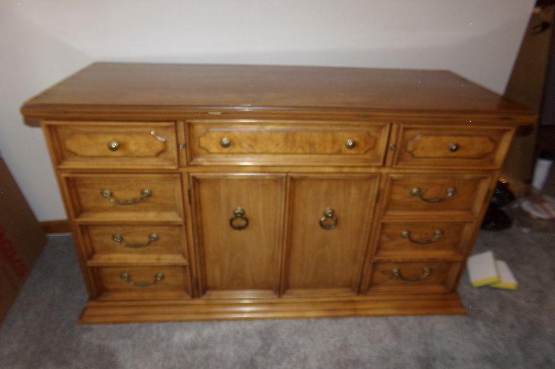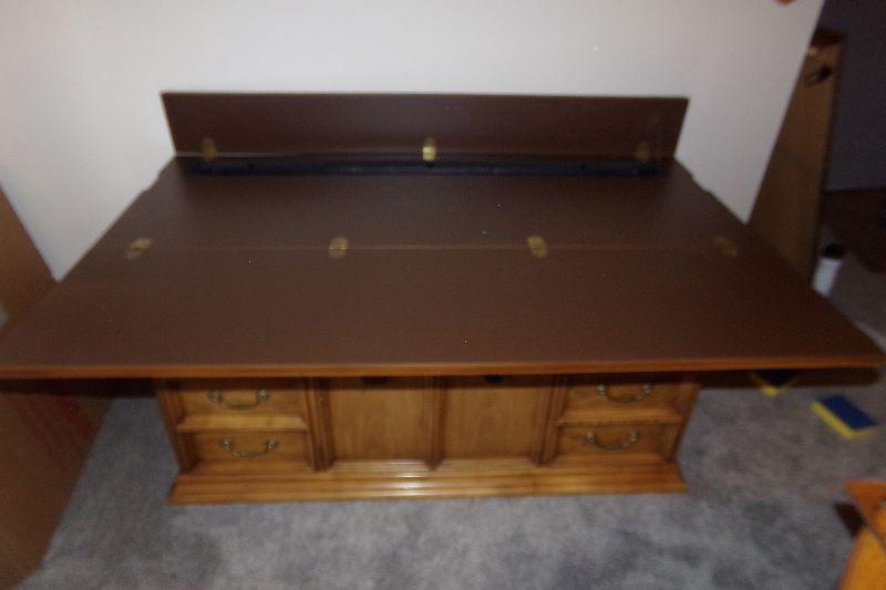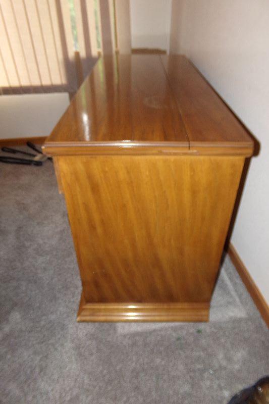 SOLID WOOD WITH PLENTY OF STORAGE DRAWERS AND CABINET, THE TOP FOLDS OUT TO OFFER THE EXTRA SERVING SPACE