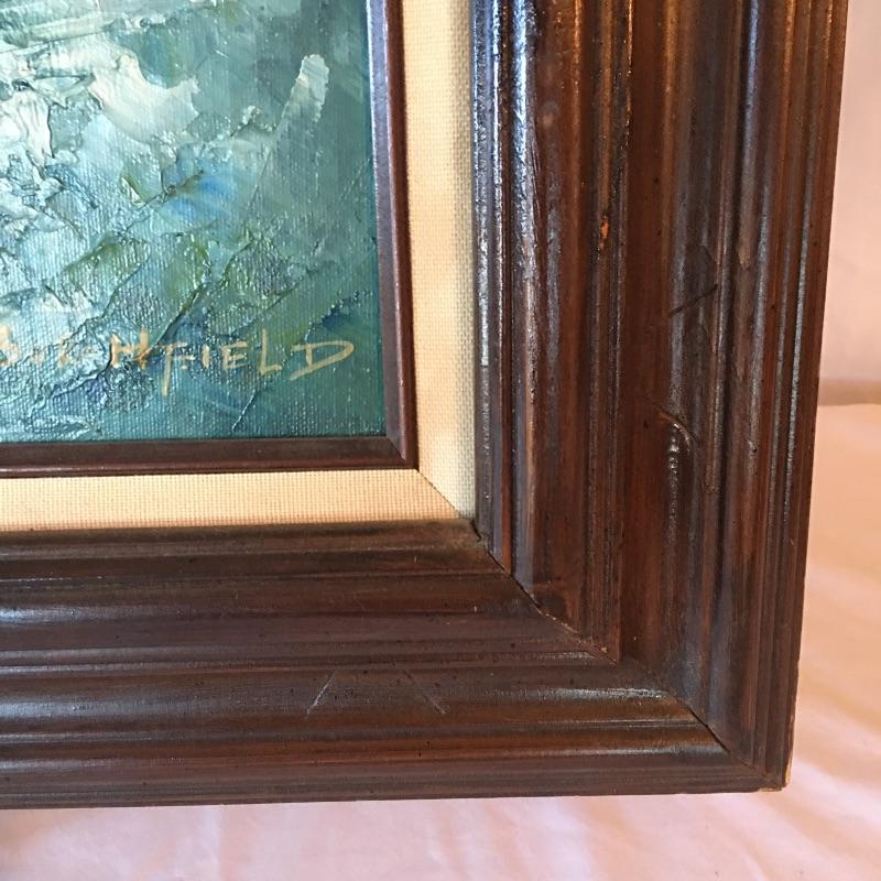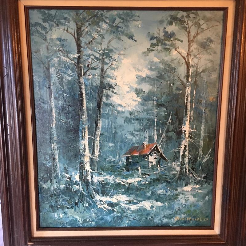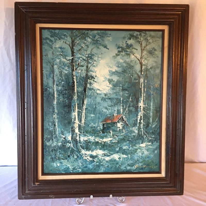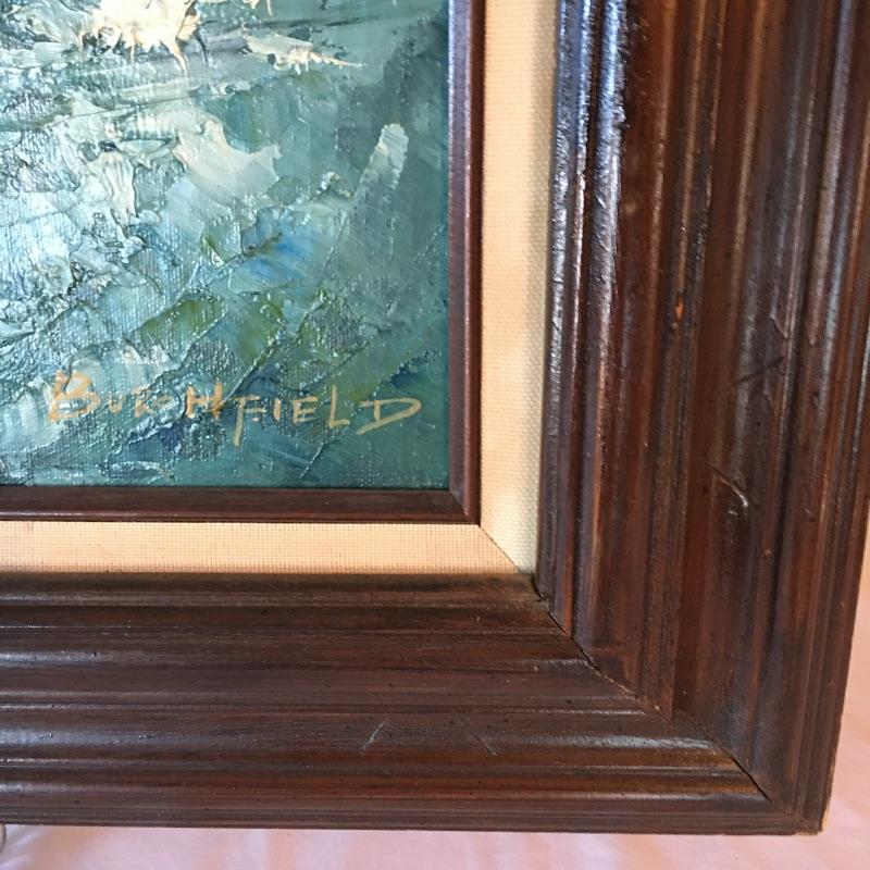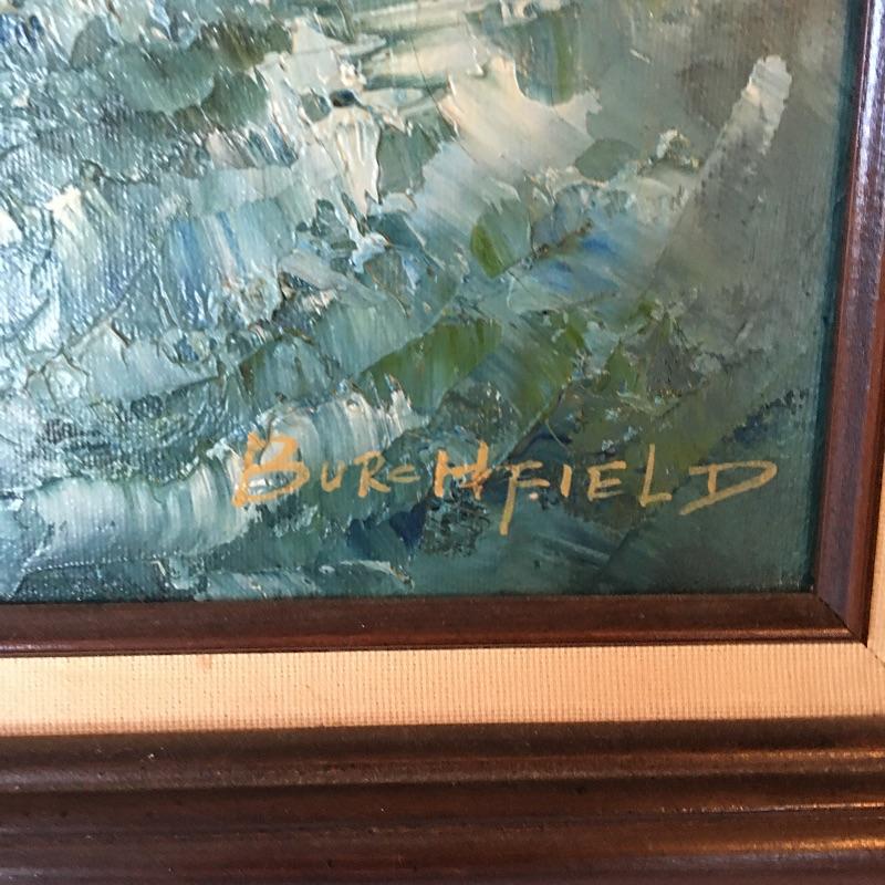 This lovely oil painting on canvas is signed Burchfield and has a wooden frame. Enjoy the peaceful view of a cabin nestled in the woods with this beautifully painted piece.
