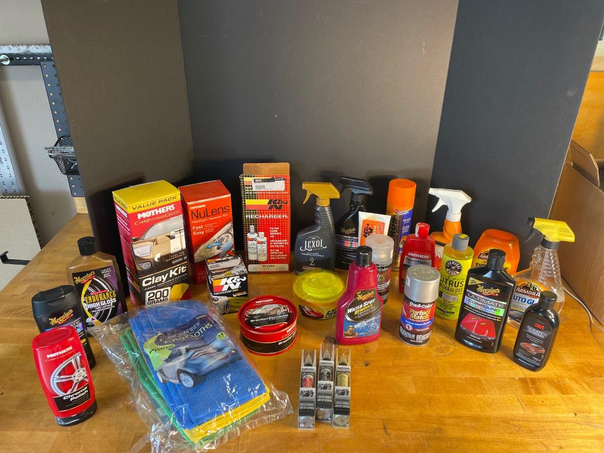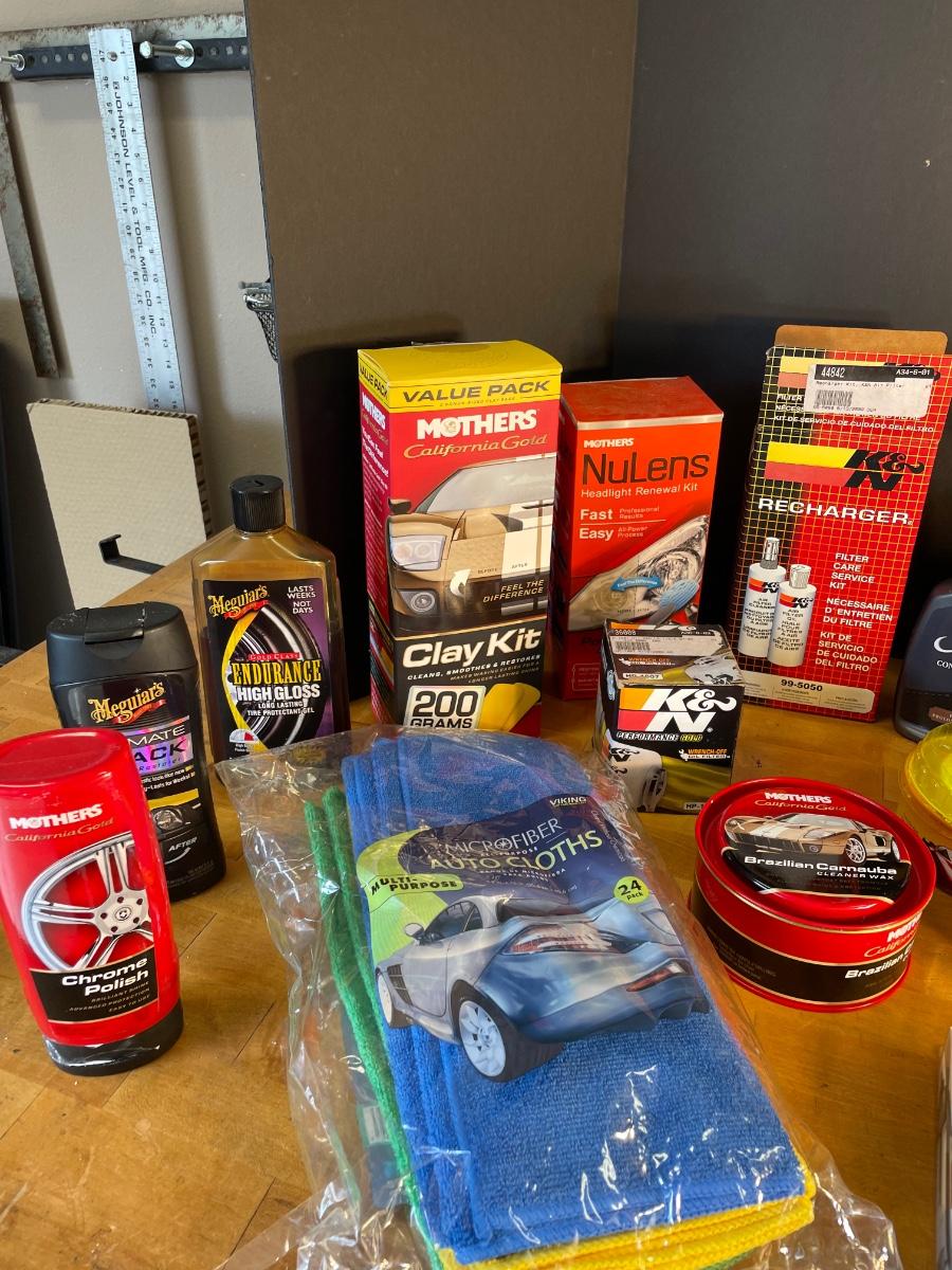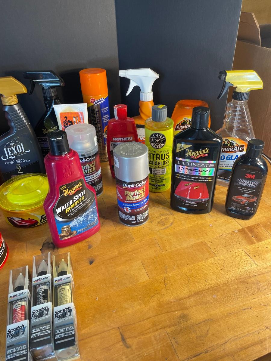 Large assortment of products for cleaning your car, including headlight restoring kit, waxes, cleaners, microfiber cloths, polishing compounds, scratch remover,