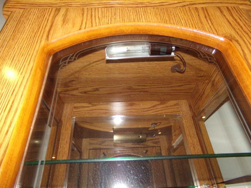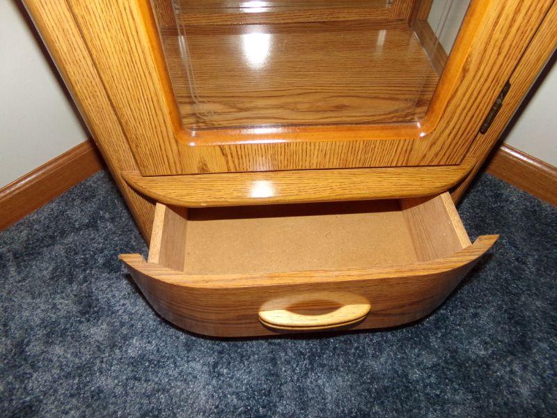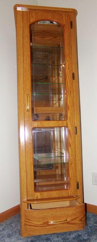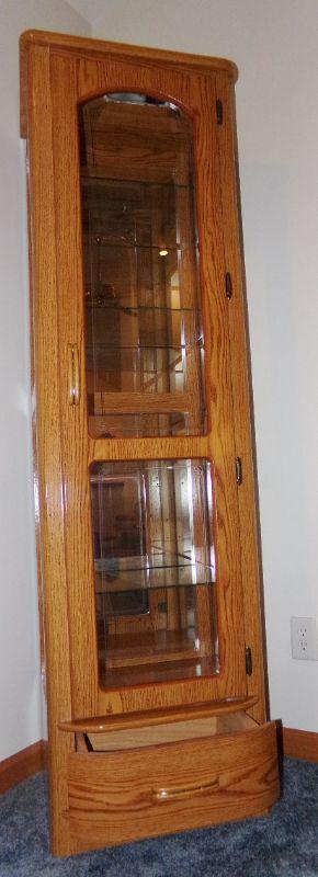 CABINET IS LIGHTED AND SHELVES ARE NOTCHED TO DISPLAY PLATES. DRAW LOCATED AT BOTTOM. MEASURES 20" X 16" X 72"