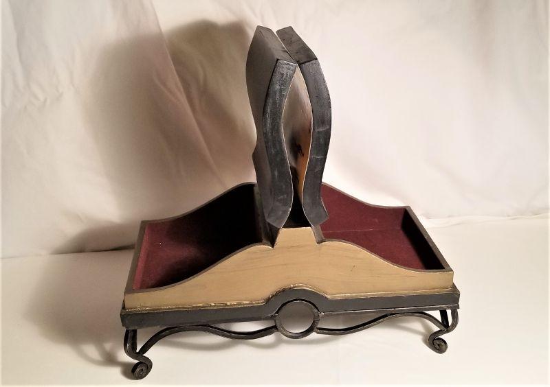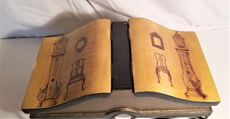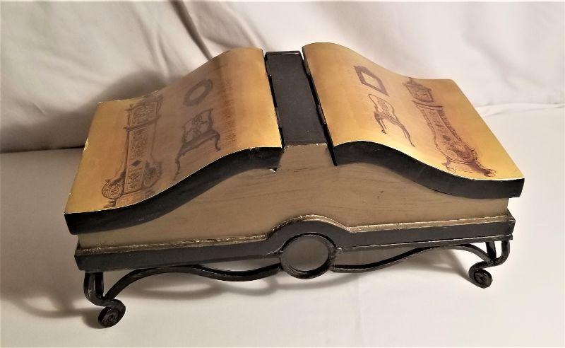 Contemporary decorative hinged casket - metal base - both sides open - clock motif. A bit of minor wear at some of the edges. Has a 34.99 sticker on the bottom from Steinmart. 7" tall, 7.25" deep, 14" across.