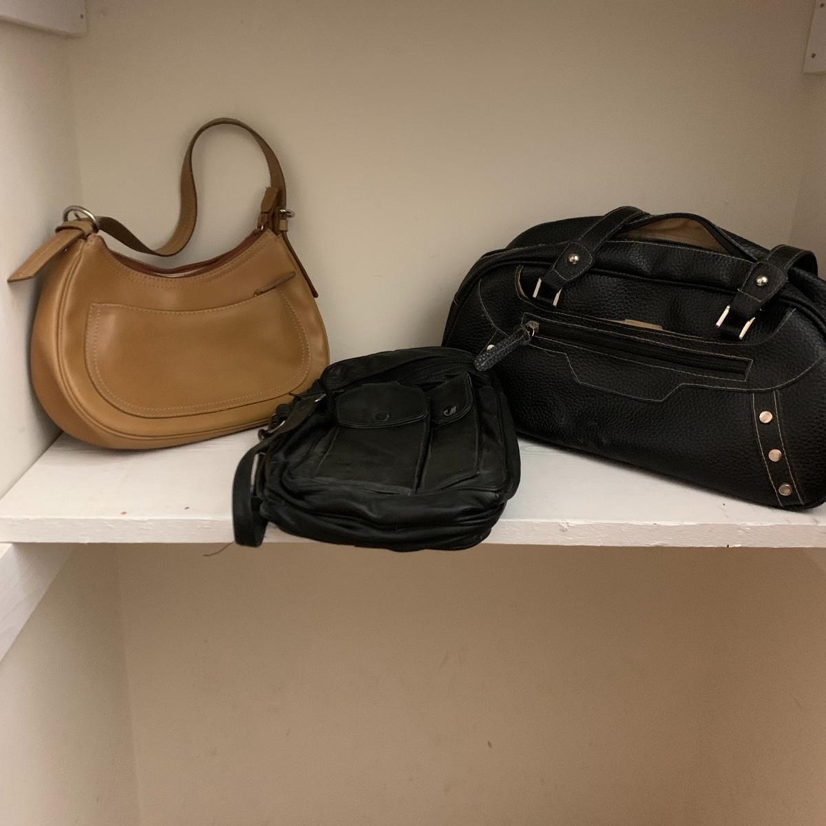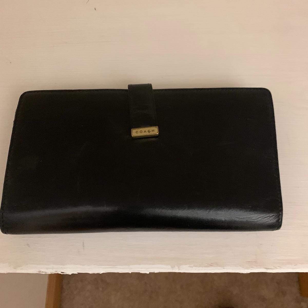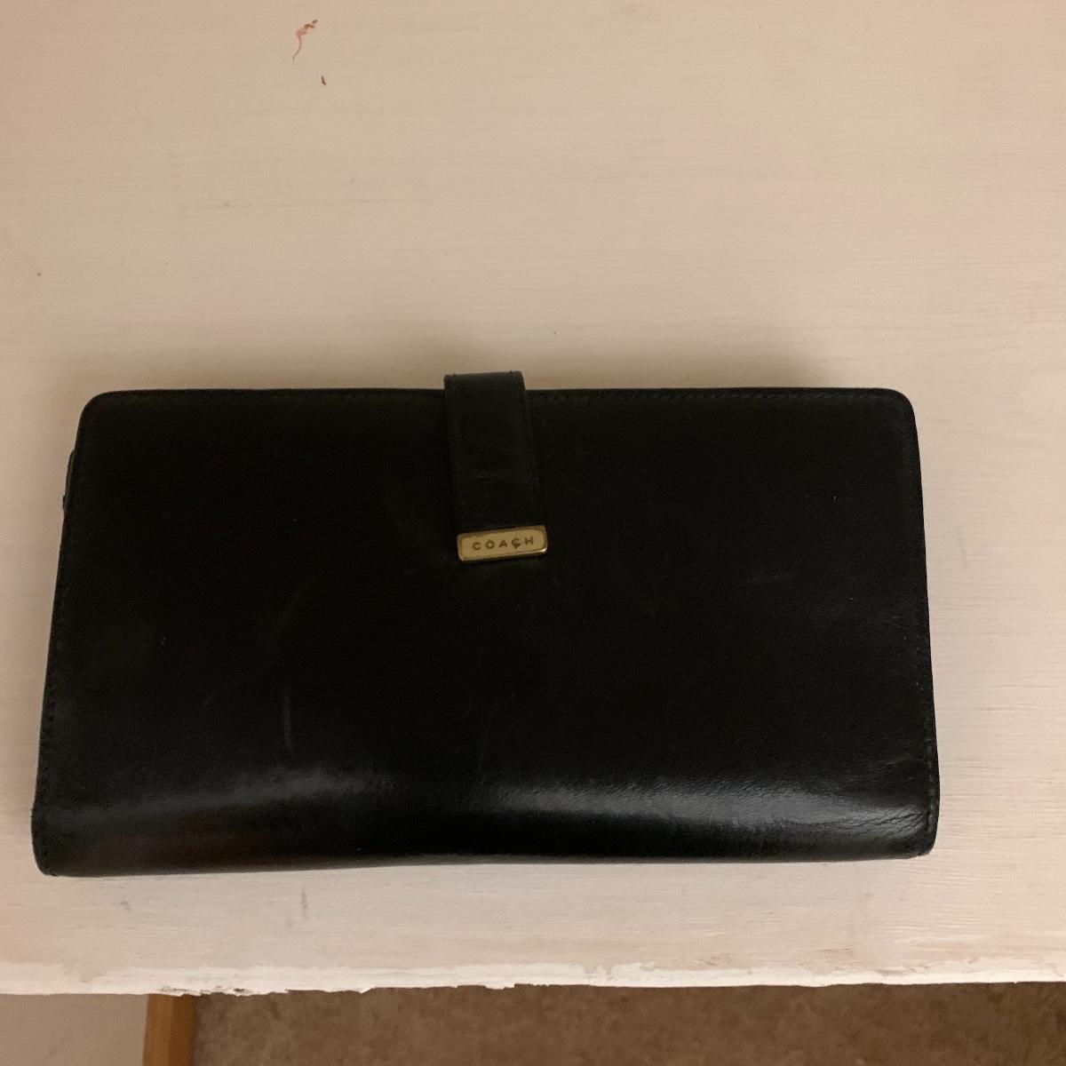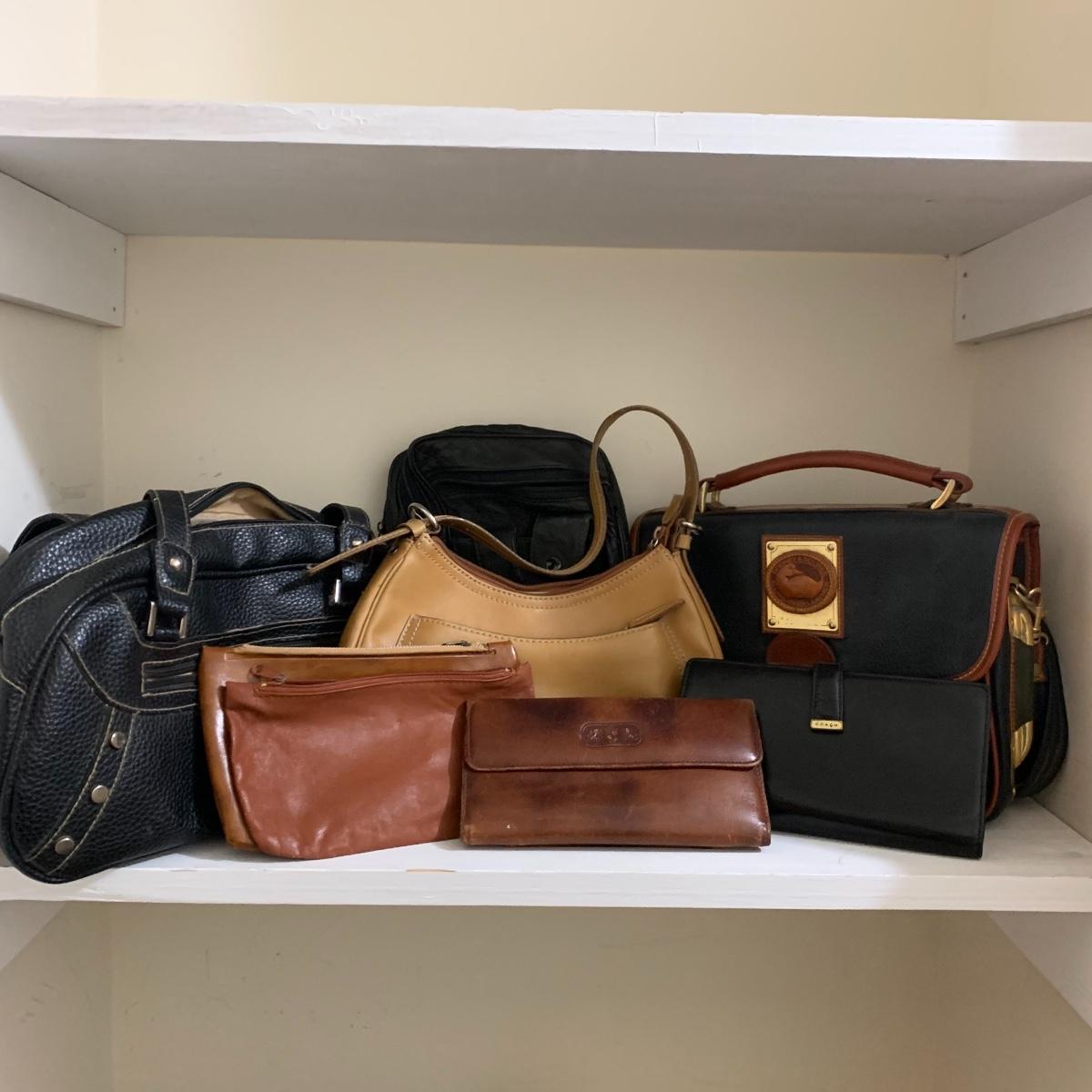 Lot contains three purses and four wallet/pouches. The Dooney & Bourke is a navy blue and camel leather with brass color accents, measures 12” x10” x 4” and is in good condition. Cannot verify if authentic. The black coach wallet is a super silky leather classic also in good condition. Remaining items include a faux leather Nine West handbag, a leather utility bag, two faux leather pouches and one more brown leather wallet with plenty of storage and also in good condition. Shipping available.