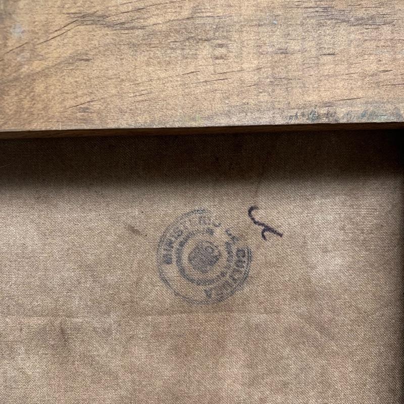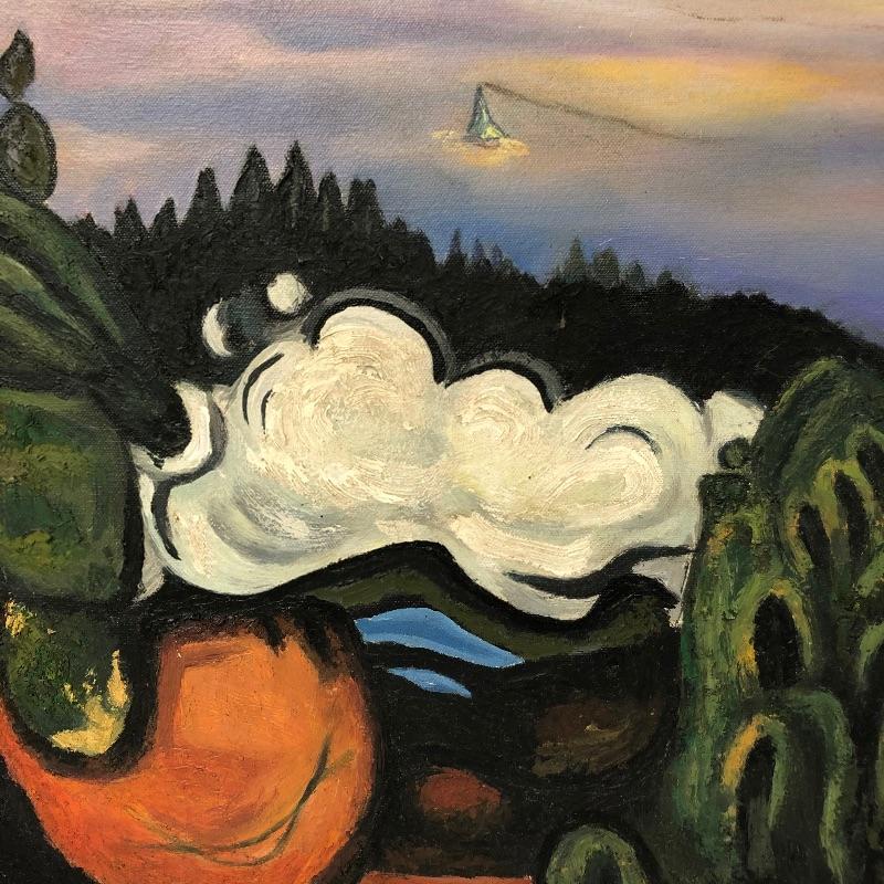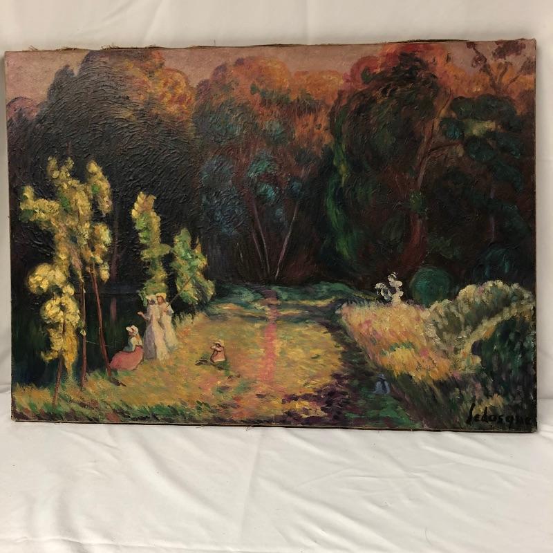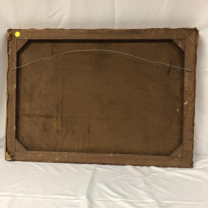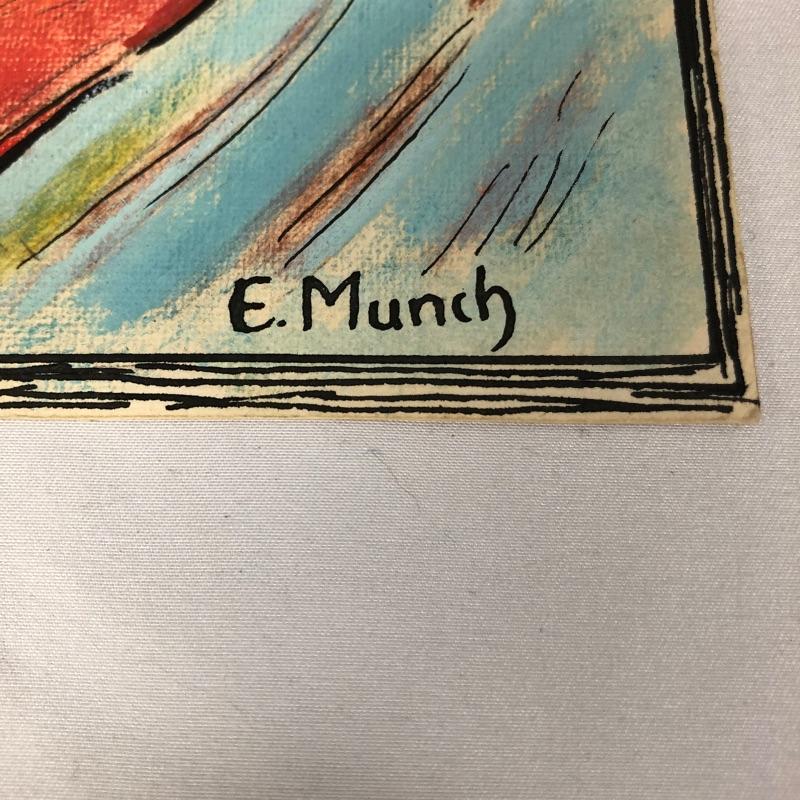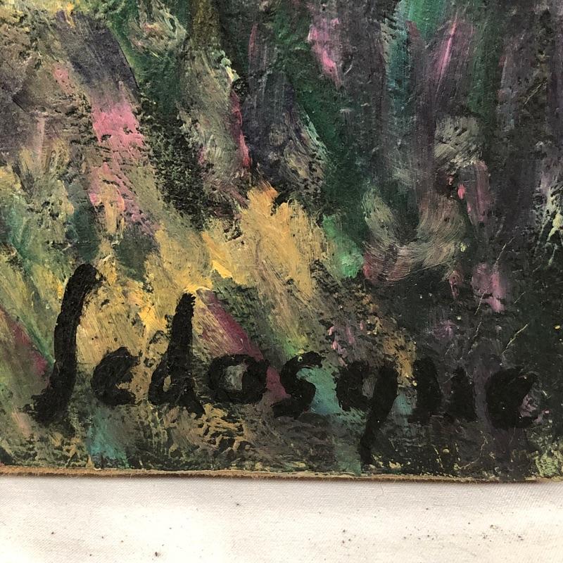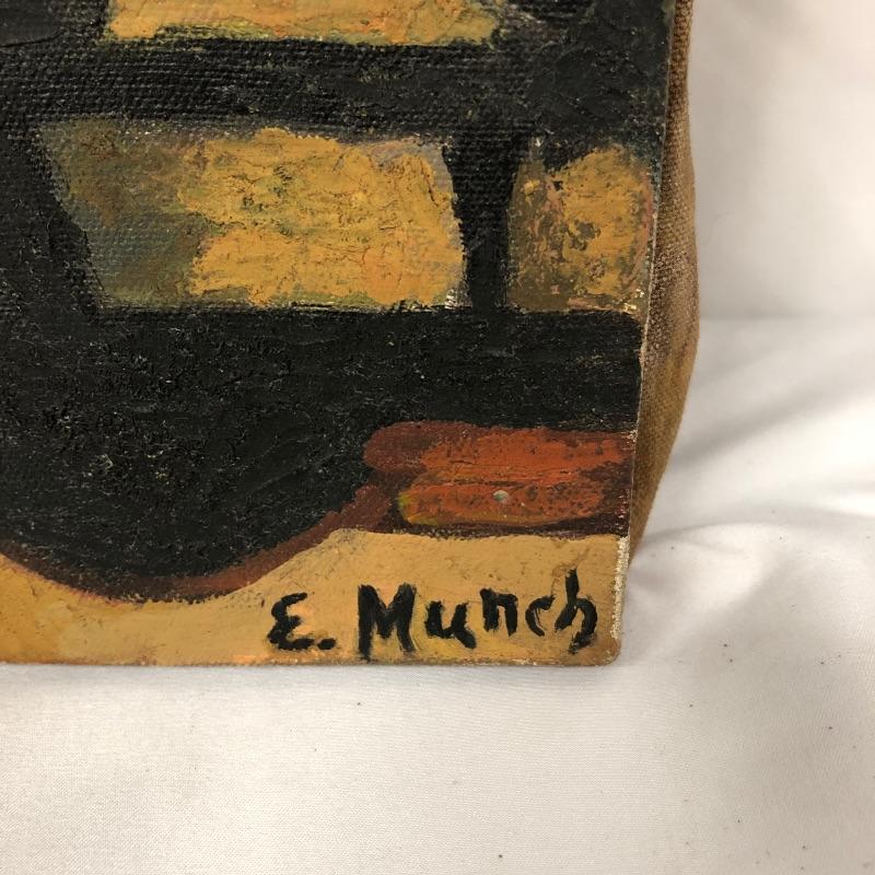 The first painting is done in the style of Edvard Munch's “˜Train Smoke’ is on a canvas that measures 19.75” x 27.75”. We have paired this with another oil on canvas that is signed Sedosque and is the same size. This one has a small round stamp in the back corner. See photo. Both canvases are nailed to wooden frames; the Munch has hanging hardware, the other canvas does not. We have also included a small unmounted painting that is also done in the style of E. Munch. This measures 8” x 11”.