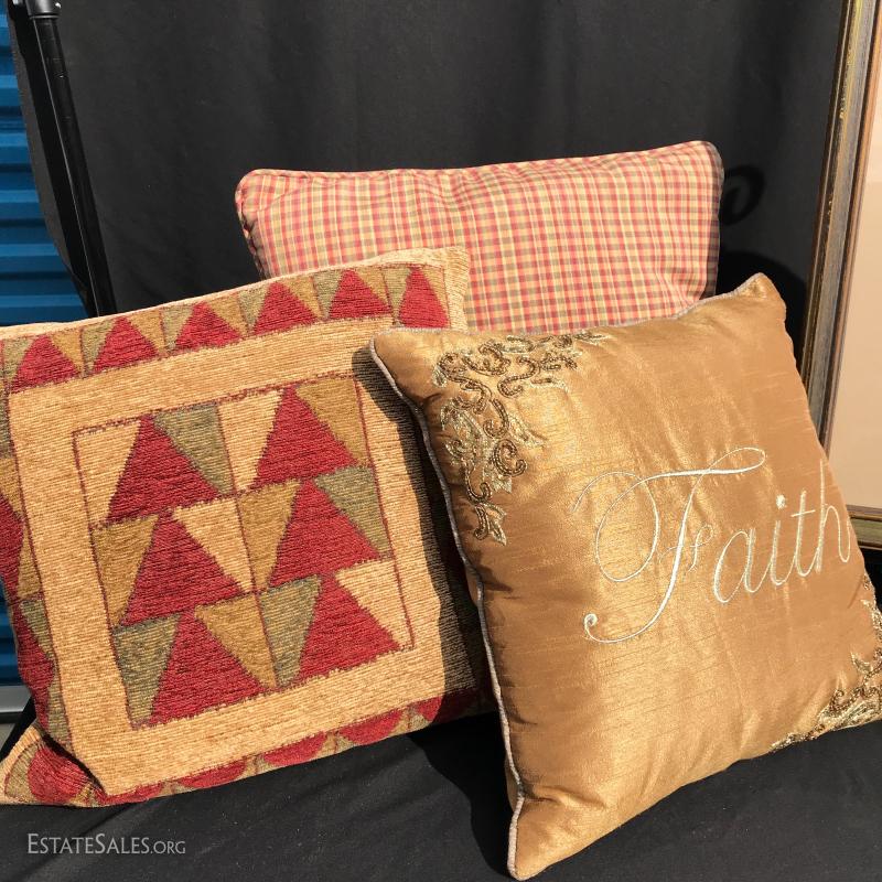 Beautiful red and beige decor. Framed needlepoint measures 20”l x 18.5”w. Three pillows are all approximately 15” squares. Shipping available or local pick up in Asheville, NC.