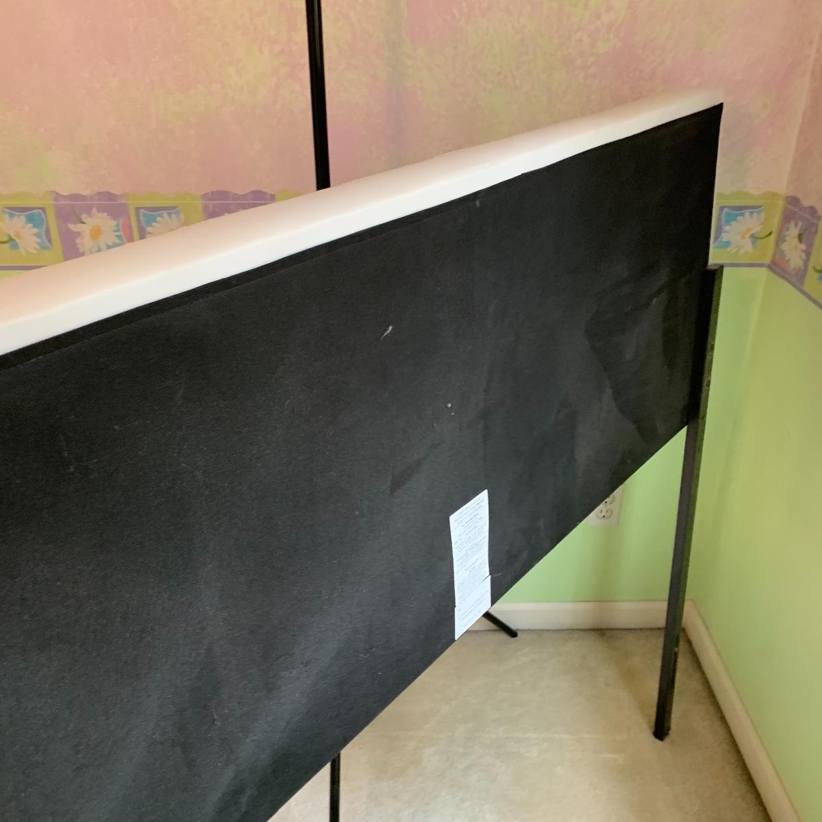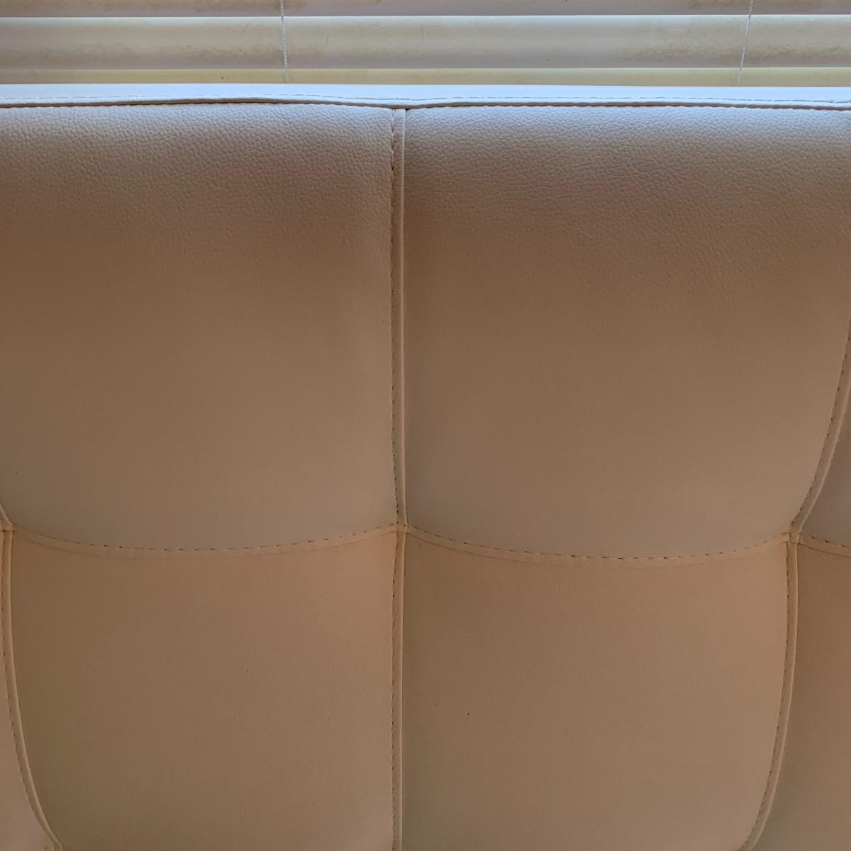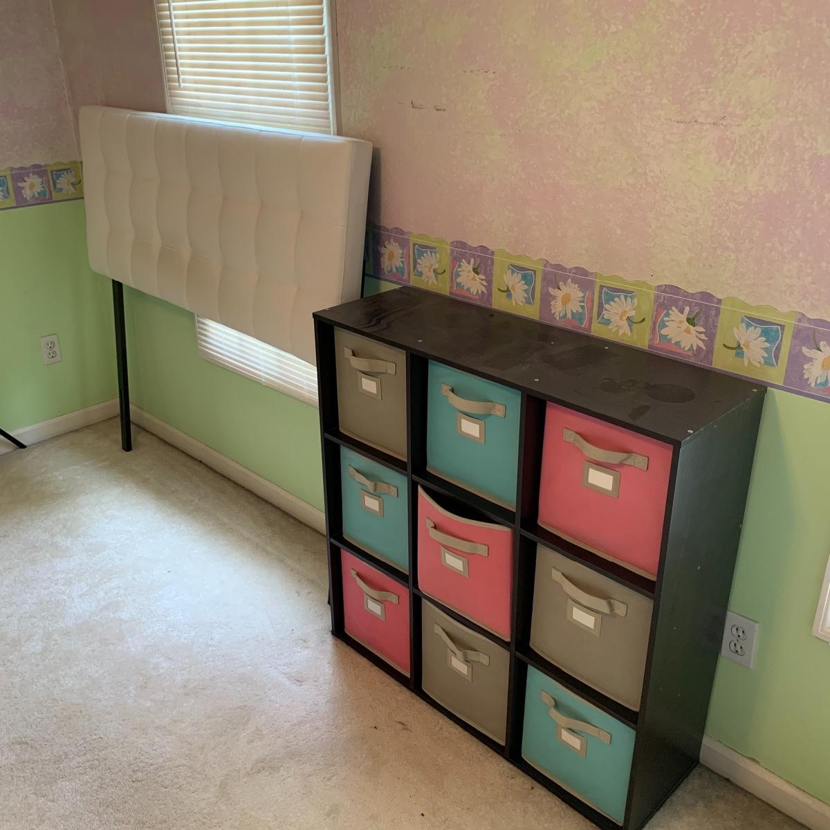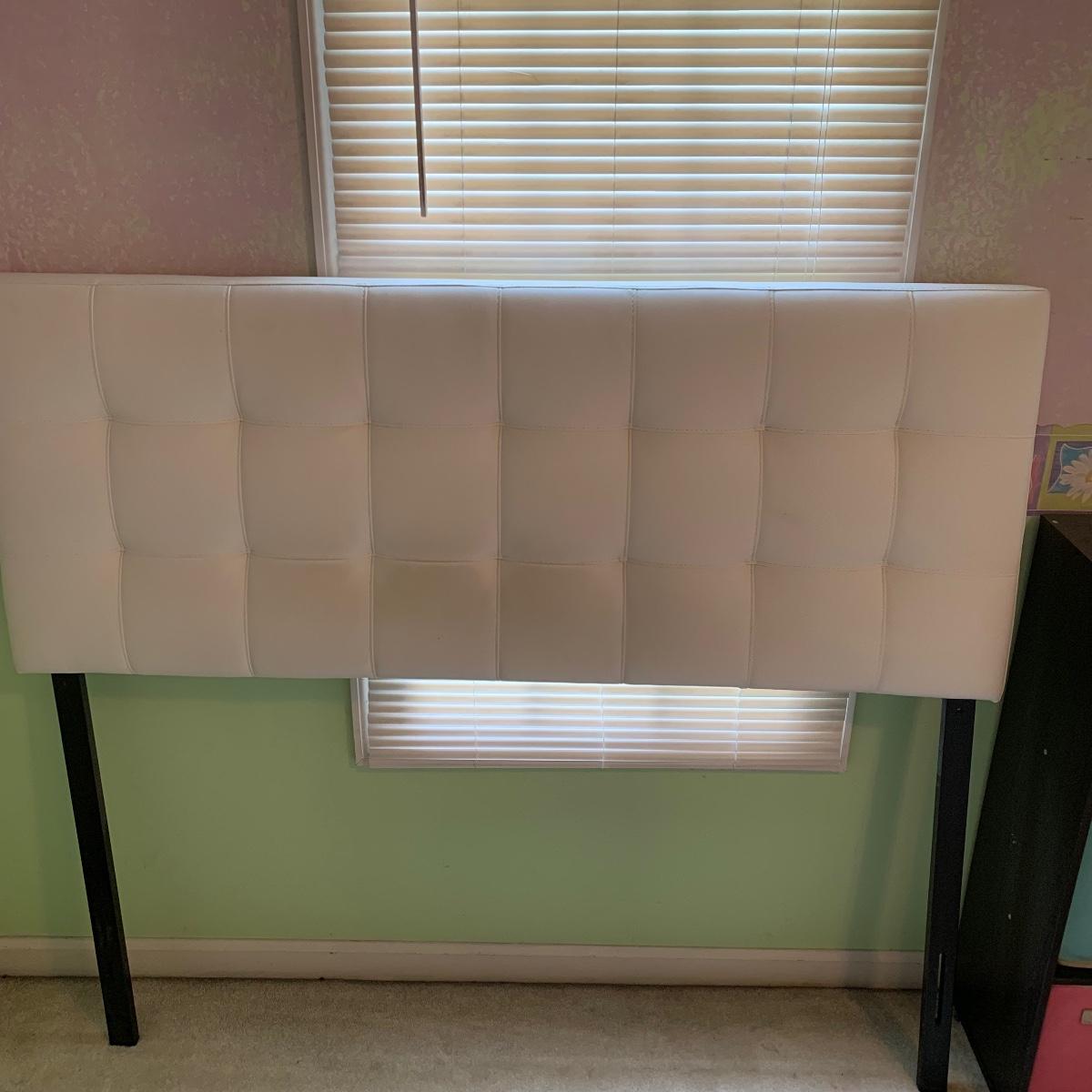 Add a splash of color & class to any bedroom. This lot features a full size headboard clad in white leather style measures 55.5" wide x 3" deep x 49.5" tall. There are a few darker spots on frame that are barely noticeable. This lot includes a like new Kingsdown KD Prime Dumbar Extra Firm mattress and box spring if buyer would like to take. This set is clean and ready for slumber. There is no metal frame to connect mattress to headboard but that's an easy purchase! Next is this cute organizer that includes nine canvas bins. each bin measures 11” square, and the storage case is black and measures 36” wide X 36” tall X 12” deep. Local pickup only. Please note that the brown headboard in photos is not included in this lot.