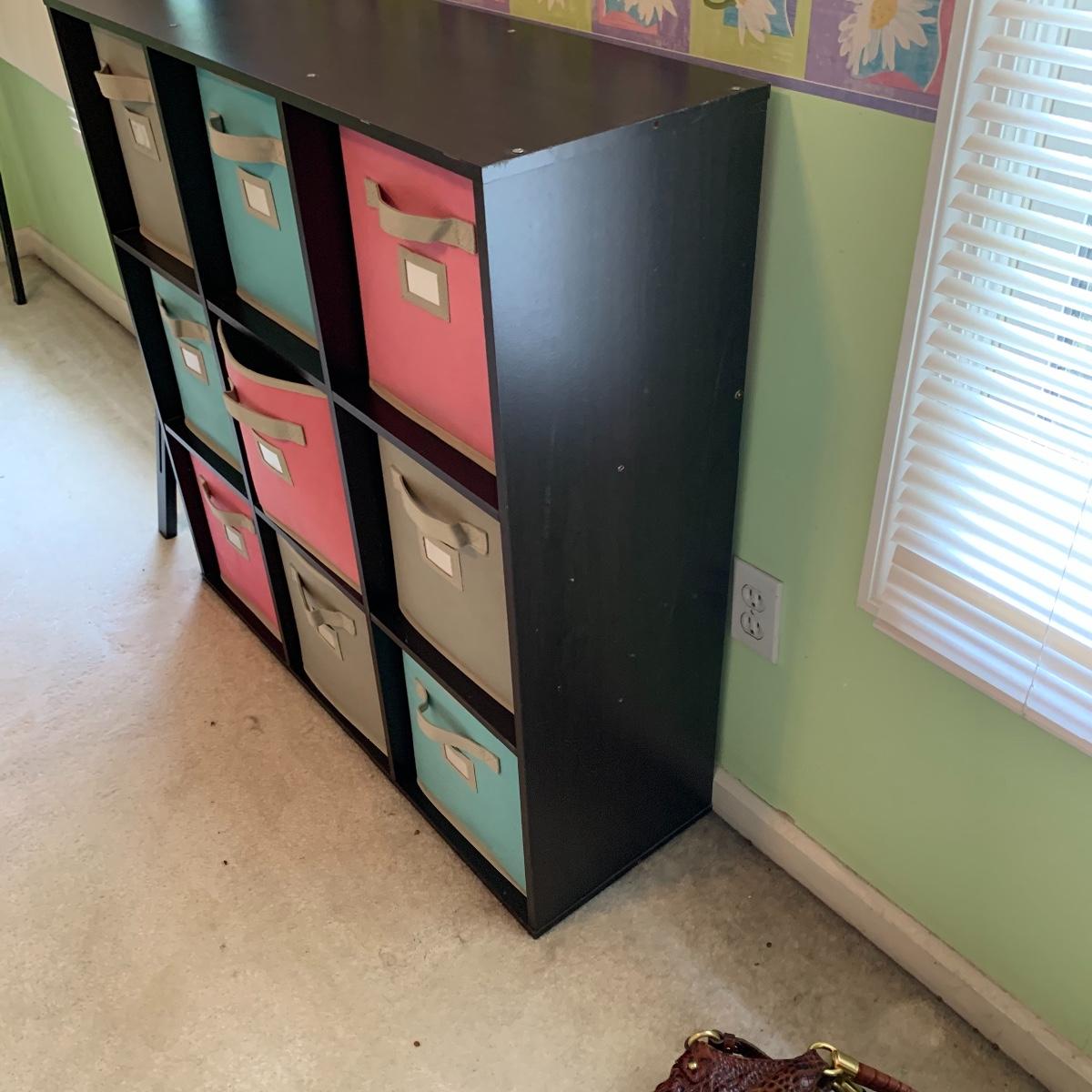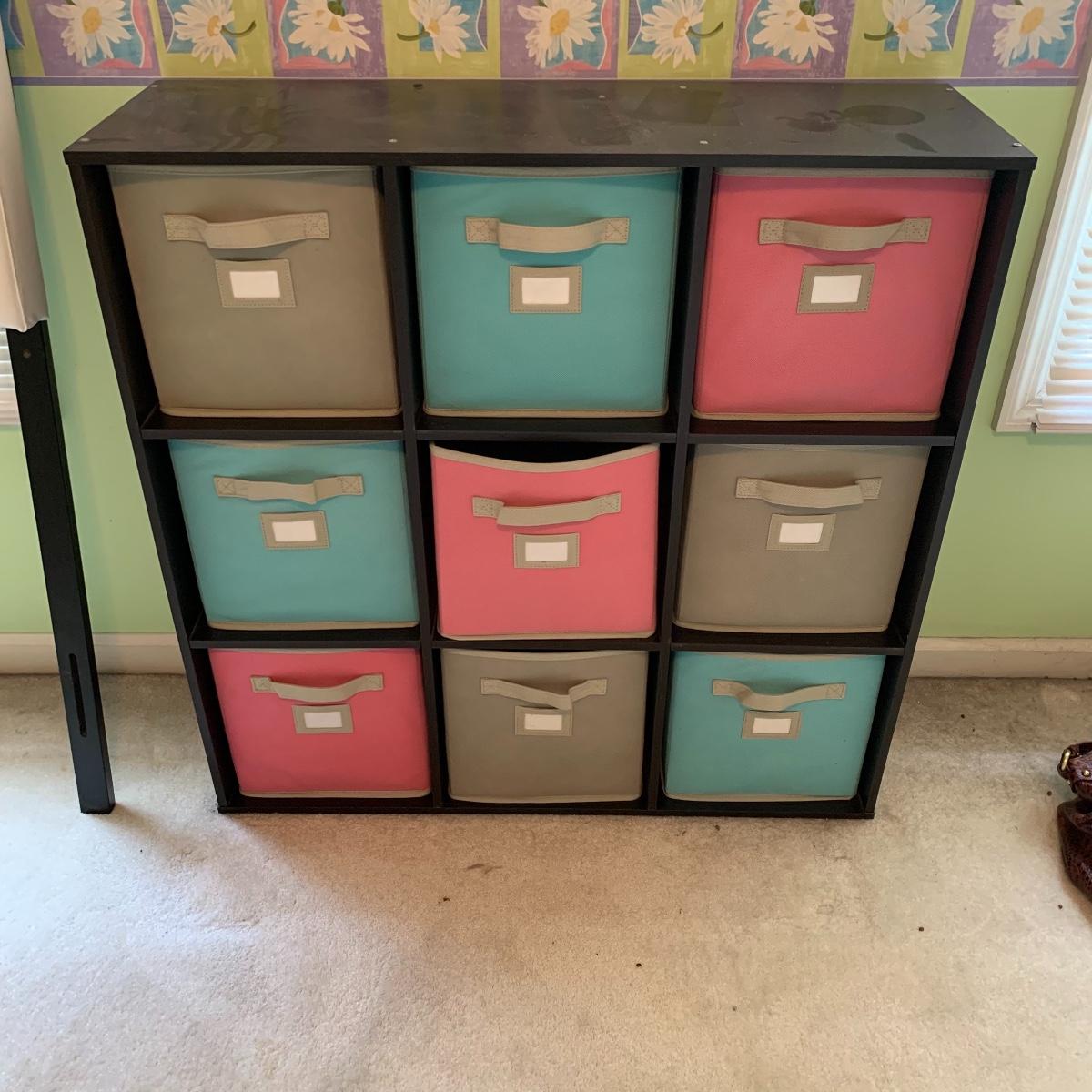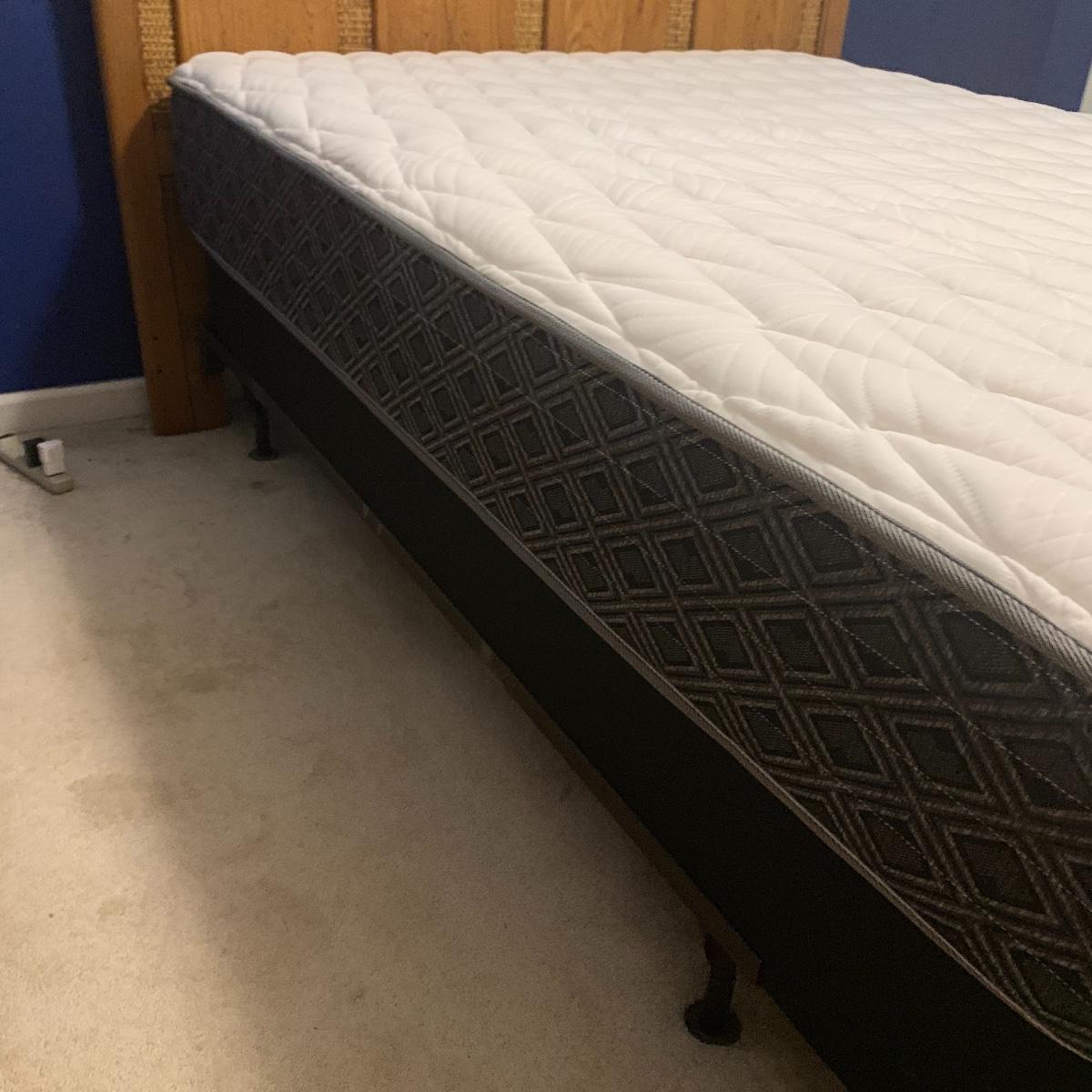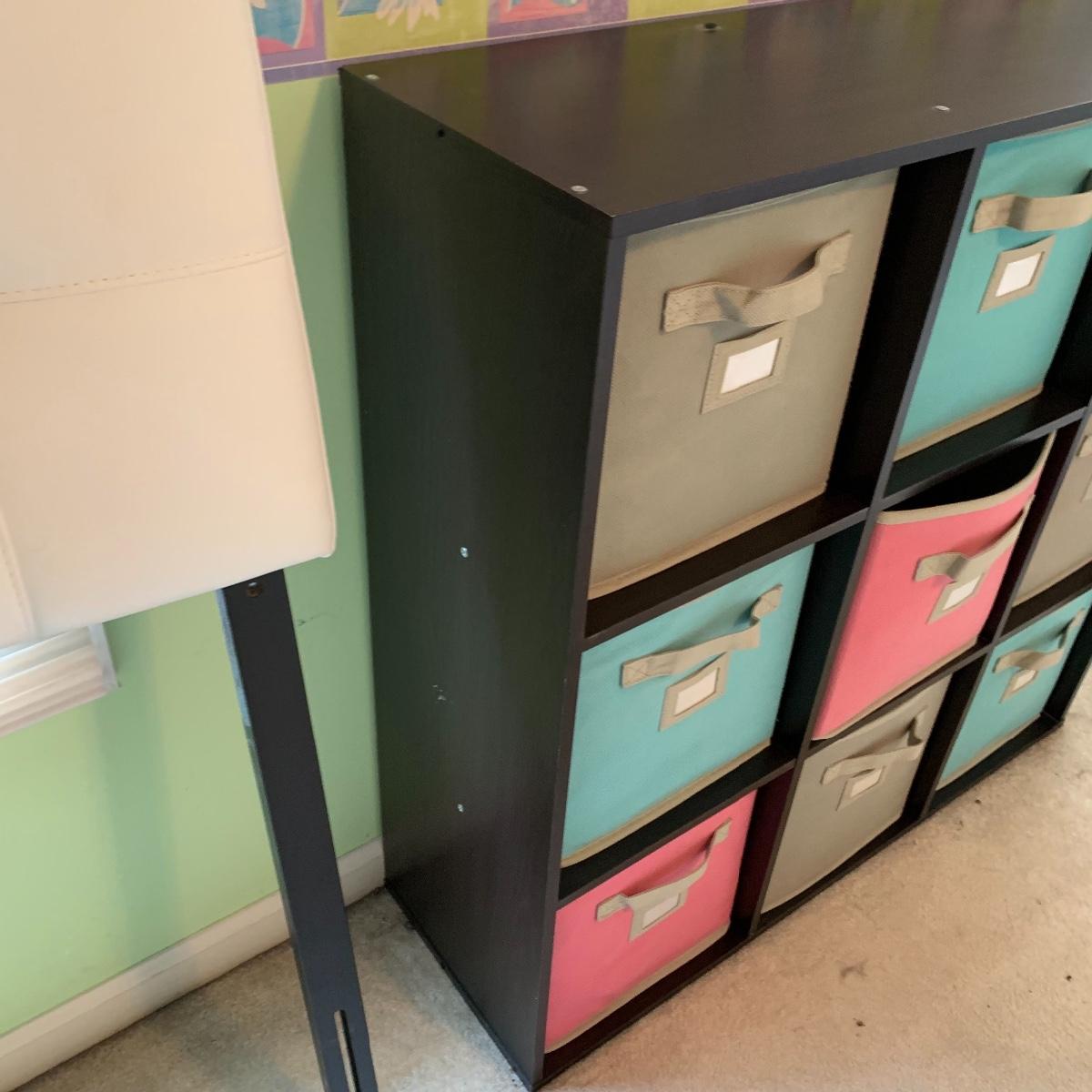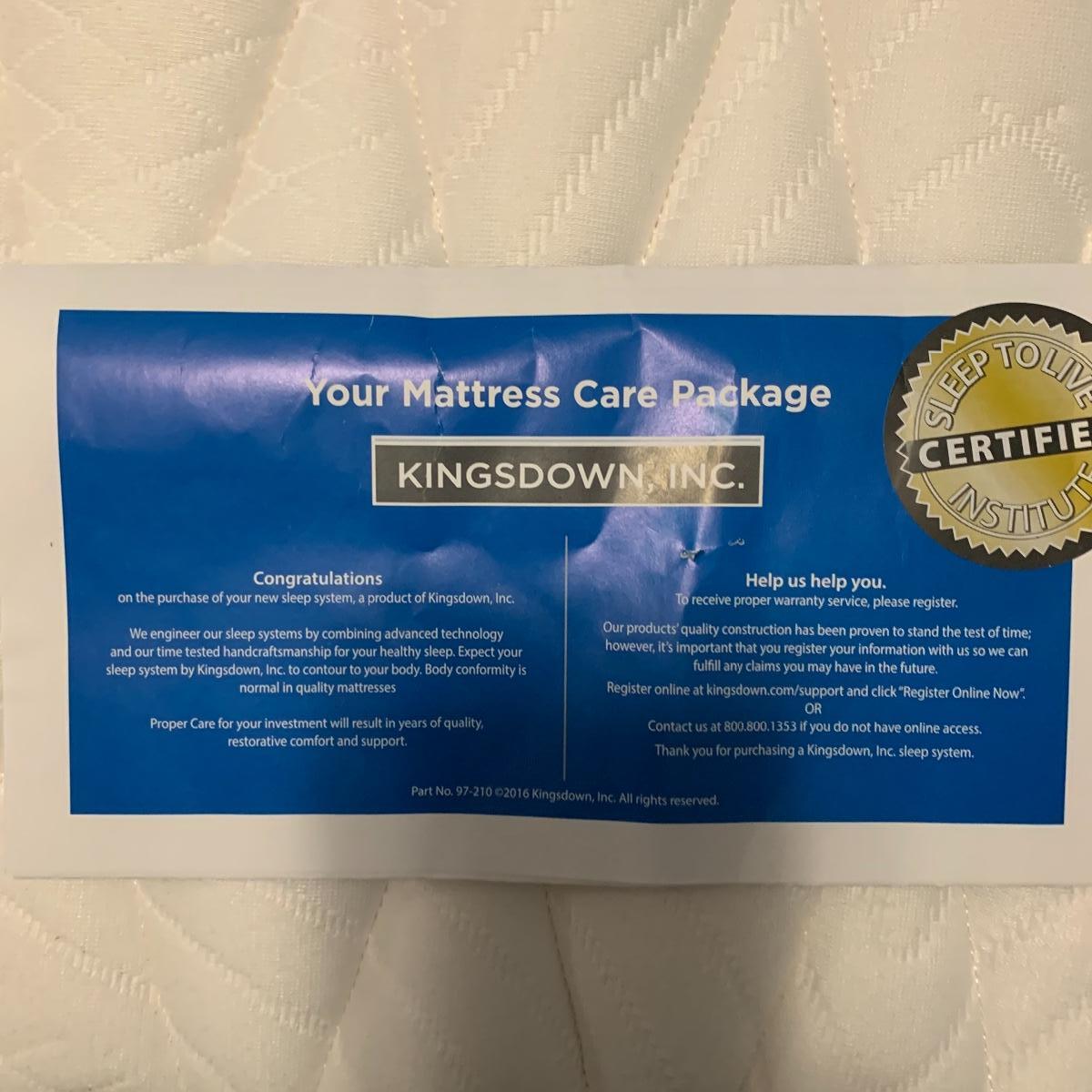 Add a splash of color & class to any bedroom. This lot features a full size headboard clad in white leather style measures 55.5" wide x 3" deep x 49.5" tall. There are a few darker spots on frame that are barely noticeable. This lot includes a like new Kingsdown KD Prime Dumbar Extra Firm mattress and box spring if buyer would like to take. This set is clean and ready for slumber. There is no metal frame to connect mattress to headboard but that's an easy purchase! Next is this cute organizer that includes nine canvas bins. each bin measures 11” square, and the storage case is black and measures 36” wide X 36” tall X 12” deep. Local pickup only. Please note that the brown headboard in photos is not included in this lot.
