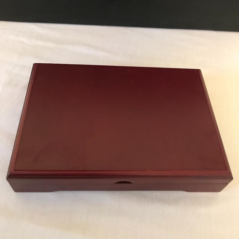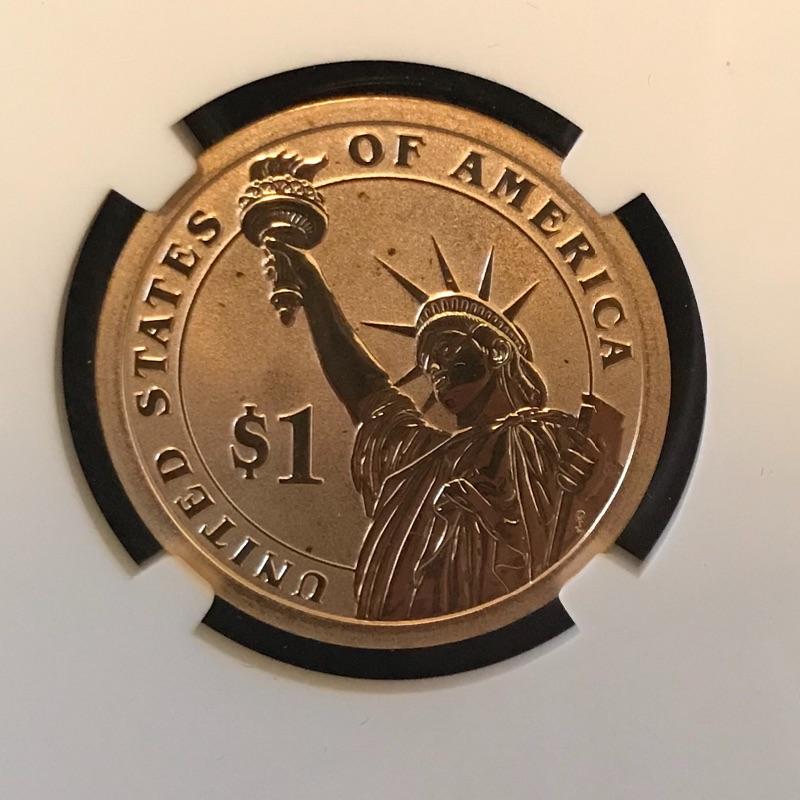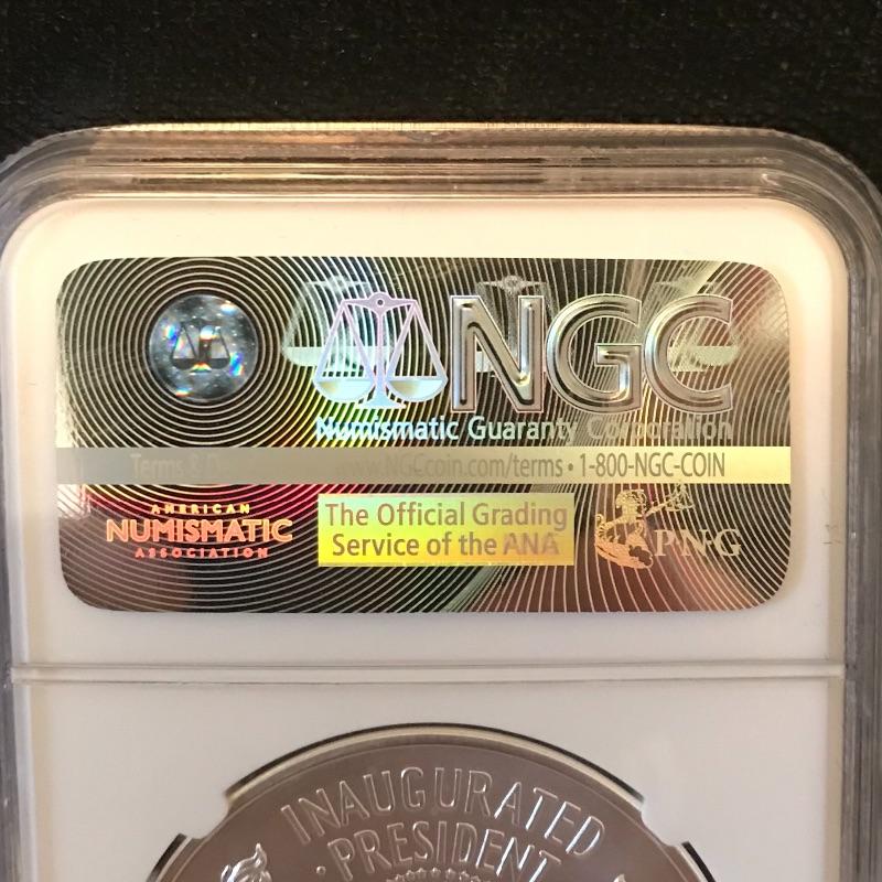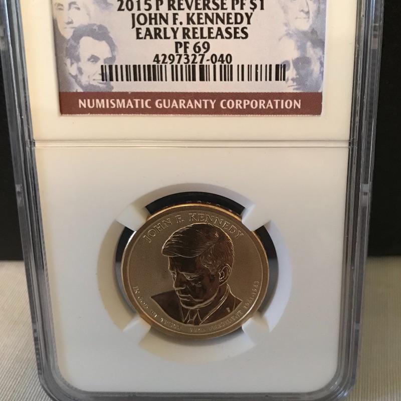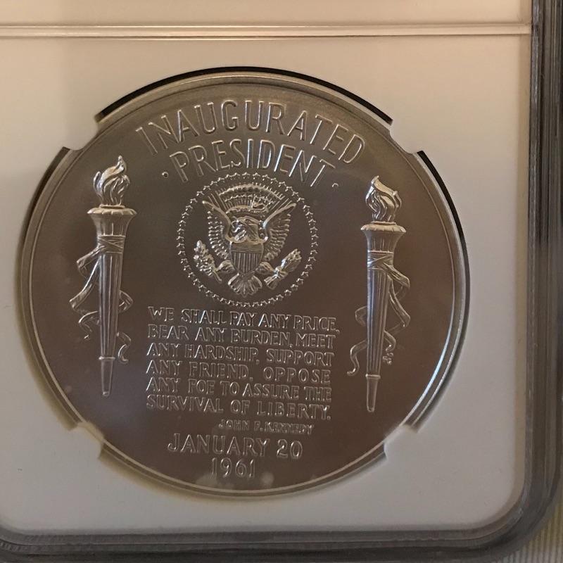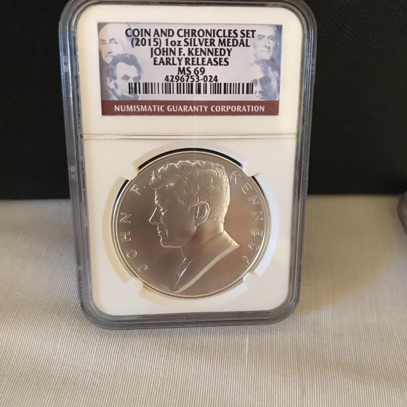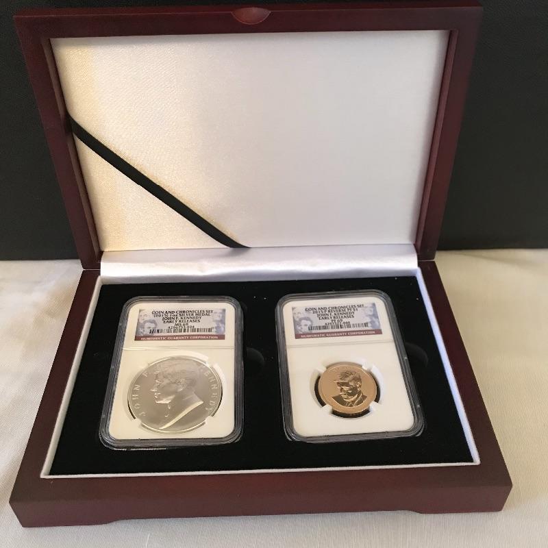 Graded 2015 Kennedy Chronicle Set. Two one-ounce .999 silver, one legal tender reverse proof and one inaugural medal replica. Box measures 7.5” x 5.25” x 1.5”.