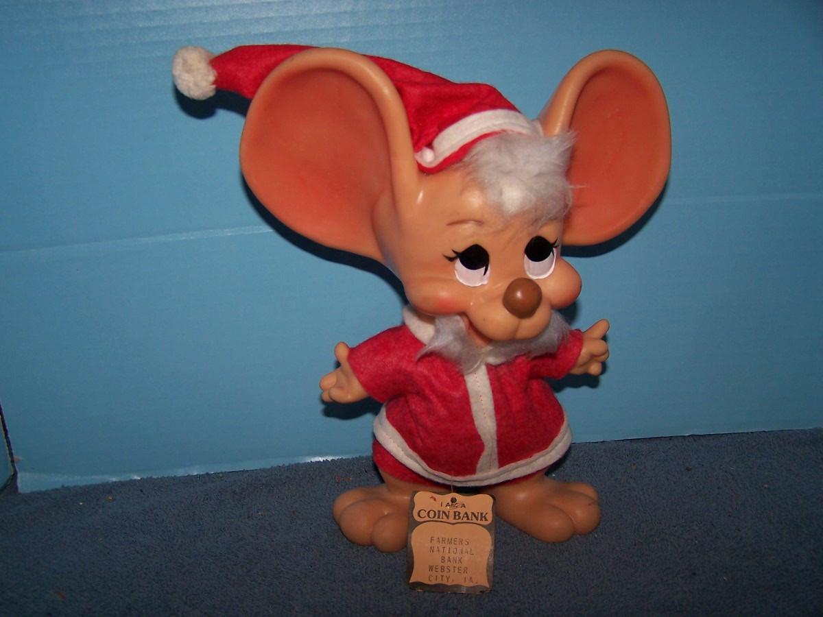 THIS IS A GREAT 1970 SANTA CLAUS MOUSE PLASTIC ADVERTISING BANK!!! 10 1/4'' TALL.. LIGHT WEAR..