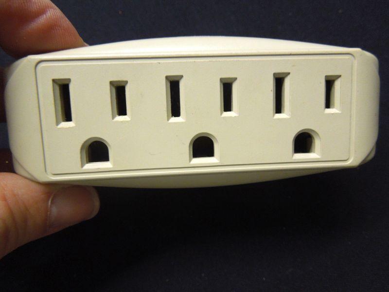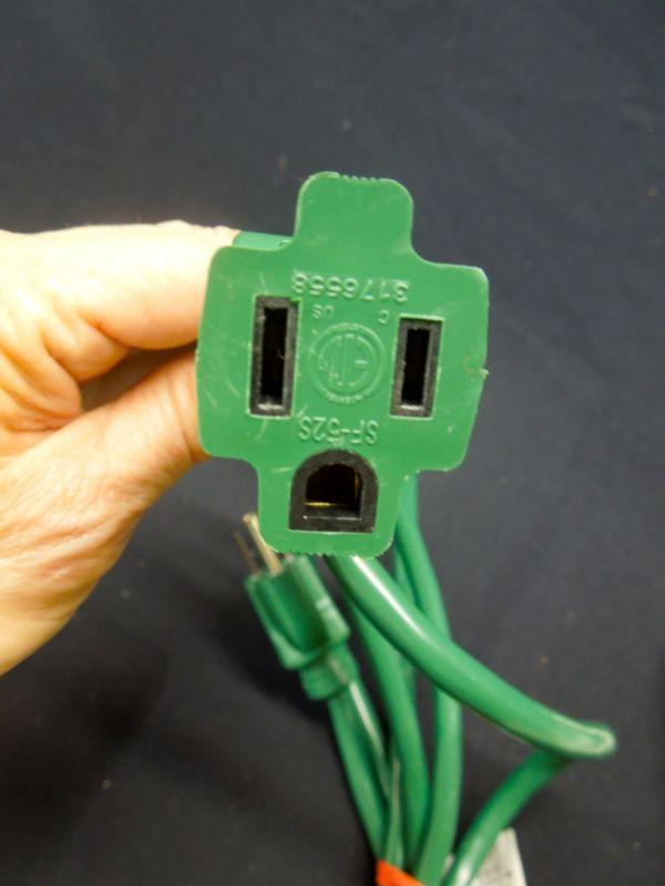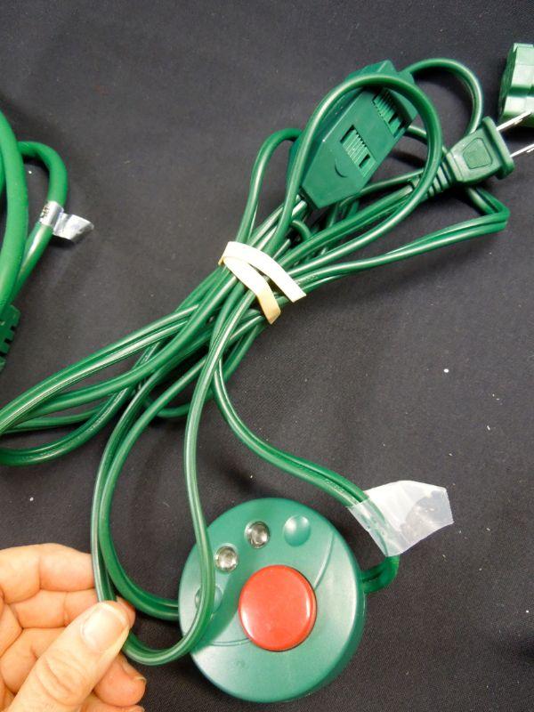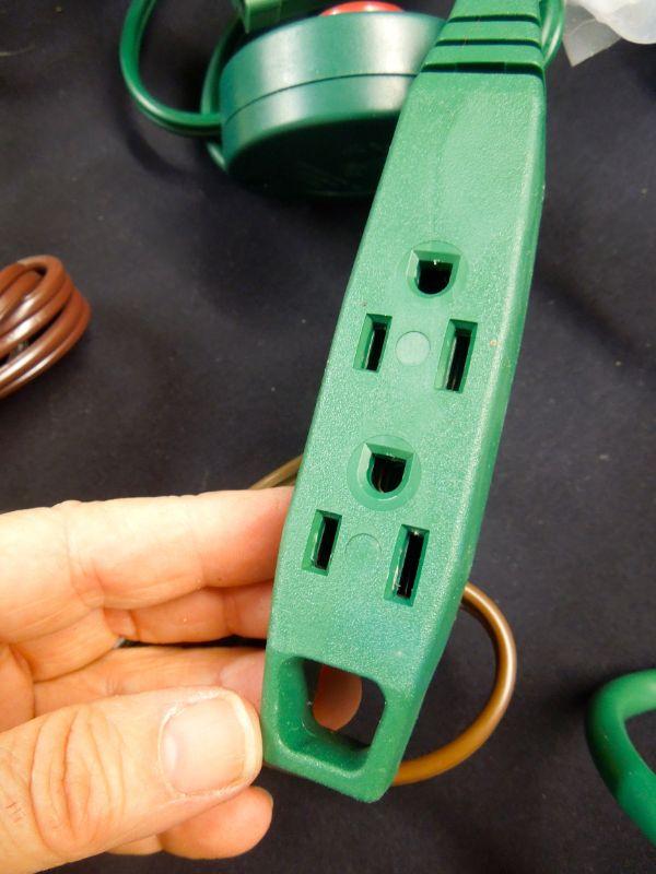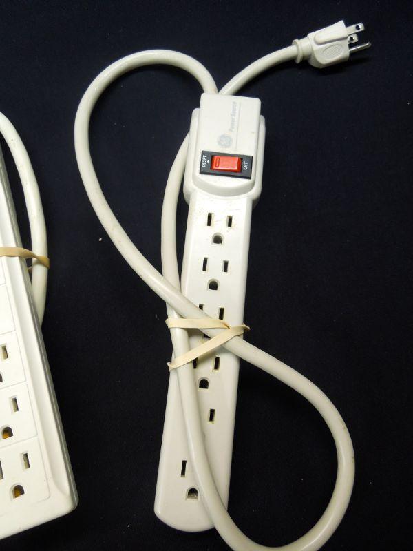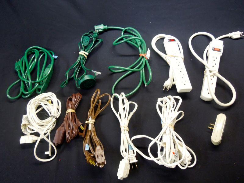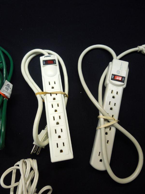 Two power strips; eight extension cords. Plastic storage box 17" x 16"