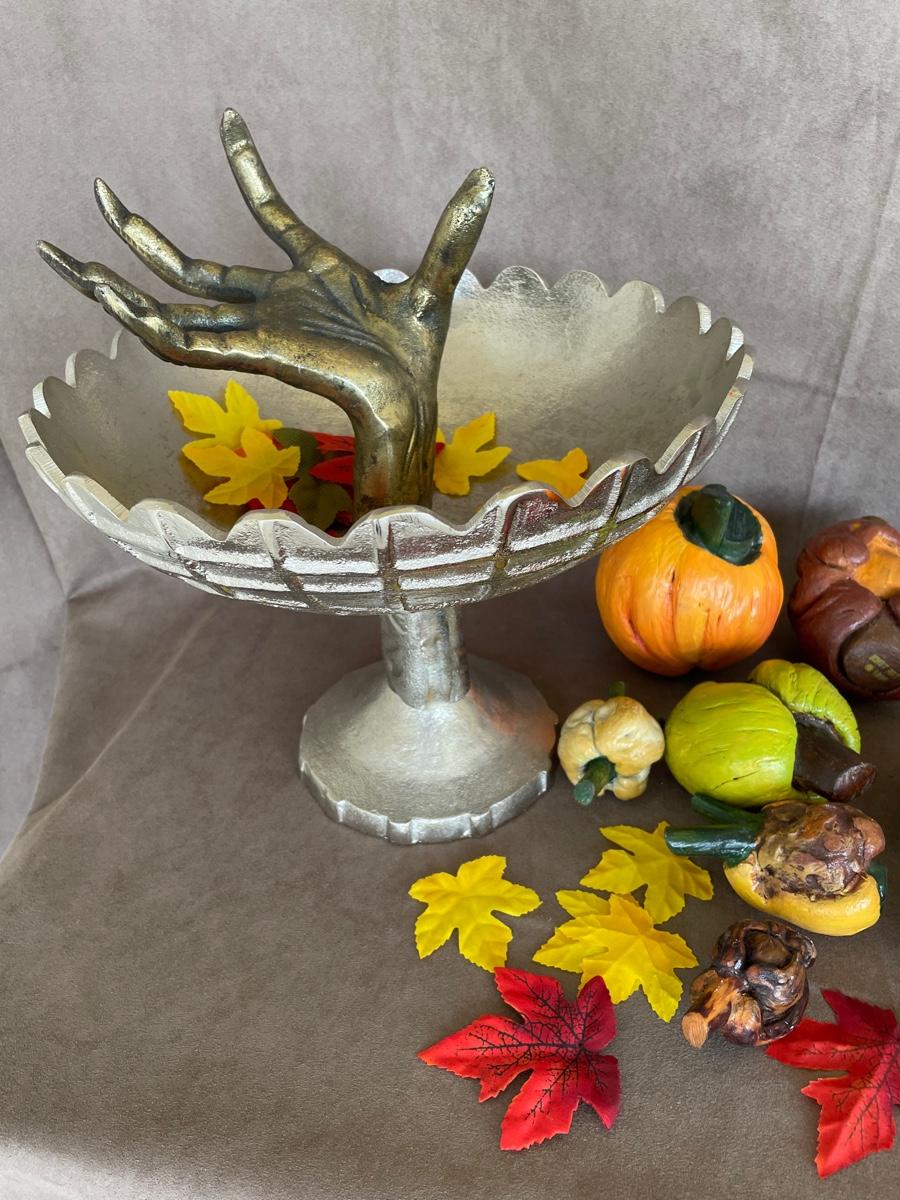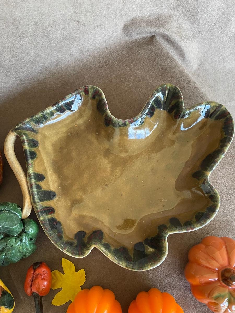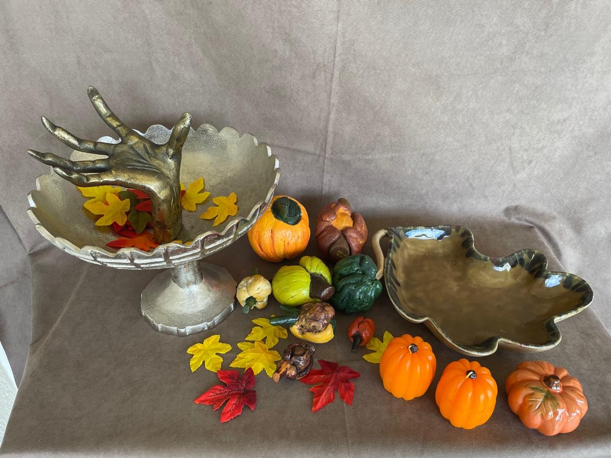 Leaf motif Hall Pottery bowl/platter, a metal bowl with a hand coming out of it, a few pumpkin candles and some ceramic gourds
