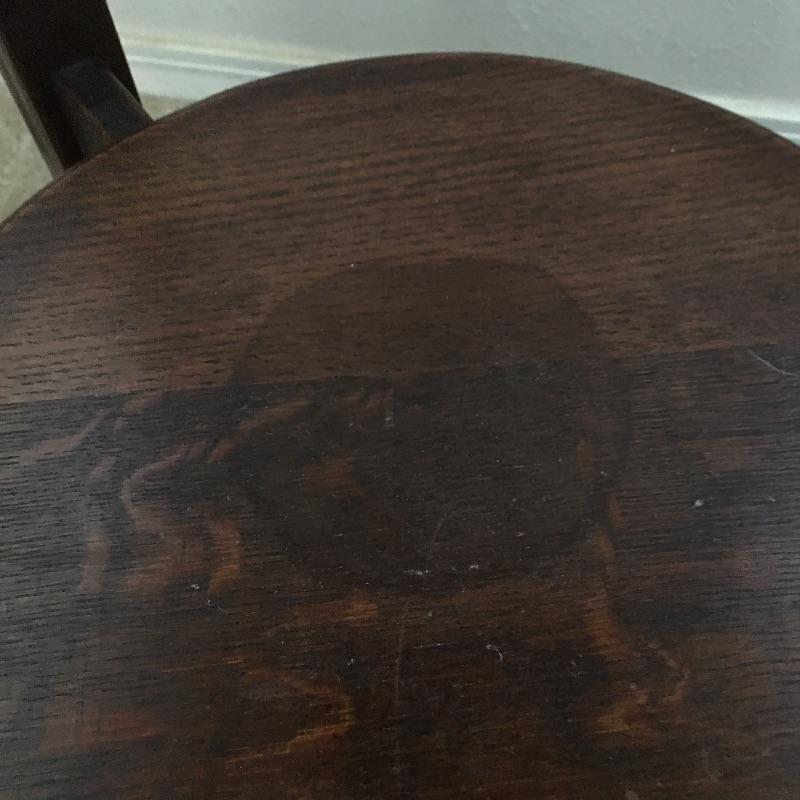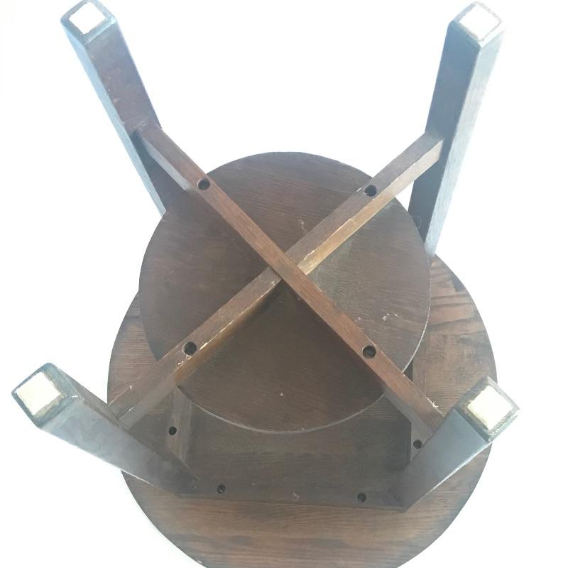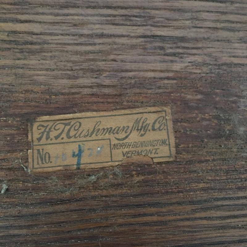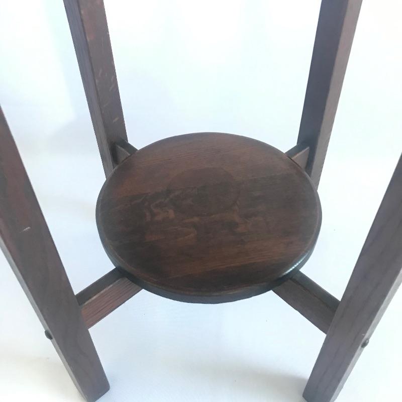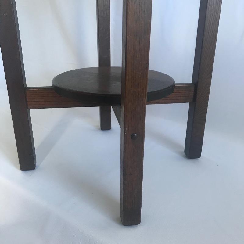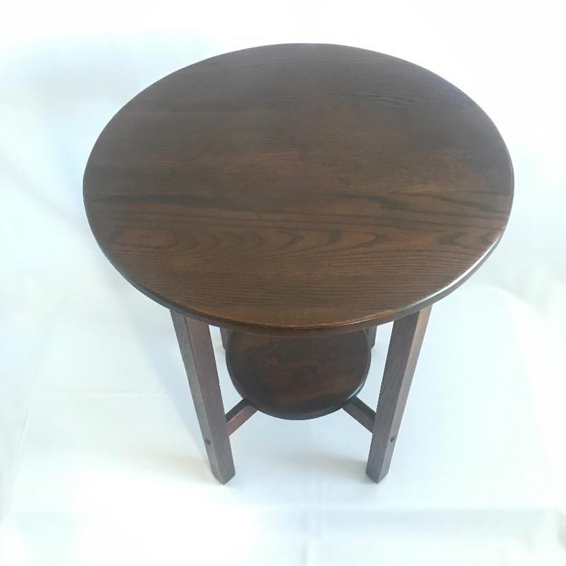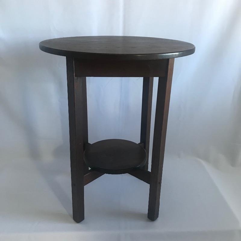 H.T. Cushman round Craftsman table with shelf. True craftsmanship can be seen in this striking table with a shelf. The shelf has a circular discoloration, see pictures. Don’t miss out this awesome piece of Americana. Table measures 29.5” tall with a 24”D.