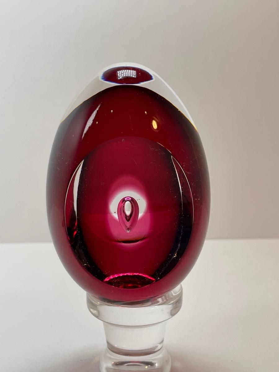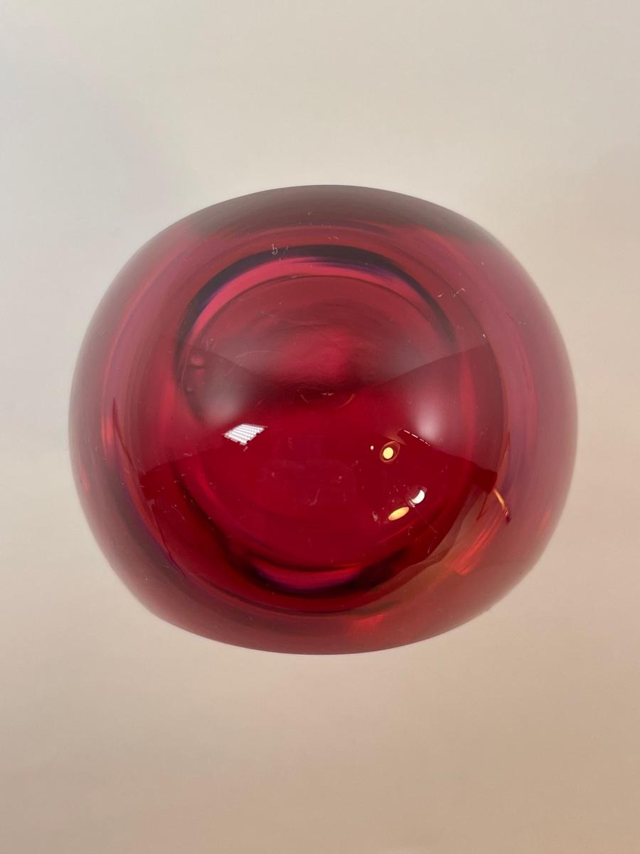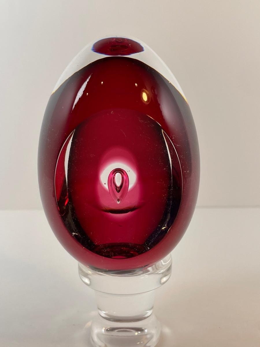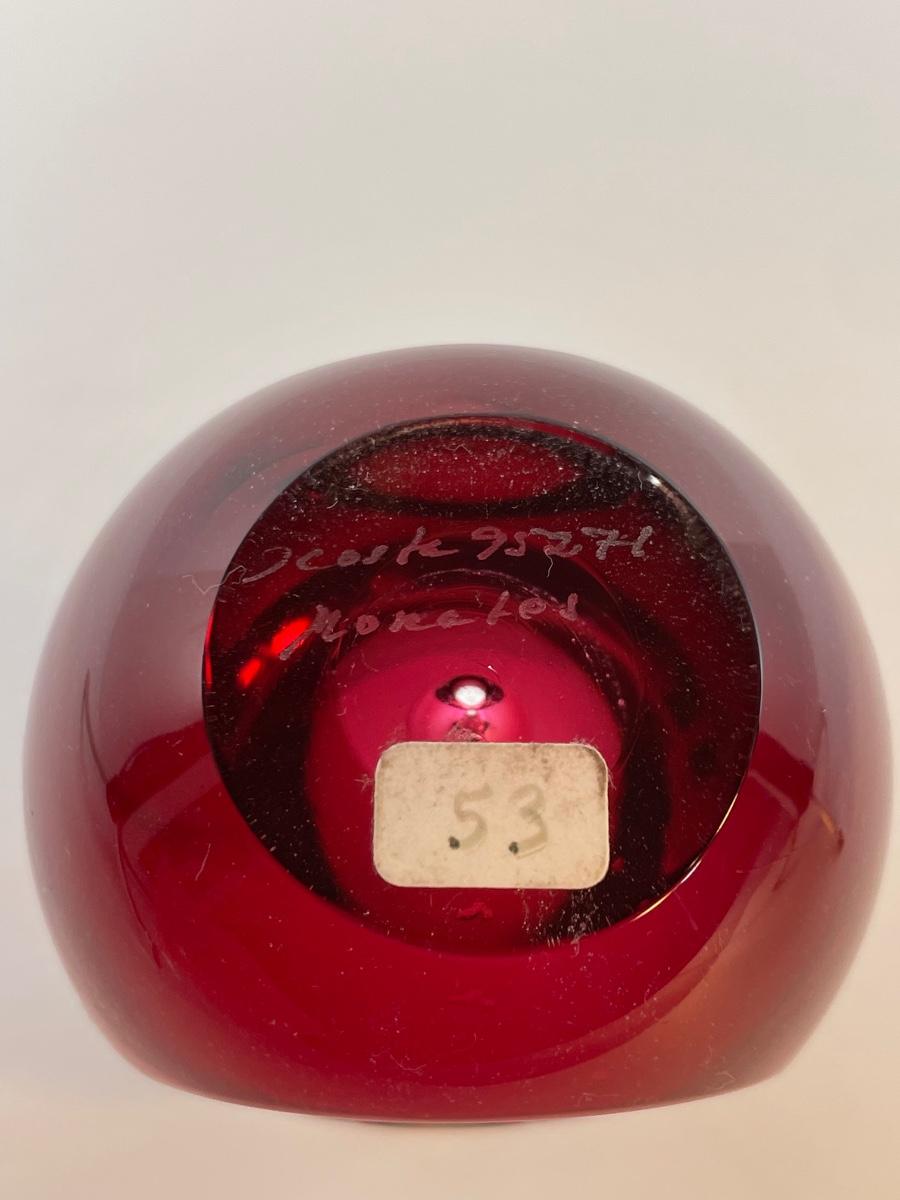 1973 Signed Mona Morales-Schildt Kosta Boda sculpture in translucent Ventana red glass with teardrop in center. Bottom has "Kosta 95271 Morales"