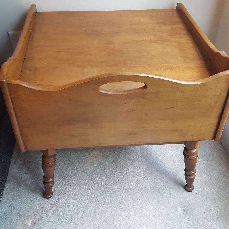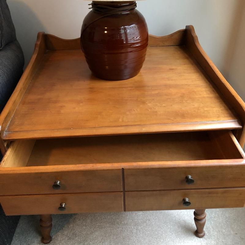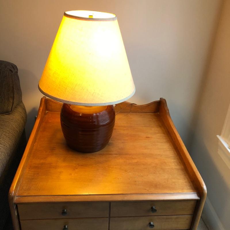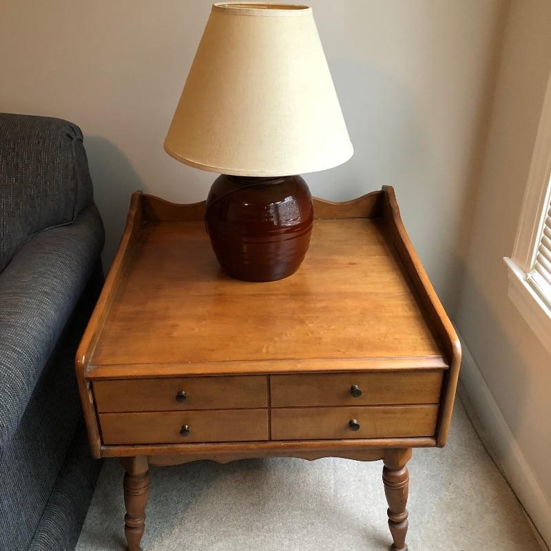This lamp and side table combo is perfect for a bedside table or living room accent. The wooden side table (21.5” tall) is in great condition, with one large drawer and 26” x 25.5” of surface space. The lamp works when plugged in and is a beautiful ceramic base and large lampshade that creates great lighting.