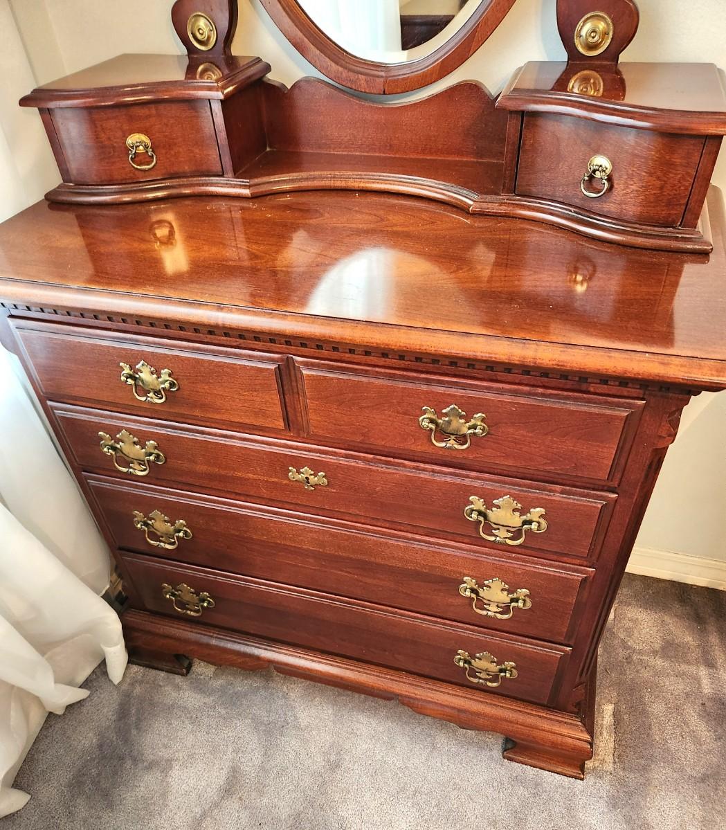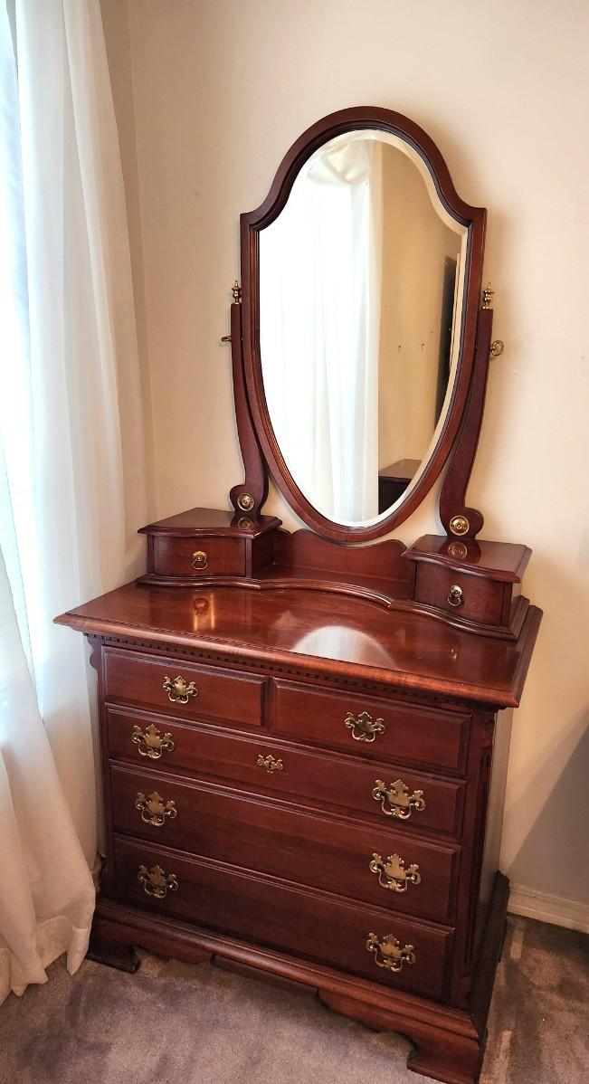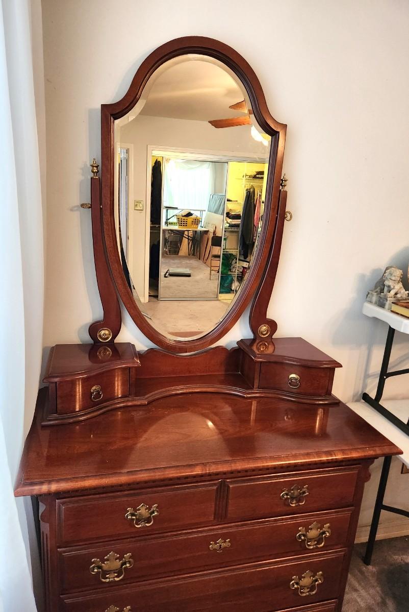 This piece is a real beauty - classic design by Lexington furniture company - 6 drawer dresser, over beveled mirror, gently used condition. 38" across, 34" tall without mirror, 75" tall with mirror.