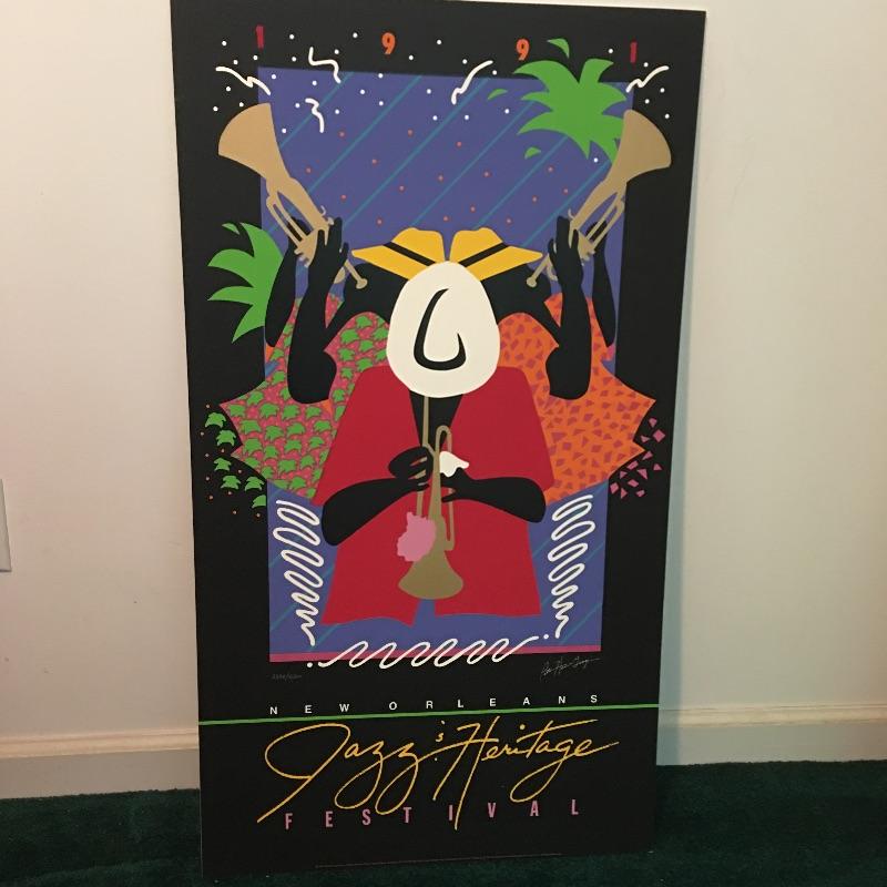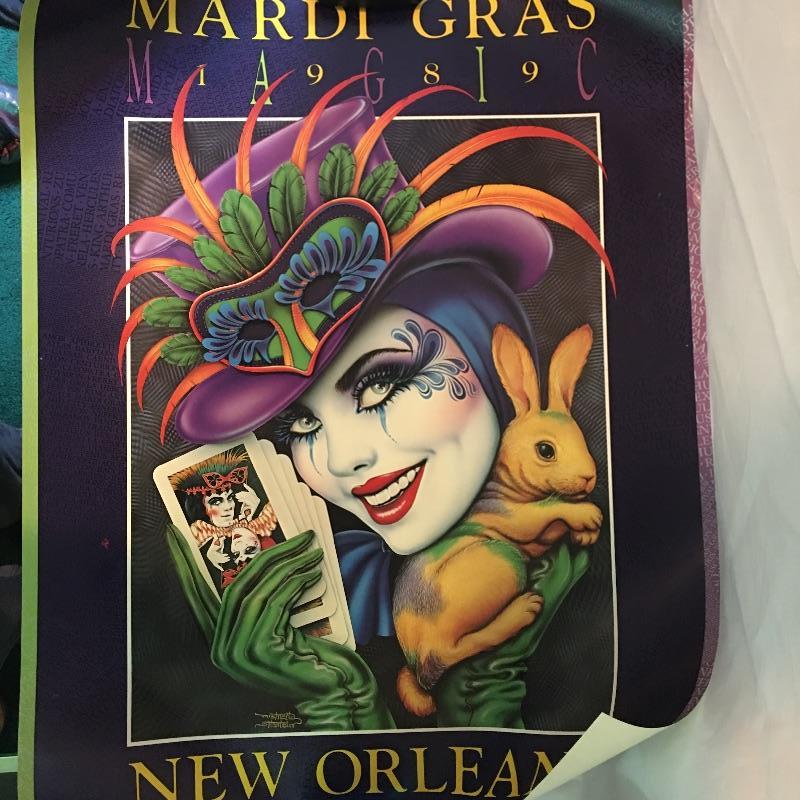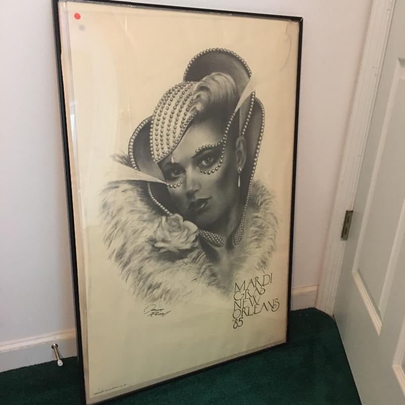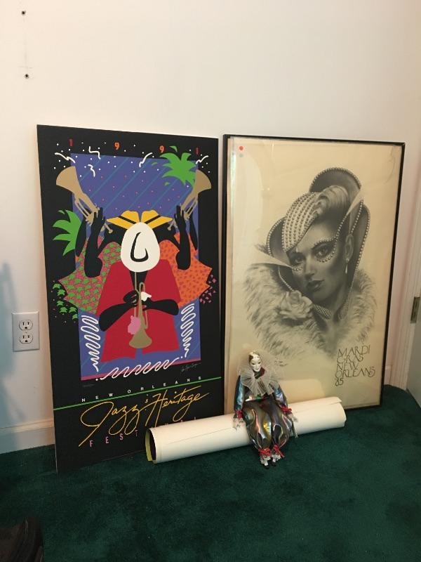 Colorful Mardi Gras array so fun you can almost hear the music! Lot includes framed poster, a rolled poster, Dollcrafter doll and a Jazz festival poster on foam board. Frame measures 24” x 36”. Framed poster has Russell James signature, but unsure if printed or original. Plexiglass on framed poster is cracked and will need a new frame, see pictures.