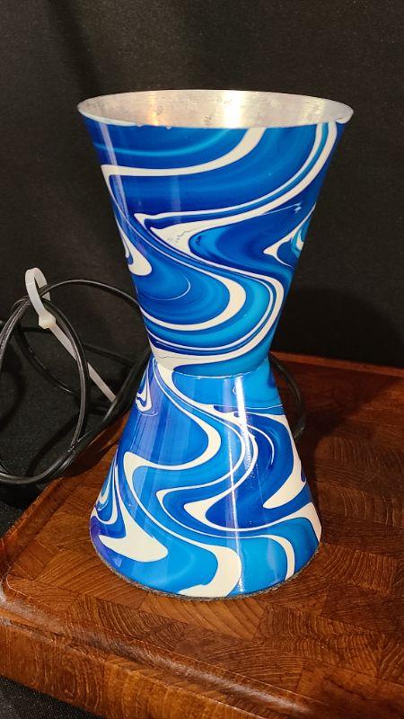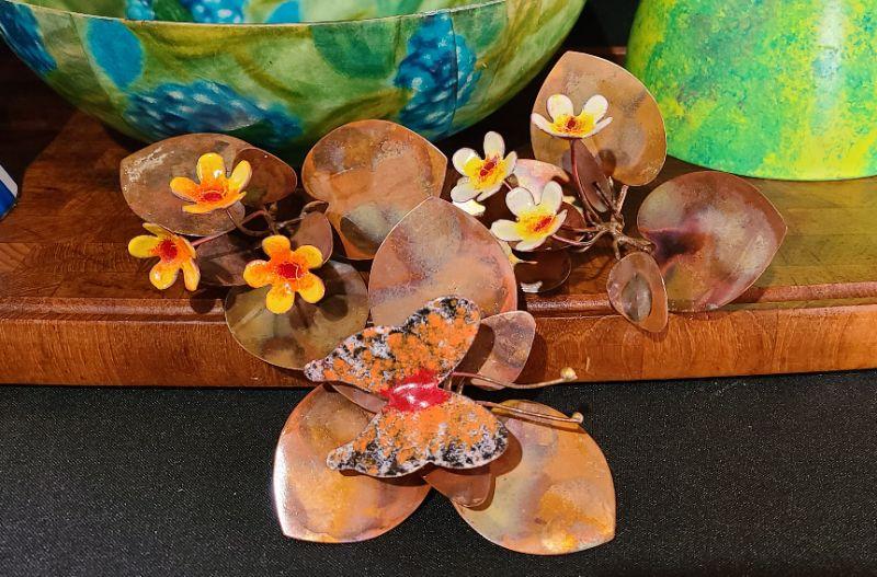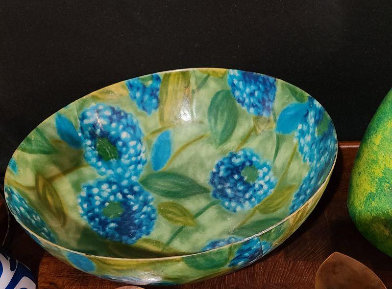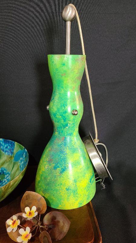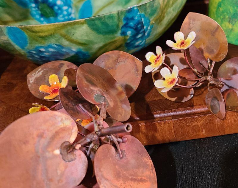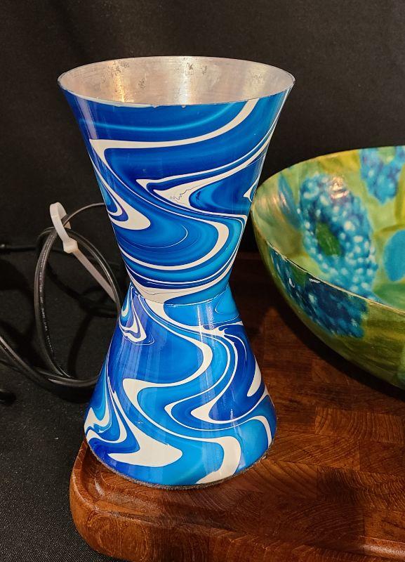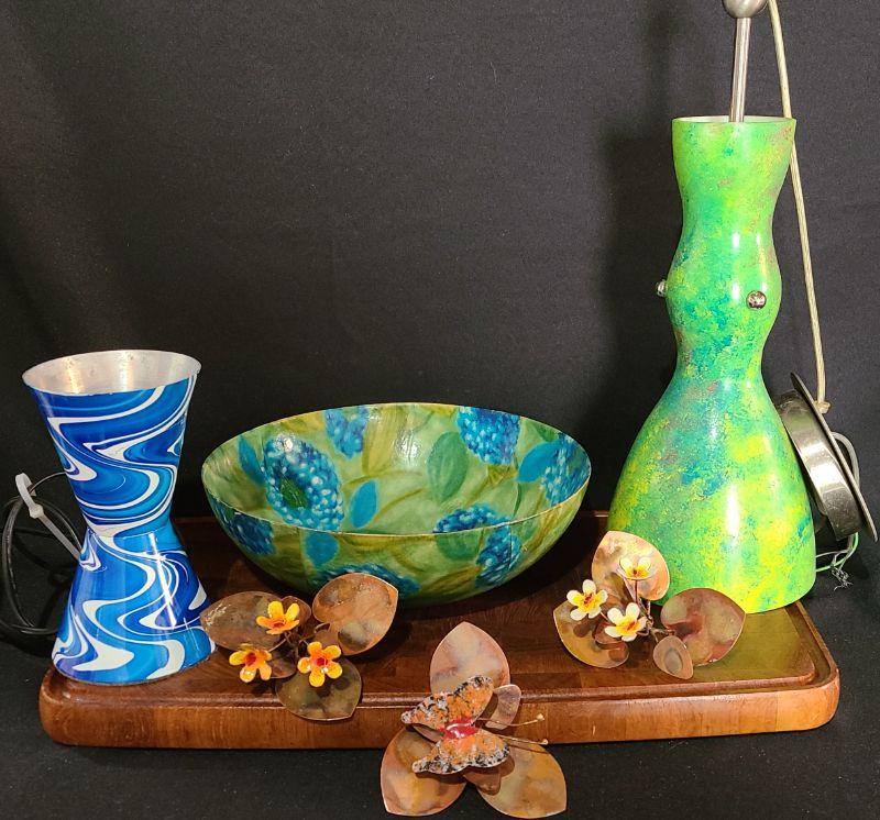 Nice lot of Mid Century decor: Pendant light for hookup, Large Floral Centerpiece Bowl, Copper/enamel flowers, Swirled blue uplight, and 19 inch Digsmed Danmark Cutting Board.