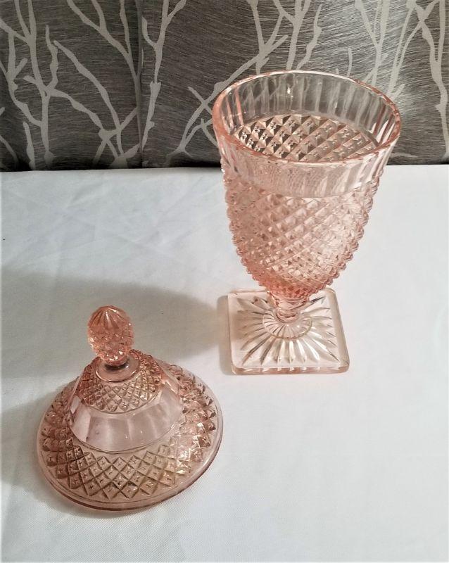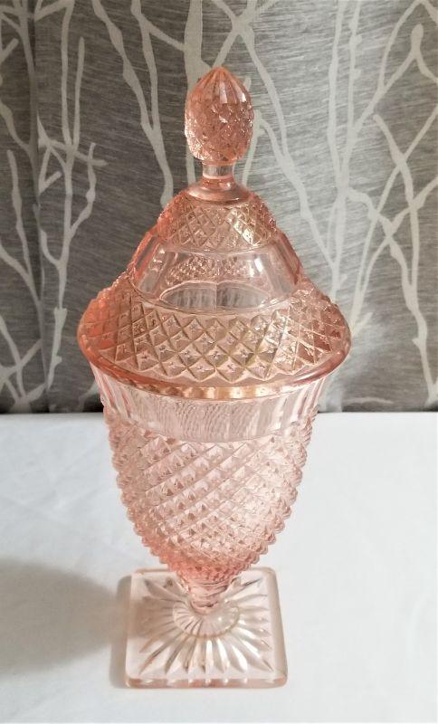 Vintage Miss American Depression Glass large compote (pink). Good condition. Measures 11" tall.