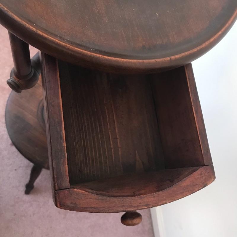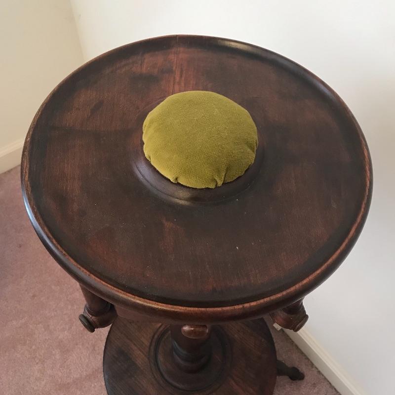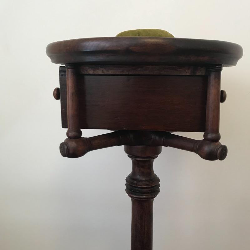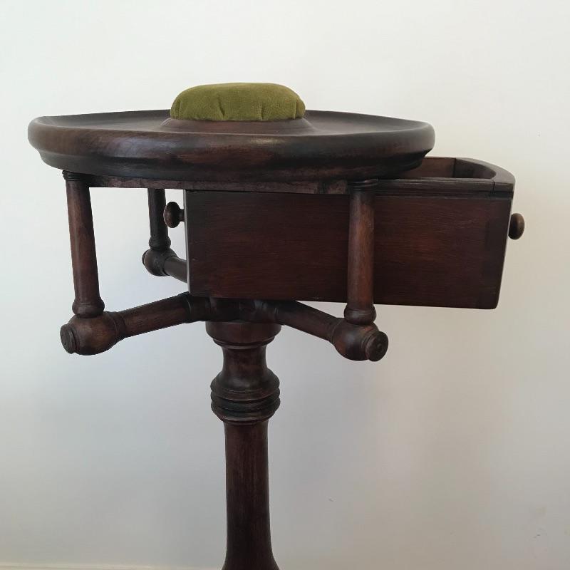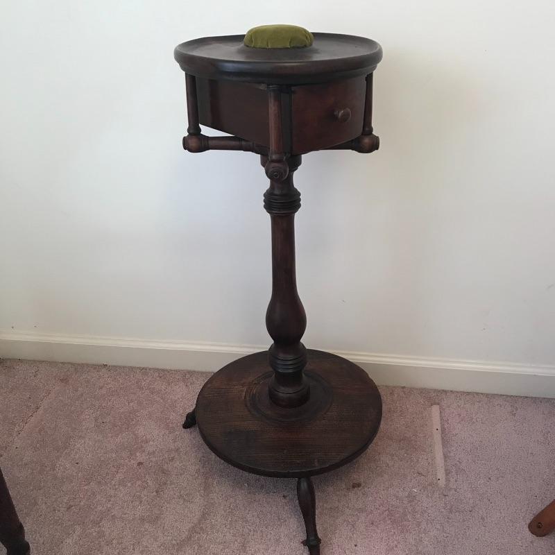Stunning piece is perfect working condition! With an olive green pin cushion and a single drawer that opens on both sides for multi-users. Wood is a gorgeous dark brown with hints of cherry. The bottom platform has a 14.5” diameter with legs that protrude a little further and piece stands approximately 31.25” tall. No shipping.